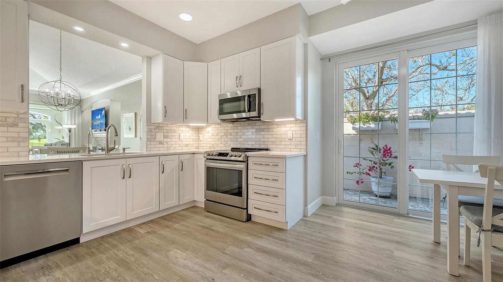 This beautiful villa sits at the end of a dead-end street, a few steps from the community pool and has stunning lake and golf course views. As you enter the walkway you are greeted by a gated entry gaining access to the front loggia that is accented with pavers and leads to your private entrance. The grand foyer is large and is the perfect space to display your art or family heirlooms. The kitchen has been professionally updated with stunning finishes and features high-end appliances. There is an office or den off the kitchen through dual pocket tiffany doors. The guest bedroom is spacious and provides a view to the front lanai. The living room and dining room provide for gracious living and entertaining allowing expansive views of the golf course and lake. Golf views are also from the primary suite with its large bathroom and walk-in closet. This home features high ceilings throughout, extensive levels of crown moldings, elegant features and finishes and is perfect for year-round living or as a wonderful getaway home for seasonal or frequent visitors.