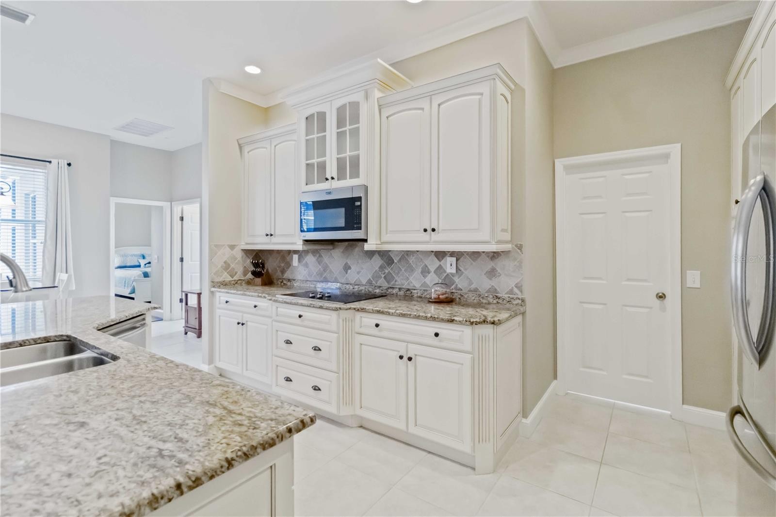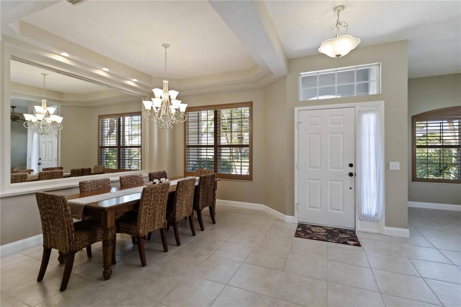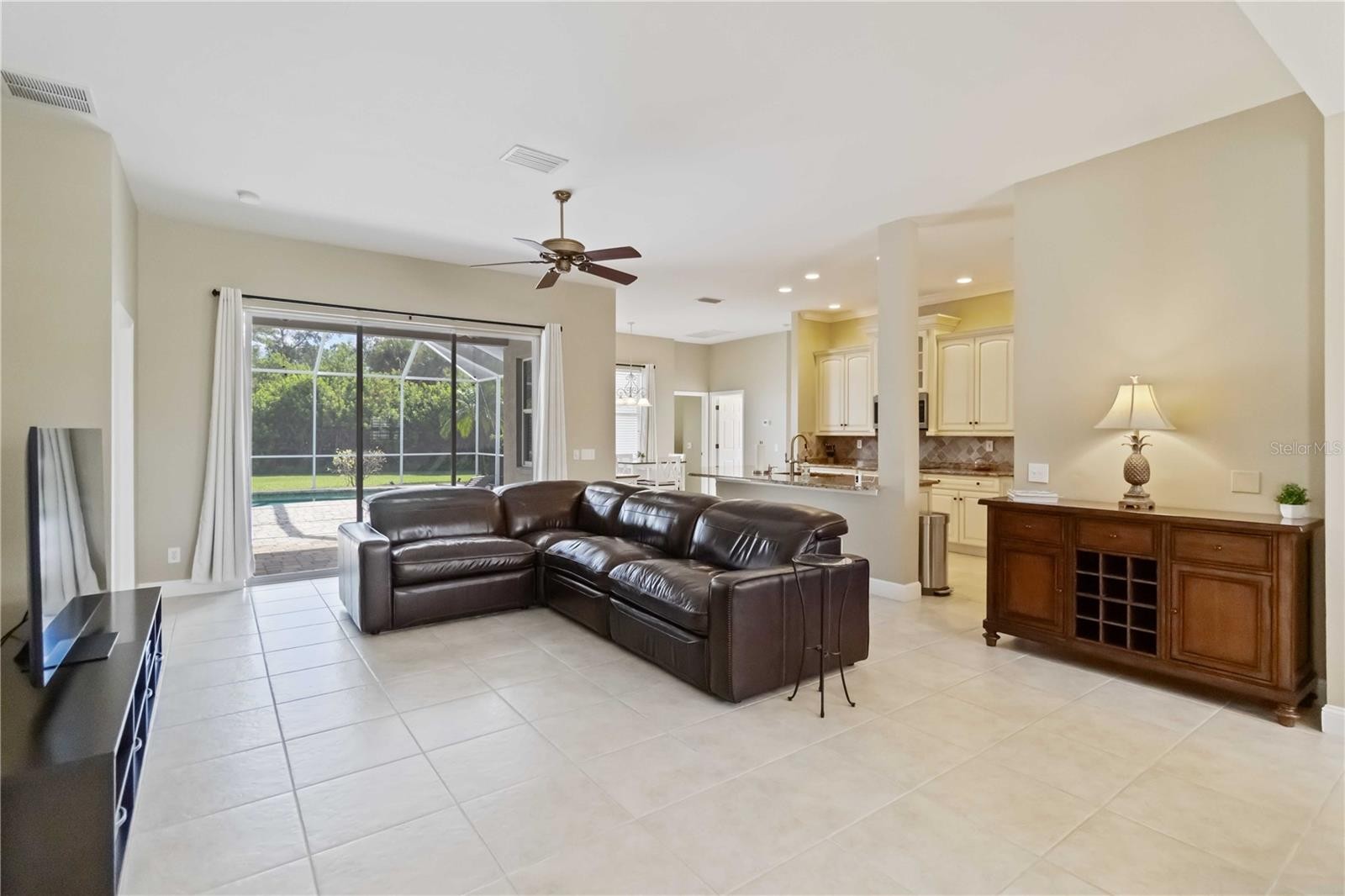 Nestled within a secure, gated community, this beautifully updated, 3-bedroom, 2-bathroom residence offers the perfect blend of luxury and tranquility. Enjoy the assurance of a brand-new roof, complete with a 20-year warranty, as well as a 7-year warranty on the exterior painting completed 10/10/2025. Interior wood shutters adorn the front windows, adding a touch of classic curb appeal. The moment you enter, you'll be greeted by an open and airy living space, with stylish tile flooring throughout the main areas that flows seamlessly into the elegant, formal dining area. Just off the dining room, a large sitting area provides an ideal spot for relaxation , entertaining or a home office. The heart of the home is the chef-inspired kitchen, boasting upgraded cabinetry, gleaming granite countertops, and a double oven. All appliances are included even the fridge in the garage ,making this home a truly turn-key. Bedrooms are finished with warm hardwood flooring, while seven ceiling fans throughout the home provide comfort and air circulation. Custom window treatments and curtains add a touch of sophistication. Step outside to your private maintenance free yard where a stunning oversized paver lanai and a refreshing pool create a true outdoor oasis for endless entertainment and relaxation. Most furnishings are also available for purchase, offering a seamless transition into your new home.