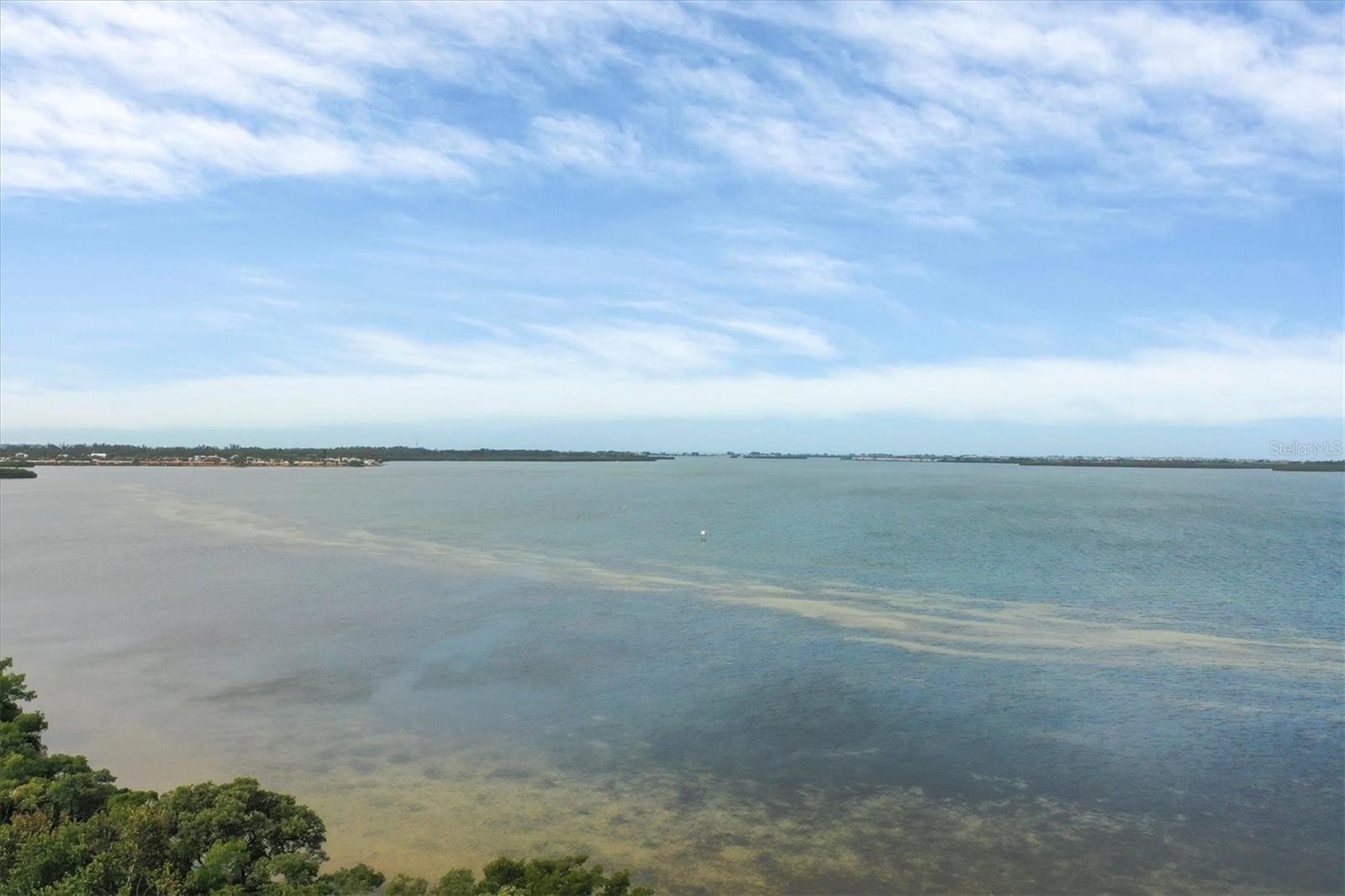 Welcome to Palma Sola Bay Club, an inviting coastal community where style and comfort meet the beauty of the bay. This top-floor residence offers sweeping views of Palma Sola Bay from every room, a backdrop that few homes can claim. A balcony extends the living area outdoors, ideal for morning coffee, evening cocktails, or just observing nature while enjoying the breeze. The kitchen features a large island and breakfast bar, perfect for casual dining or conversation while cooking dinner against the glow of the sunset. Inside, every detail has been thoughtfully chosen, from porcelain tile flooring throughout to custom valances and draperies that frame the view. High ceiling and 8-foot doors throughout with double doors opening to the primary suite, create a sense of arrival and understated grandeur. The suite includes an extended vanity in the bath and a custom-designed walk-in closet system. The split floor plan provides privacy, with a comfortable guest bedroom and full bath on the opposite side. An interior laundry room with upright freezer adds everyday convenience. Professionally decorated and offered turnkey furnished, the home is pristine and move-in ready. Two covered parking spaces and a private storage area are located beneath the building. Palma Sola Bay Club is a gated community offering a pool, clubhouse, bocce courts, putting green, dog park, and a sunset dock with kayak launch. A home where every day feels like a getaway, surrounded by comfort, elegance, and inspiring bay views.