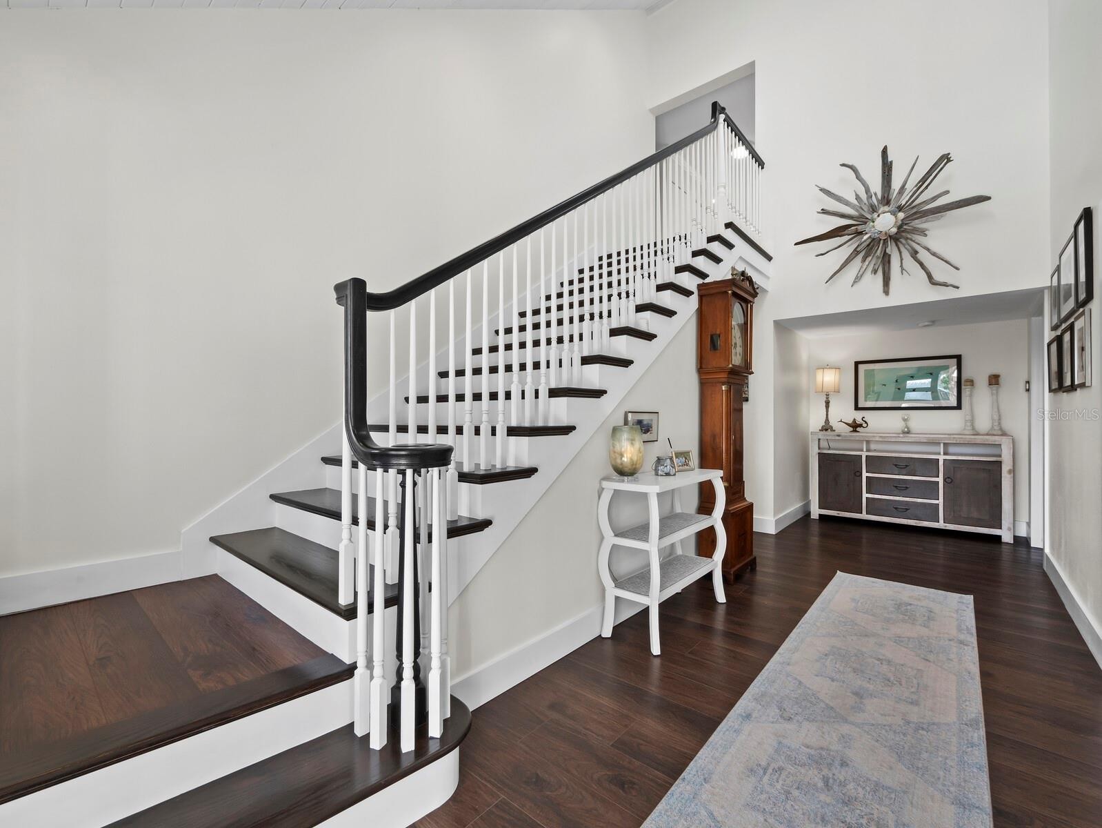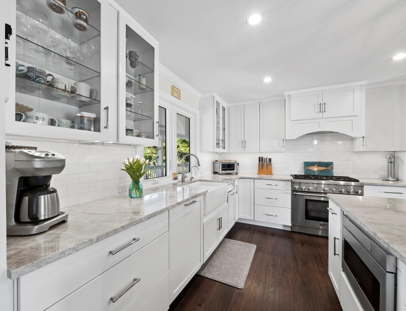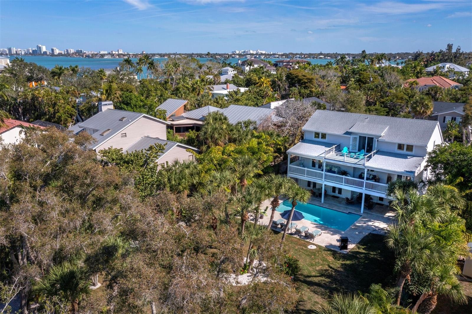 Welcome to Bay Island, ideally positioned on the north end of Siesta Key, where island living meets exceptional convenience. Just moments from Siesta Beach, Siesta Key Village, and downtown Sarasota’s waterfront dining and cultural offerings—with easy access on and off the island—this elevated Key West-style residence is set across a rare double lot, an uncommon offering on Siesta Key. Fully renovated in late 2019, the home features new siding, roof, electrical, plumbing, irrigation, hurricane-rated windows and French doors, and two HVAC systems. It has since been further enhanced with premium retractable invisible screens on all French doors, kitchen and bath refinements, and a whole-house water filtration system, along with additional upgrades that reflect its continued care and quality. The open-concept floor plan is filled with natural light, highlighted by vaulted ceilings, LVP flooring, and a natural gas fireplace. Multiple covered terraces extend the living space outdoors, reinforcing the home’s relaxed coastal design. The kitchen is designed for both everyday living and entertaining, centered around a large quartzite island with extensive drawer storage and pull-out shelving. A full Thermador appliance package includes a gas range, refrigerator and freezer columns, and dishwasher. Soft-close cabinetry and thoughtful storage solutions provide both function and efficiency. French doors open to an oversized covered deck overlooking mature tropical landscaping. The well-sized owner’s suite is located on the main living level and includes a walk-in closet and a private en-suite bathroom featuring a double vanity and large walk-in shower. A den on this level offers flexibility and can easily serve as a fourth bedroom or home office. Upstairs, two generously sized guest bedrooms share a newly appointed bathroom and enjoy access to a third-level terrace ideal for sunset views. Outdoor living sets this property apart. The double lot creates an expansive backyard with a recently resurfaced pool, travertine decking, and multiple covered terraces—an uncommon offering on Siesta Key. The additional lot provides flexibility for future enhancements while preserving privacy and open space.
