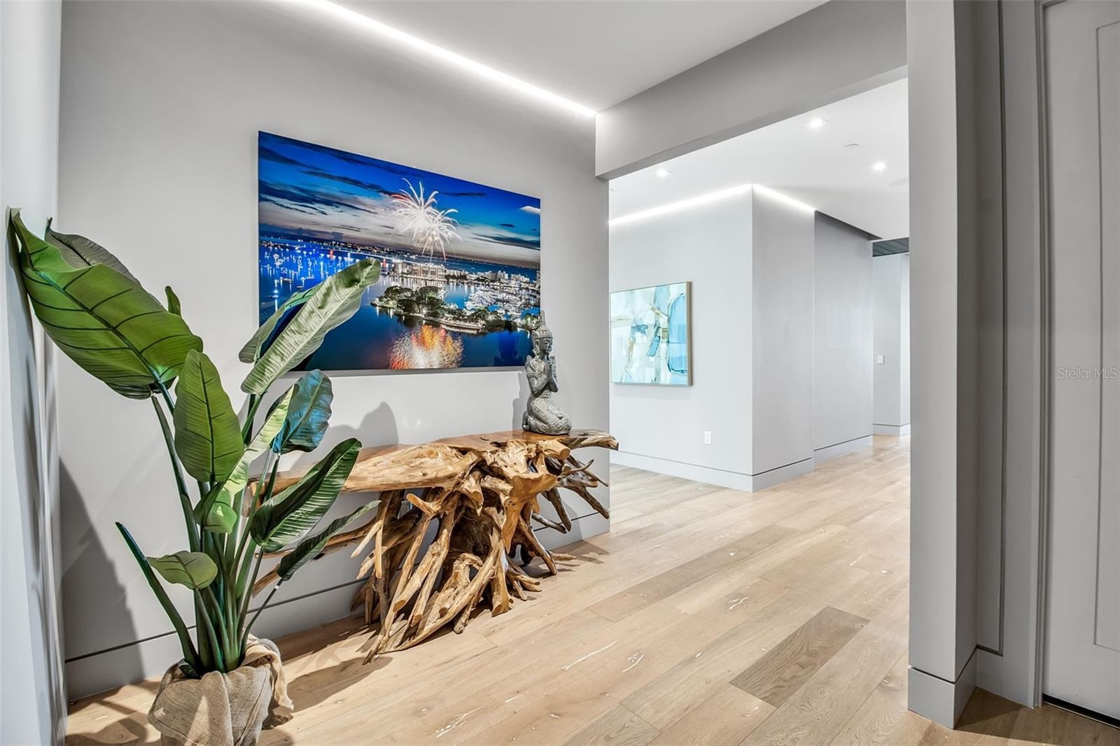 Arrive by private elevator directly to the grand foyer of this tenth-floor residence at the Ritz-Carlton Tower Residences, ideally positioned within the coveted ’05 stack—widely considered the premier vantage point in the building. This preferred orientation captures sweeping, unobstructed panoramas of Sarasota Bay and the Ritz-Carlton marina, complemented by spectacular west-facing sunsets. Artist-crafted glass double entry doors with custom illuminated accents provide a striking arrival and set a tone of understated elegance throughout. Residence #1005 offers a highly sought-after four-bedroom layout with four full baths, thoughtfully designed for both refined entertaining and everyday comfort. An open-concept floor plan is enhanced by wood flooring throughout and anchored by a centrally located kitchen featuring a breakfast bar, stainless-steel appliances, dual convection ovens, and an induction cooktop. Floor-to-ceiling, hurricane-rated windows flood the interior with natural light, while two expansive terraces extend the living space outdoors for effortless entertaining. A split-bedroom design ensures exceptional privacy for owners and guests. The primary suite is distinguished by a double-door entry and custom underlit accent shelving, an en-suite marble bath with dual split vanities, private water closet and custom-fitted walk-in closets. The fourth bedroom / study serves as a versatile retreat, highlighted by a gas fireplace framed by floor-to-ceiling built-in cabinetry and an adjacent full bath. A new HVAC system installed in 2025 adds comfort and peace of mind. The residence includes two assigned under-building parking spaces—one conveniently located near the side lobby entrance. Additionally, 2 climate-controlled storage units, one conveniently located just outside the residence. The pet-friendly Tower Residences offer the legendary Ritz-Carlton lifestyle, featuring dedicated private concierge service, a state-of-the-art fitness center, massage and wellness rooms, sauna, resort-style heated pool and spa, private theater, and beautifully appointed social and entertaining spaces. Recent enhancements include a reimagined lobby and entry experience, refreshed landscaping, and an inviting outdoor lounge with grilling facilities. Additional conveniences include 24-hour in-residence dining, a private interior corridor with direct access to the Ritz-Carlton Hotel’s amenities, restaurants, and spa, as well as valet parking for residents and guests. Perfectly positioned along Sarasota’s Bayfront and downtown corridor, with easy access to St. Armands Circle, Lido Beach, cultural attractions, and fine dining, this exceptional offering represents a rare opportunity to secure one of the most desirable residences within the Tower.