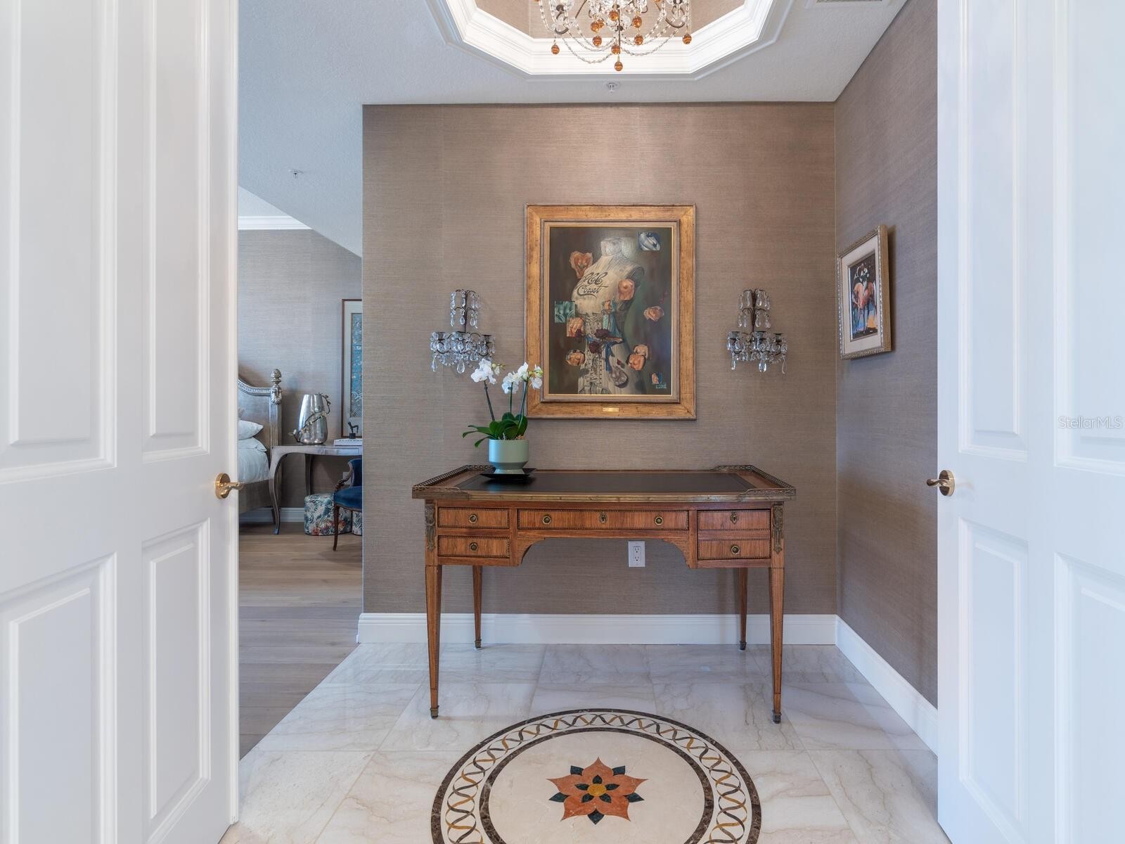 Welcome to refined Ritz-Carlton living on Sarasota Bay, where you can experience timeless elegance in this rare corner residence at The Ritz-Carlton Tower Building, and every detail has been thoughtfully reimagined for modern luxury. Positioned to capture sparkling bay waters and lively energy of Sarasota’s cityscape, this home offers luminous morning sunrises, breathtaking evening sunsets and a glittering skyline by night. Inside, expansive windows wrap the living spaces in natural light, while refined designer finishes create a serene and sophisticated backdrop. The chef’s kitchen is a centerpiece, with dramatic quartzite countertops, all-new Wolf and Sub-Zero appliances, and a custom bar ideal for entertaining. Custom built-ins throughout elevate form and function. With two spacious bedrooms plus an additional bedroom set up as an office, three full baths, and multiple terraces, including an oversized patio ideal for alfresco dining with water views, this residence blends comfort and elegance at every turn. Private elevator entry, premium finishes, exquisite wall coverings, and thoughtful design selections further enhance the sense of ease and refinement. Life at The Ritz-Carlton extends far beyond the residence. The building has been recently refreshed with a newly reimagined lobby and enhanced by commercial flood protection for peace of mind. From the convenience of valet and concierge service to world-class amenities, every element ensures a lifestyle defined by security, sophistication and the legendary Ritz-Carlton standard of excellence. This is more than a home, it is a rare opportunity to embrace the best of waterfront serenity and cosmopolitan energy, with the prestige of Ritz-Carlton living.