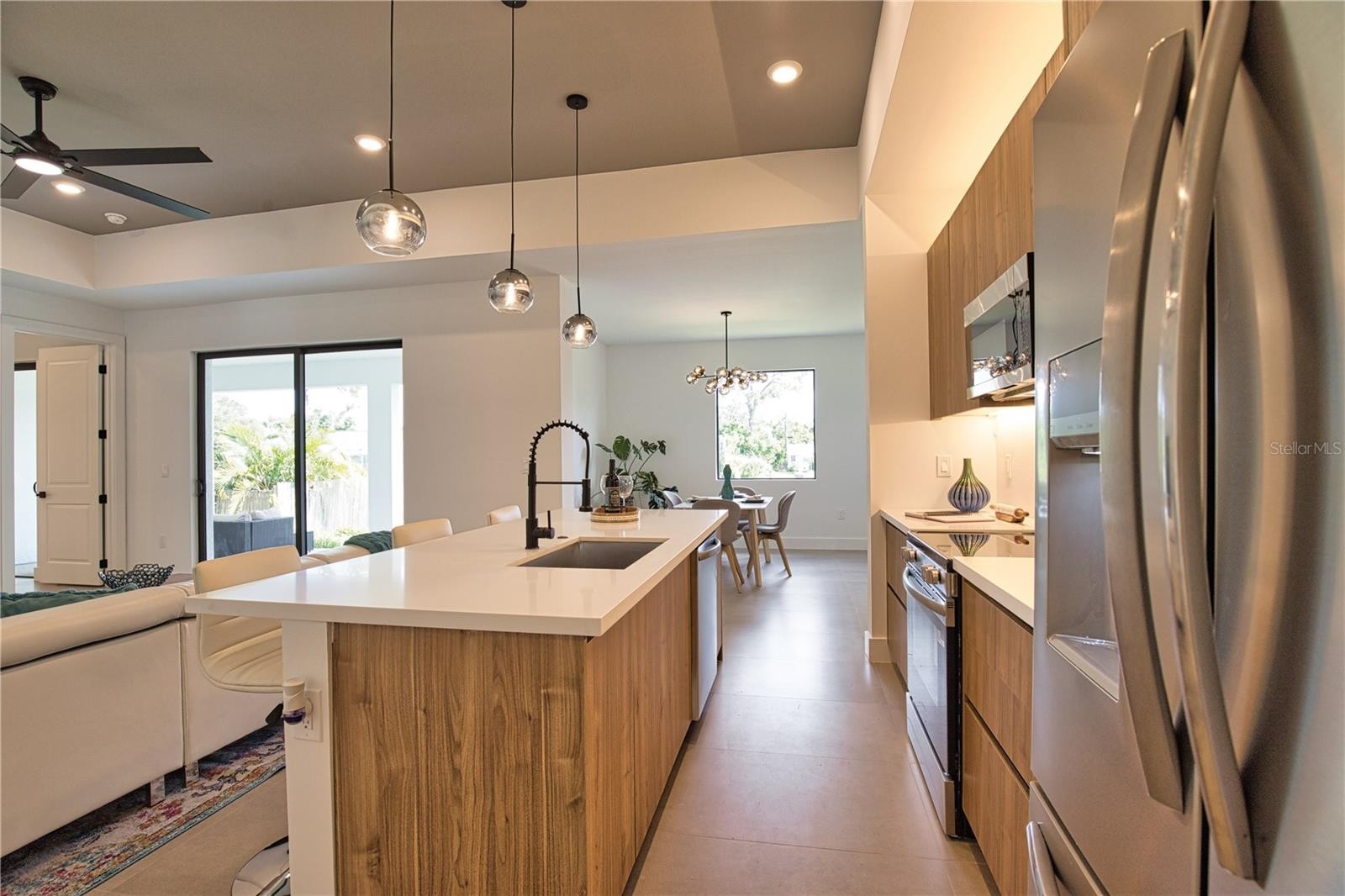 This GREAT VALUE, new-construction 4/2 home provides a modern and peaceful living space in the thriving community of Venice. The NO HOA, NO FLOOD ZONE, 1 YEAR BUILDER'S WARRANTY and LOCATION make this home a real find! As a SOUTH VENICE resident, you can take advantage of the SOUTH VENICE BEACH FERRY, transporting you to your own PRIVATE BEACH on Manasota Key and gain access to the resident BOAT LAUNCH. This serene neighborhood is close to many unique activities such as several nature parks, Legacy Trail, Historic Downtown Venice, Warm Mineral Springs, Venice Fishing Pier and is a 6 minute drive to Manasota Beach, a 15 minute drive Venice beach! The 4th bedroom gives the flexibility of use for an office, gym or craft room to suit your needs. The home's exterior is welcoming and stylish with modern lighting and landscaping along with the peace of mind of hurricane impact windows and a high elevation. The open floor plan allows you to enjoy the main living areas simultaneously. The living room, dining area, and kitchen flow together perfectly, providing the ideal space for entertaining or family gatherings. The high tray ceiling, ceiling fan and large windows flood the main area with natural light and create a cheerful and inviting atmosphere. The neutral color palate allows you to add your personal touches and customize your look. The heart of this home is the sleek, modern kitchen. The quartz countertop and breakfast bar are perfect for casual dining and gathering. Soft close cabinets with gola profile and drawers with a modern, stylish and clean look. Stainless steel appliances, ample cabinet storage space and pantry complete the wish list for a perfect kitchen. The spacious dining area is designed for serving family meals or entertaining and includes a beautiful chandelier that contributes to this home's unique charm. Sliding glass doors provide access to the large covered porch off the main living area creating a seamless transition from indoor to outdoor living space. The master suite is a TRANQUIL RETREAT elevated by gorgeous tray ceiling, ceiling fan and sliding door to back yard. The en-suite bathroom feels like a PRIVATE SPA with a gorgeous OVERSIZED SHOWER, rain shower head, upgraded LED mirrors and soft LED lighting under the vanity to provide you a peaceful haven. 3 additional bedrooms with ample closet space and ceiling fans share a well-designed bathroom with a tub and the same upgraded rain shower head, LED mirrors and LED lighting. Laundry will be less of a chore in this spacious and neat laundry room featuring a convenient utility sink with cabinet. The 2 car garage conveniently leads to the laundry room for the perfect transition upon your arrival home. This property is staged and easy to show! It's features, proximity to beaches, S Venice resident perks and unique outdoor/shopping activities make this house the ideal place to call home.