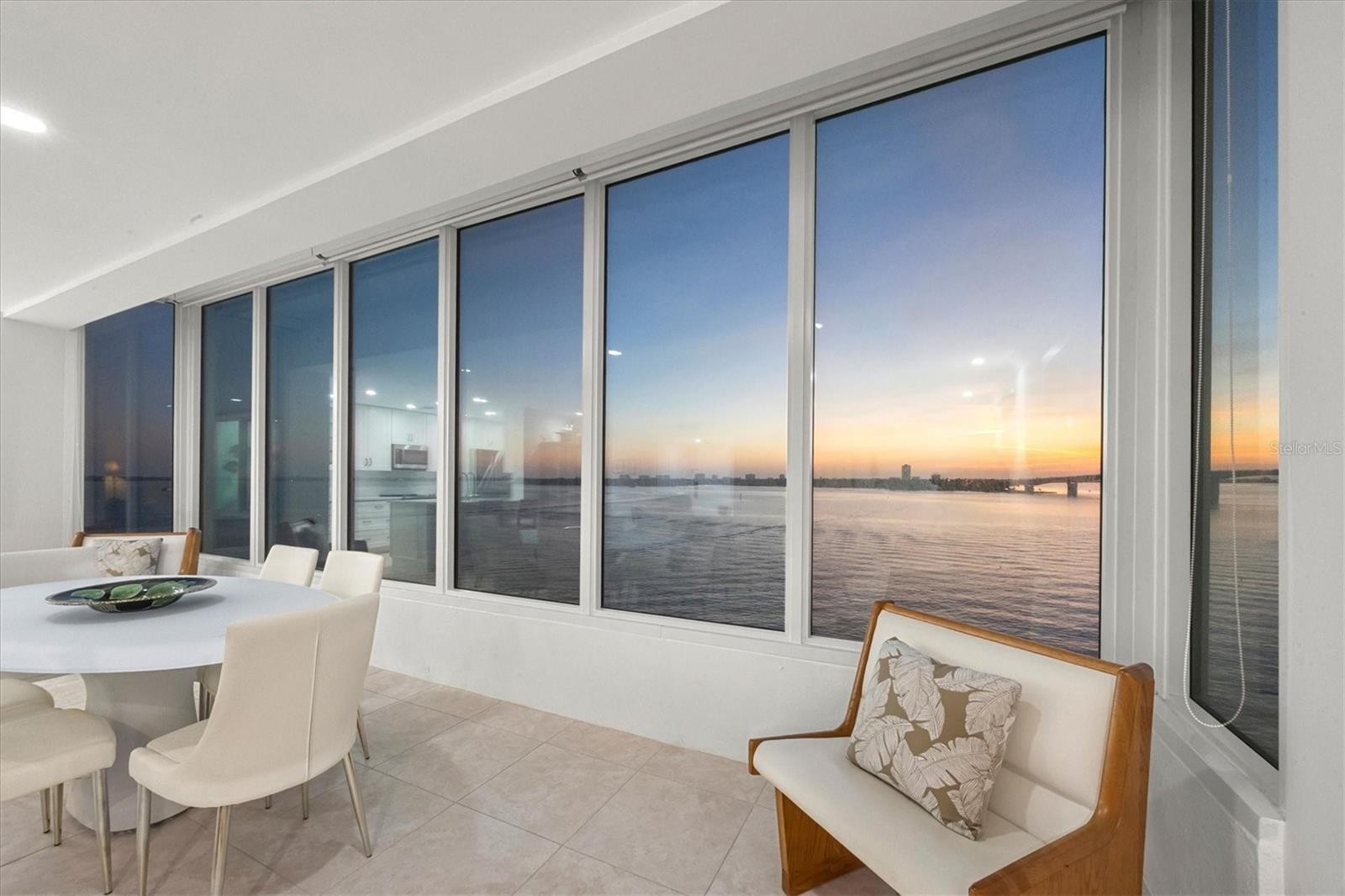 The first thing you notice is the view: a full sweep of Sarasota Bay through a wall of windows that defines the main living space. Natural light fills the open living and dining areas, where the water, the John Ringling Bridge, and the downtown skyline sit in clear, uninterrupted sight. A sizeable, light-filled great room anchors the floor plan, offering generous space for living, dining, and relaxing. The kitchen is designed for function and ease, with quartz countertops, white soft-close cabinetry, glass-front display cabinets, and stainless-steel appliances. A peninsula with bar seating connects the kitchen to the main living area, and a built-in desk overlooks the bay as an ideal workspace or breakfast bar with a true waterfront backdrop. The primary suite continues the same water-facing views, offering a wide picture window, recessed lighting, and an en-suite bath with a dual-sink vanity, quartz countertops, tall storage cabinetry, and a seamless-glass walk-in shower. The guest bedroom offers bay views as well, and a second full bathroom features an updated vanity and walk-in shower. Tile flooring runs throughout, maintaining a cohesive flow from room to room. Bay Point Apartments offers a relaxed waterfront lifestyle with a community pool, outdoor lounging space, and a day dock for fishing, launching kayaks, or welcoming friends arriving by boat. Located on quiet Golden Gate Point, the building is minutes to downtown Sarasota, St. Armands Circle, and Lido Beach.