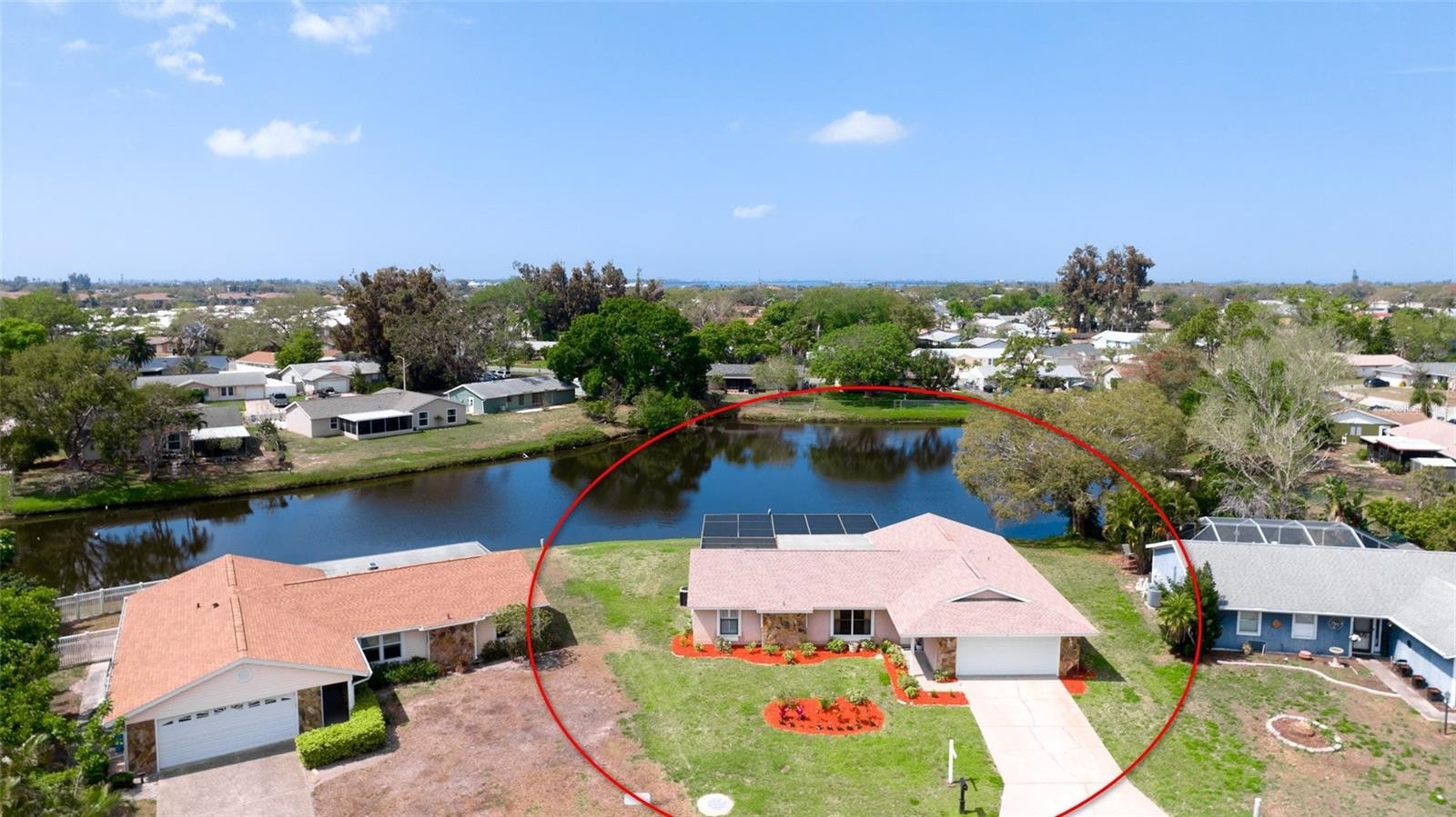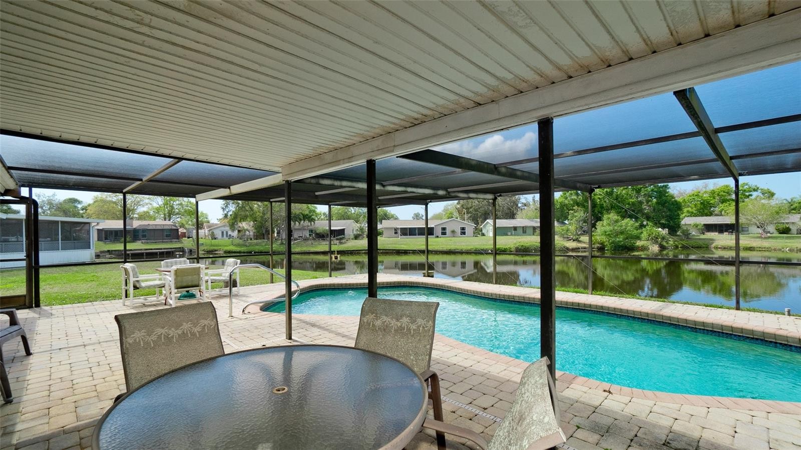 Welcome to Cordova Lakes. This central west Bradenton neighborhood is located in close proximity to grocery stores, restaurants, shopping, medical resources, private and public schools. Located just a short drive away are the beaches of Anna Maria Island and Robinson's Preserve park. This home is a 3 bedroom, 2 bathroom, 2 car garage with caged heated swimming pool that sits on a lake front lot. Some notable updates include a 2023 roof, new storm door, Hurricane rated garage, and front door. Clear Hurricane shutters for all windows. The home has 2 sliding glass doors off the dining and family room that open out to the caged pool area. The pool area has been updated with brick pavers and has a covered dining area that is perfect for getting out of the sun or to catch a gorgeous Florida sunset.