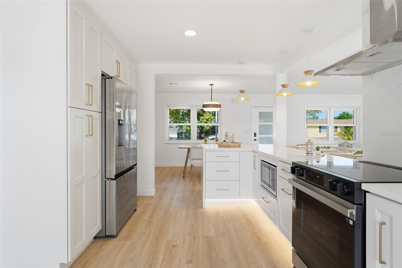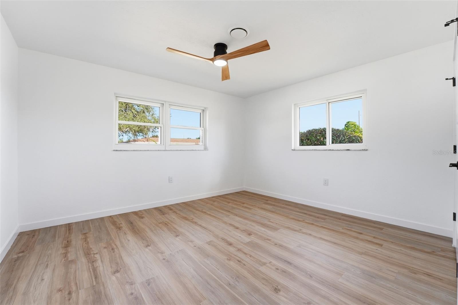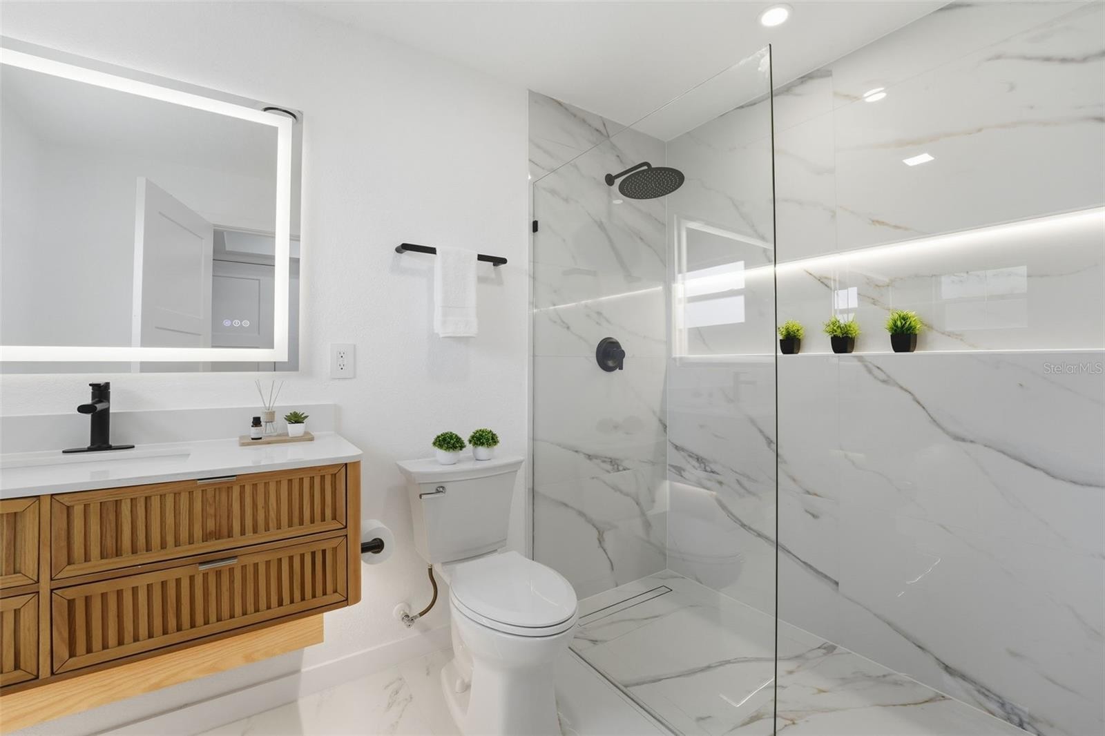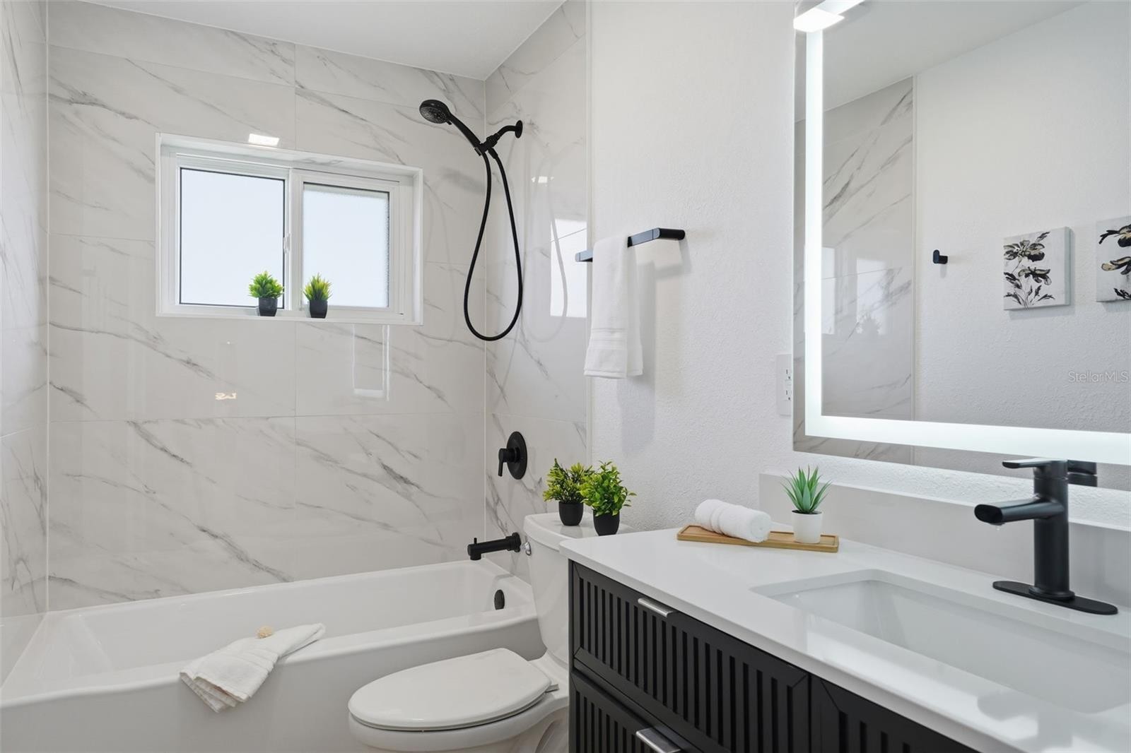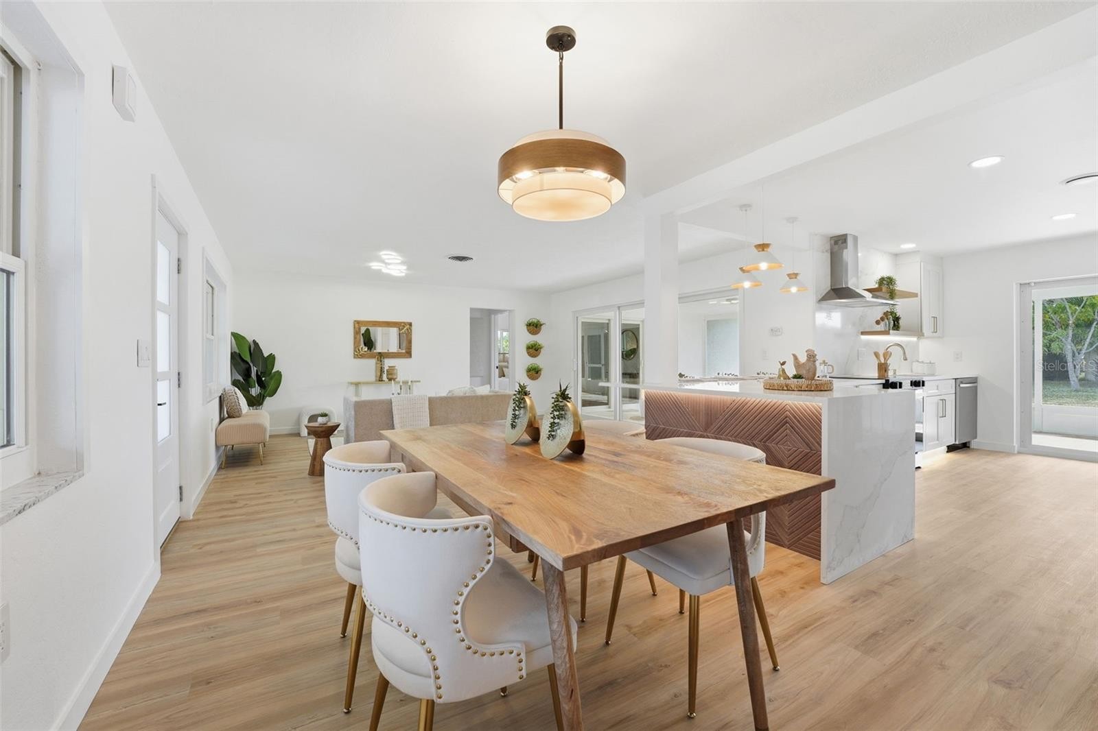 Welcome to this meticulously renovated home. Upon entry, the custom high-end finishes and contemporary lighting immediately distinguish the space. The bright, brand- new kitchen is appointed with premium quartz countertops extending along the backsplash and up to the ceiling, ambient undercounter lighting, a functional island, and new stainless-steel appliances. Both bathrooms have been thoughtfully designed to evoke a spa-like atmosphere, balancing style and practicality. The spacious ensuite bathroom features a 6 ft by 3 ft shower with impressive custom, large format tile work. Expansive patio sliders in the living room, primary bedroom, and kitchen provide seamless access to the enclosed lanai, enhancing the indoor-outdoor living experience. The versatile bonus room offers options for creative pursuits, projects, a playroom, or additional guest accommodations. A new washer and dryer are conveniently concealed within the room. Luxury vinyl plank flooring provides both aesthetic appeal and durability throughout. Major systems—including the AC system, electric panel, hot water tank, and energy- efficient hurricane impact windows and patio doors—have been updated in recent years. Coupled with solid concrete block construction, these improvements assure lasting quality and no major expenses for years to come. Situated in Flood Zone X, flood insurance is not required. The property benefits from public water and sewer service. Located in a quiet, welcoming neighborhood just minutes from downtown Sarasota and Siesta Key, this home offers an exceptional central location. Don’t miss the opportunity to make this beautifully updated Sarasota retreat your new home—schedule your private showing today and experience the perfect blend of comfort, style, and location for yourself.