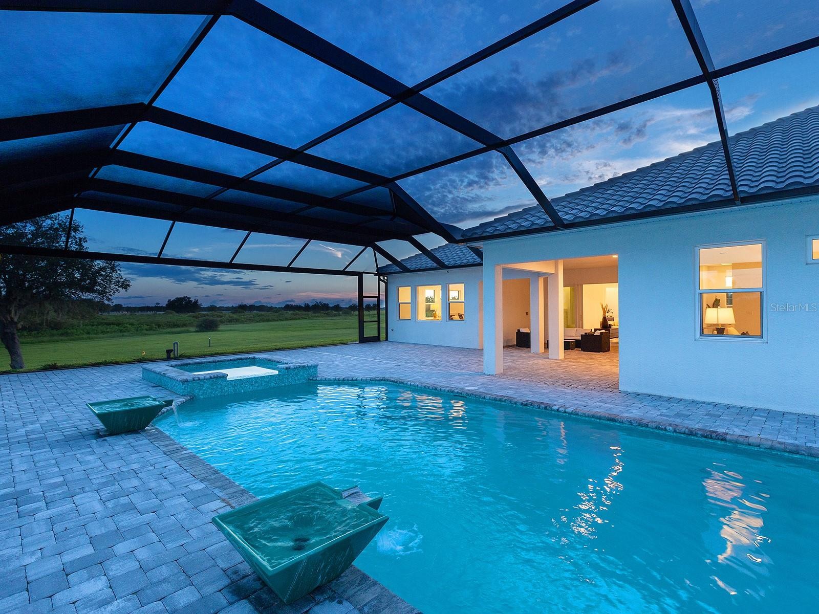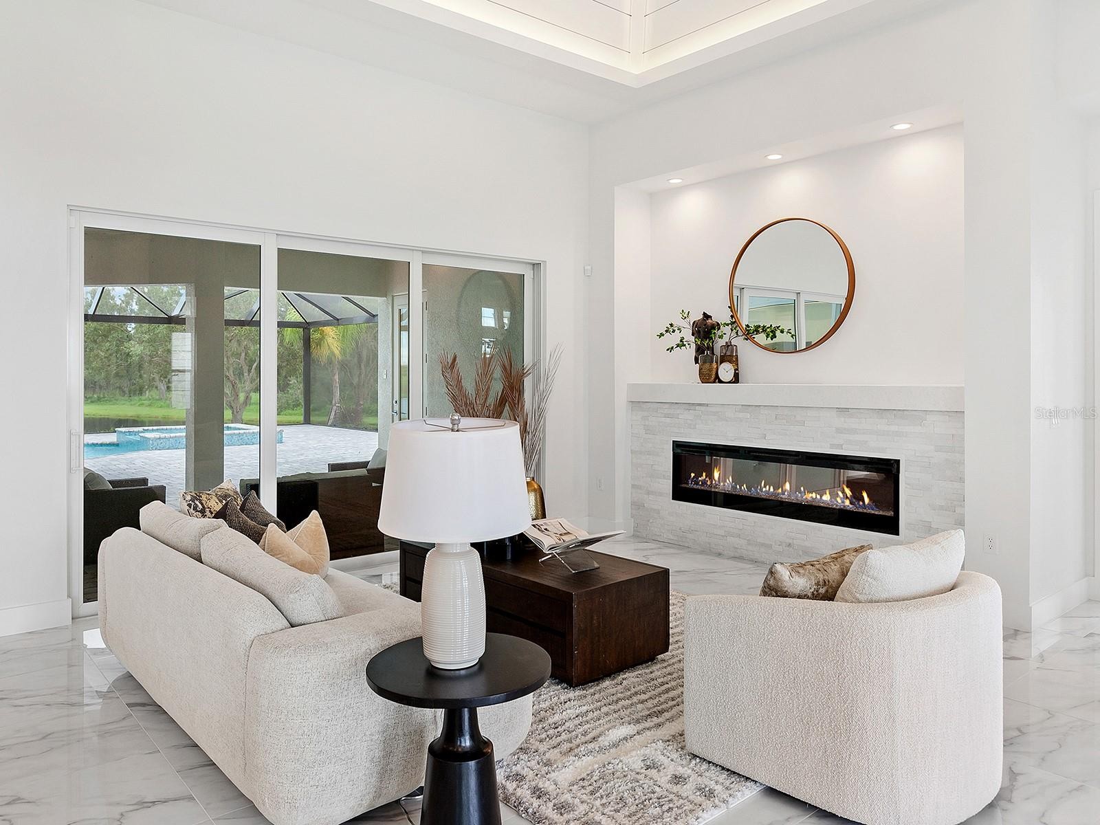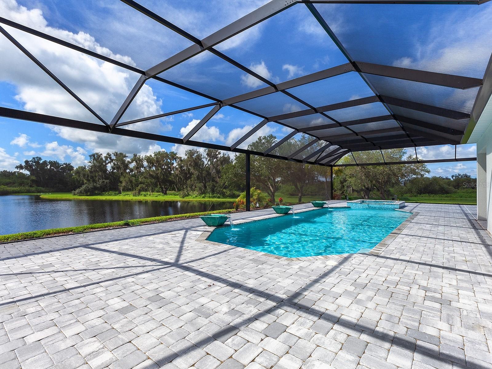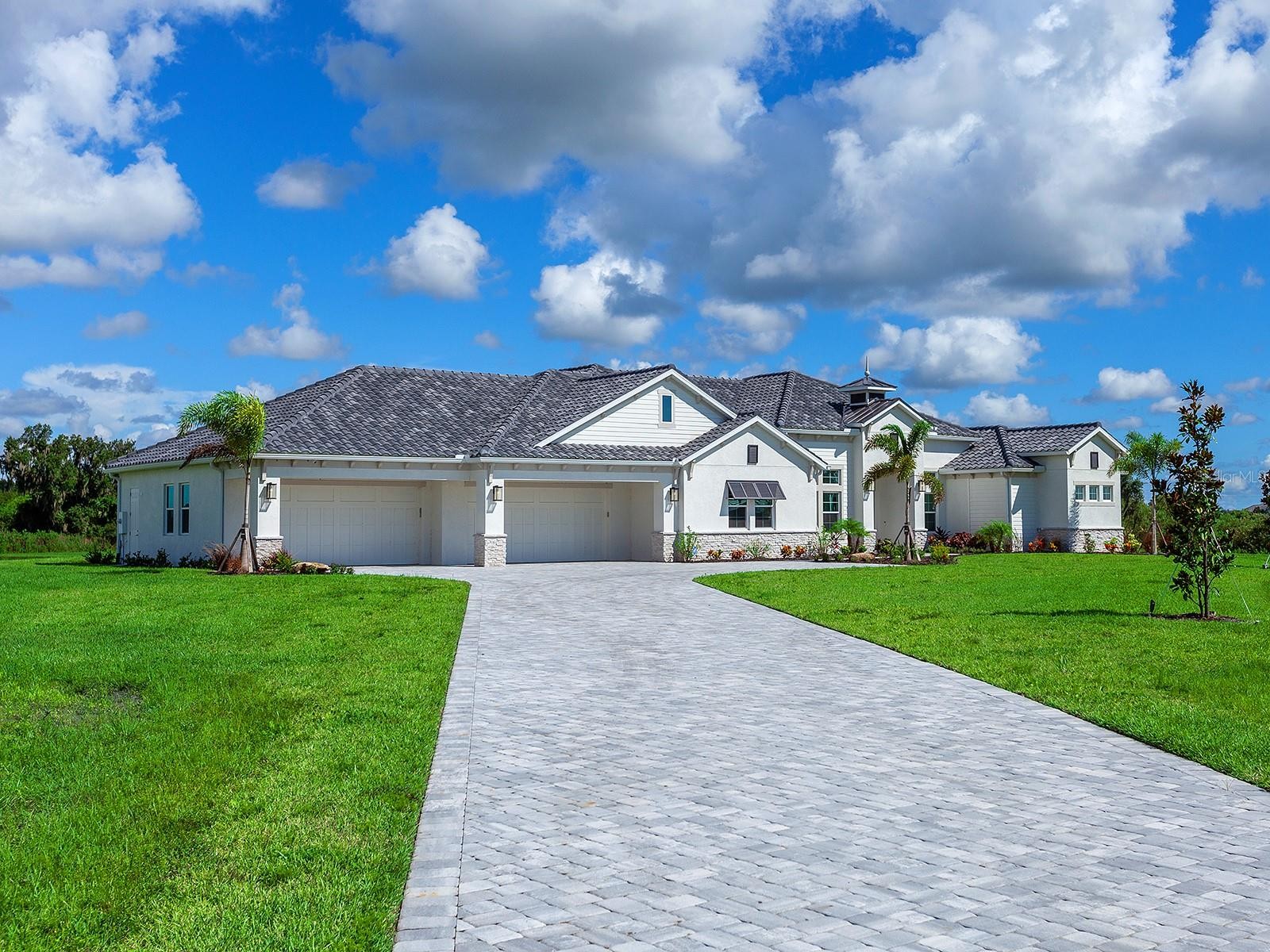 PRICE IMPROVEMENT - Loaded with over $800,000 in upgrades and designer options, this newly constructed estate at 3582 Recurve Circle sets a new standard for luxury living in Hampton Lakes. Set on a private 12-acre lot within a secure gated community, this stunning residence combines modern sophistication, exceptional craftsmanship, and serene lake views—all without the need for flood insurance. A grand paver driveway leads to an oversized six-car garage, perfect for the car enthusiast or collector. As you enter through the light-filled foyer with soaring ceilings and tall windows, you’re immediately greeted by breathtaking views and an atmosphere of elegance and calm. The expansive great room is the centerpiece of the home, featuring a stone-accented electric fireplace, custom wet bar, and walls of sliding glass doors that open to panoramic lake vistas. The outdoor living area is designed for entertaining, complete with a panoramic screen, self-cleaning saltwater heated pool and spa, and spacious covered lanai for dining or relaxing in total privacy. The gourmet kitchen is a true showpiece, boasting thick Cambria quartz countertops, induction cooktop, under-counter microwave, warming drawer, and adjoining butler’s pantry/wet bar with seating and a beverage cooler—perfect for both everyday living and hosting. The primary suite is a luxurious retreat with a spa-inspired bath featuring a jetted tub, large walk-in shower, and dual vanities. The impressive 15' x 18' custom closet includes built-ins and cabinetry, while a morning bar with beverage cooler adds an extra touch of comfort and convenience. Each of the three guest en suites offers generous space, walk-in closets, and private baths for complete privacy. A den/office with French doors provides a quiet setting for work or reading. Modern elegance flows throughout the home, with large-format porcelain tile, impact-rated windows and doors, high-volume tray ceilings with accent lighting, and designer details at every turn. Located just five miles from Waterside Place and Lakewood Ranch, with easy access to downtown Sarasota, this exceptional estate offers the perfect blend of refined country living and contemporary luxury. Experience sophisticated living at its finest at 3582 Recurve Circle in Hampton Lakes. GREAT VALUE AND PRICED BELOW REPRODUCTION.