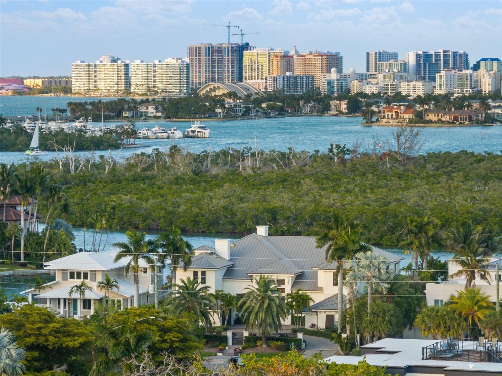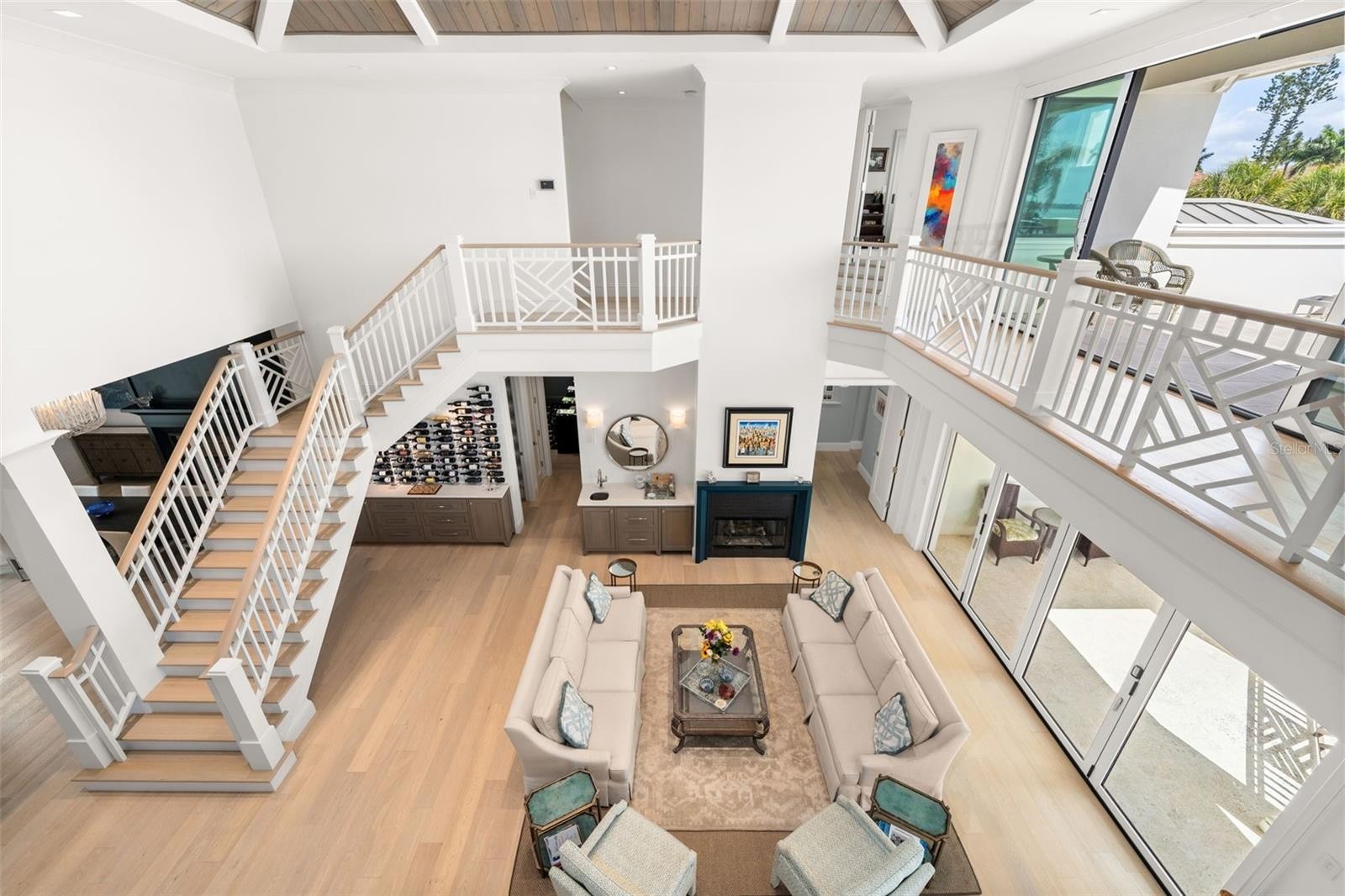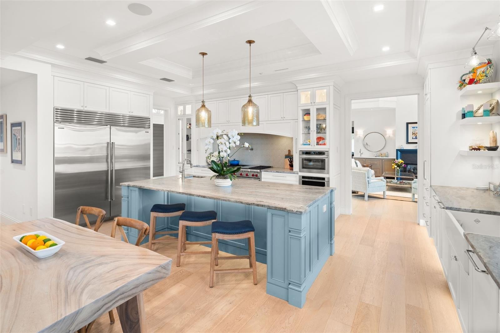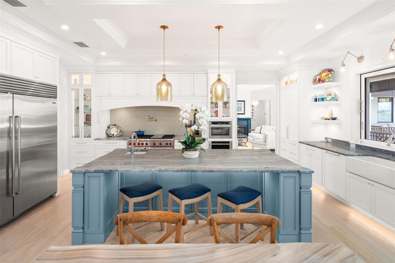 A stunning, fully reimagined coastal residence where elevated design meets modern functionality. Rebuilt to the studs and thoughtfully curated throughout, this expansive home showcases exceptional craftsmanship, custom finishes, and seamless indoor-outdoor living—all in a premier location just moments from the pristine Gulf beaches and the world-class shopping and dining of St. Armands Circle. Inside, light-filled interiors feature level 5 smooth walls, engineered hardwood floors, custom coffered ceilings, and extensive crown molding. The main living areas are anchored by two striking gas fireplaces with imported designer tile, while bifold and accordion glass doors open to expansive terraces, creating effortless flow for entertaining. The chef’s kitchen is a true showpiece with leathered granite countertops, a large island with bar seating, and top-tier appliances including a Wolf 6-burner gas range, Sub-Zero refrigerator, Miele built-in coffee system, dual dishwashers, and JennAir convection/steam oven. Custom cabinetry and a walk-in pantry complete the space. Designed for both relaxation and entertaining, the home features a private movie theater with Sony projection, B&W surround sound, and Octane seating, along with a game room, multiple office spaces, wet bar, and a 72-bottle wine display. The primary suite offers a private retreat with terrace access, tray ceiling, and a spa-like bath with marble floors, soaking tub, dual vanities, and a walk-in shower. Upstairs bedrooms feature ensuite or Jack-and-Jill baths. Smart features include electric shades, Sonos audio & Lutron Homeworks, central vacuum, and elevator access. Outdoor living shines with a resort-style saltwater pool and spa, waterfall, sun shelf, and integrated audio. The main terrace includes a gas grill, beverage fridge, beer tap, and firepit, with additional upper-level terraces & spectacular water views from every level. Boaters will appreciate the private dock with a 10,000 lb lift, dual jet ski lifts, and the rare ability to accommodate a 64-foot yacht. Additional highlights include impact windows and doors, Tesla charger, epoxy garage floors, and tankless water heaters. This exceptional property blends luxury, technology, and coastal living just moments from the best of Sarasota.