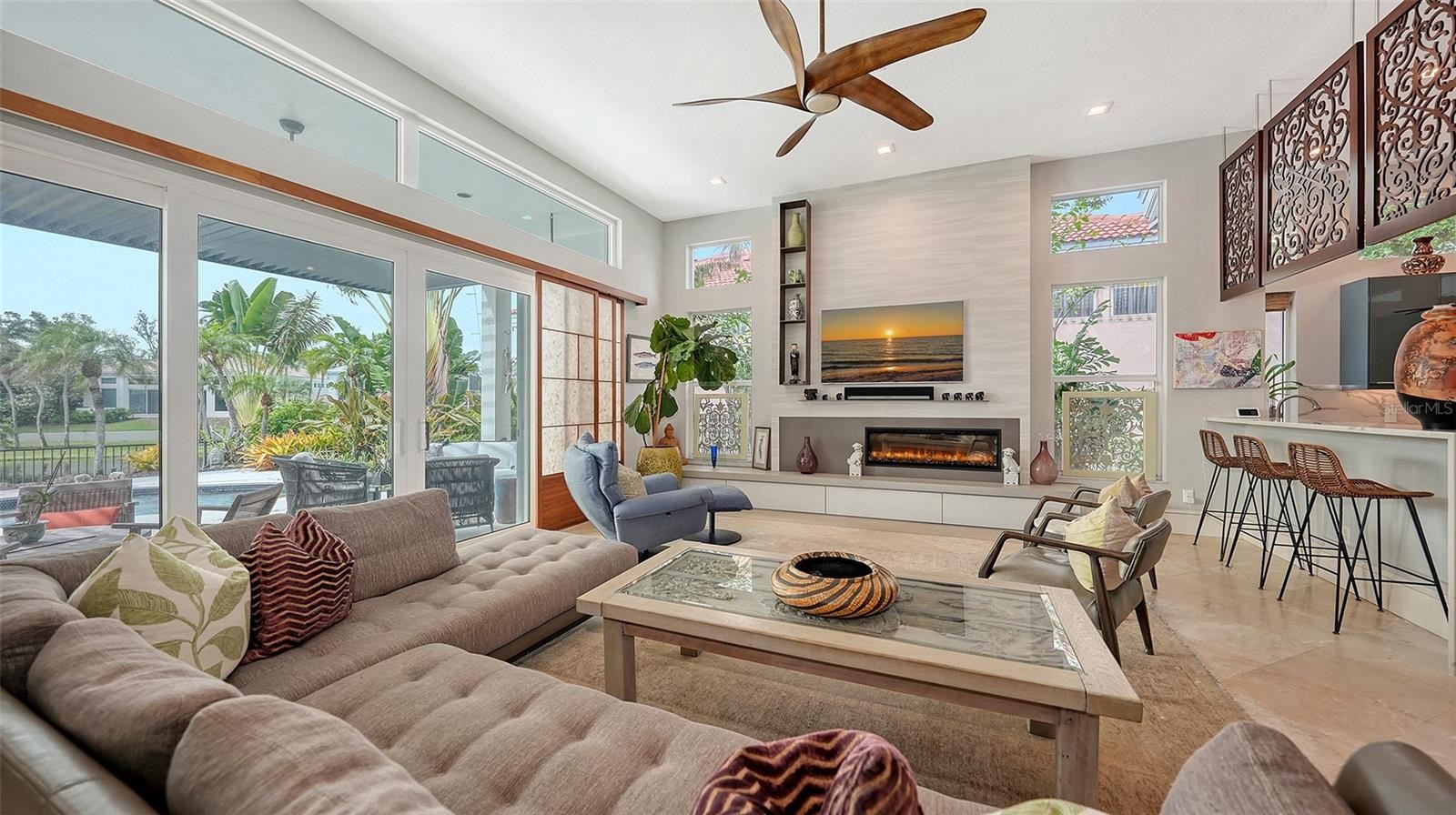 Under contract-accepting backup offers. Welcome to an extraordinary transformation where sophisticated artistry meets modern urban luxury, elevating the serene prestige of Queens Harbour on Longboat Key. This impeccably reimagined 3-bedroom, 2-bath residence offers rare ambiance and refinement, seamlessly merging interior elegance with outdoor serenity. Custom shoji doors envelop hurricane-impact sliders, creating a glowing, intimate setting—perfect for alfresco evenings or savoring the sculptural stone fireplace within the great room. Soaring ceilings and curated niches showcase fine art and architectural detail, infusing the home with stylish warmth. Creamy textures—from hand-selected travertine underfoot to cascading quartz waterfall countertops—form a soothing, sophisticated backdrop. The chef-inspired kitchen is both beautiful and highly functional. An exotic wood island, hammered copper sink, and premium DCS stainless gas cooktop with built-in ovens evoke culinary artistry. Designer lighting illuminates the quartz surfaces, while the chic breakfast area—with its bespoke wall print—suggests an upscale Manhattan suite. Fisher & Paykel dishwasher drawers elevate entertaining, and the expansive breakfast bar invites guests to gather in effortless style. The voluminous open plan flows to a formal dining room ideal for gracious hosting, all connected to the great room and tranquil Zen garden beyond. Oversized sliders dissolve the boundary between indoors and the lush backyard oasis, framing the serene pool like a living painting. The owners’ suite is a sanctuary with generous proportions, a walk-in closet, a peaceful lounge/workspace, and private pool access overlooking the gentle pond. The primary bath is a masterpiece— boasting refined finishes, and a two-person walk-in shower enclosed in seamless glass, and generous soaking tub creating a spa-like haven. The second ensuite bedroom is bathed in sunlight from a sweeping wall of windows and offers private bath access. Luxurious quartz, tile, and high-end fixtures provide understated refinement, with a spacious closet and nearby linen storage for guests. The third bedroom/den, currently styled as a chic office, easily converts to a guest suite. Custom built-ins set a sophisticated tone—ideal for unwinding after days at the nearby beaches. From its intricately carved double doors to its elevated fixtures and finishes, this home radiates warmth, craftsmanship, and refined coastal luxury. A complete 2018 renovation ensures comfort and peace of mind—move right in and begin living the easy, distinguished lifestyle that defines Queens Harbour and Longboat Key. Residents enjoy access to the Bay Isles Beach Club with BBQs, volleyball, covered pavilions, a private kitchen, and storage—perfect for sunset gatherings. Optional memberships at the renowned Longboat Key Club offer premier pickleball, tennis, 45 holes of championship golf, a deep-water marina, fine dining, spa, fitness center, and 10 miles of white-sand beach. Come live the dream.