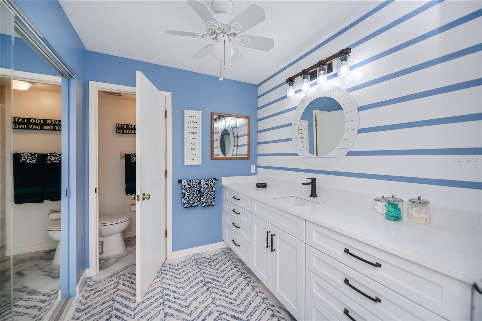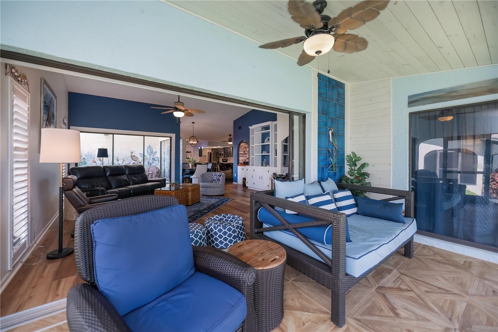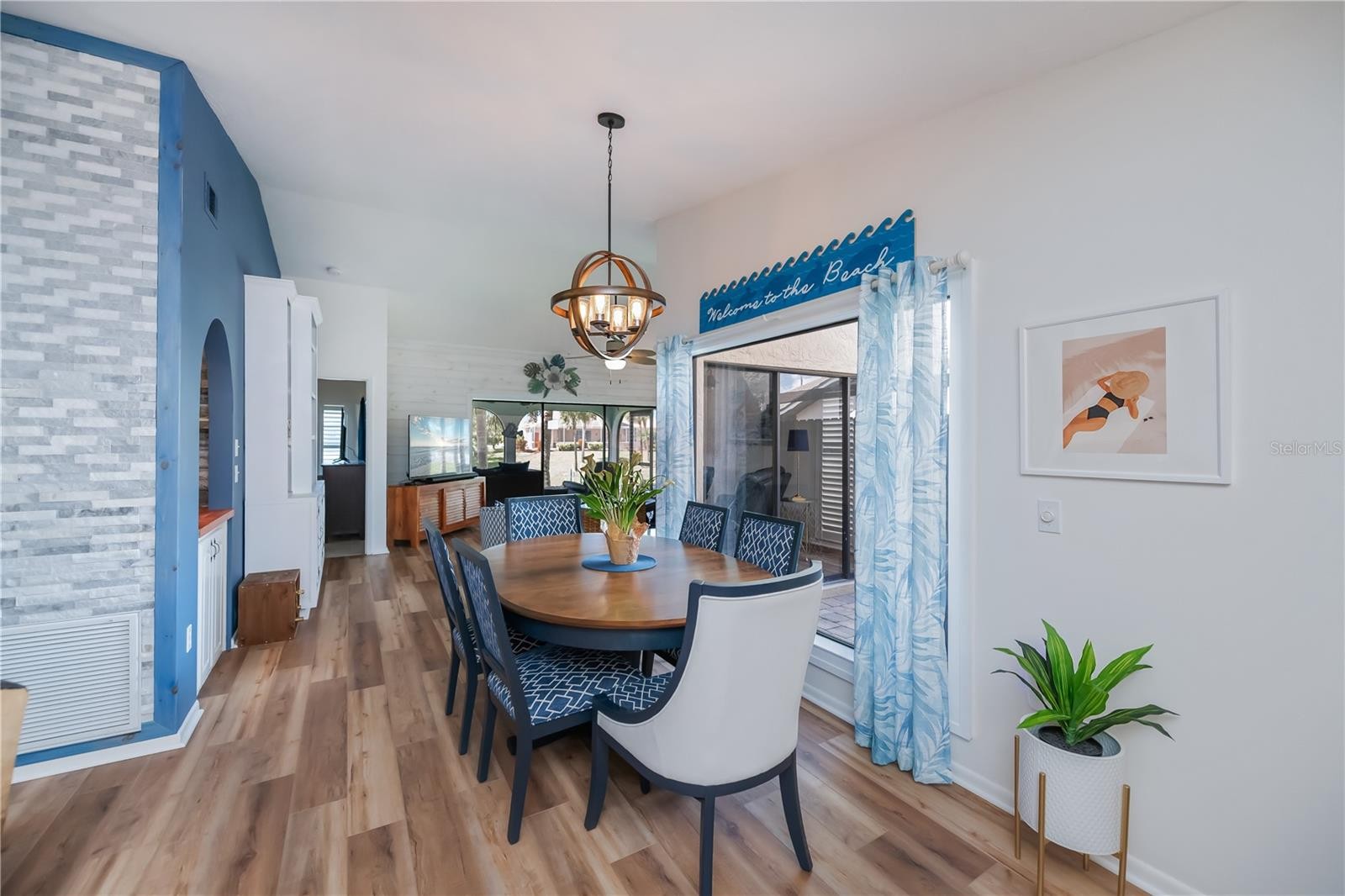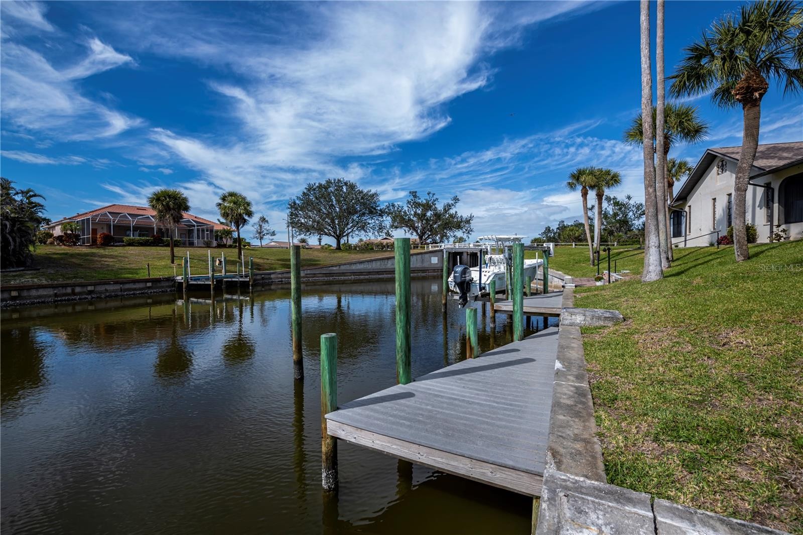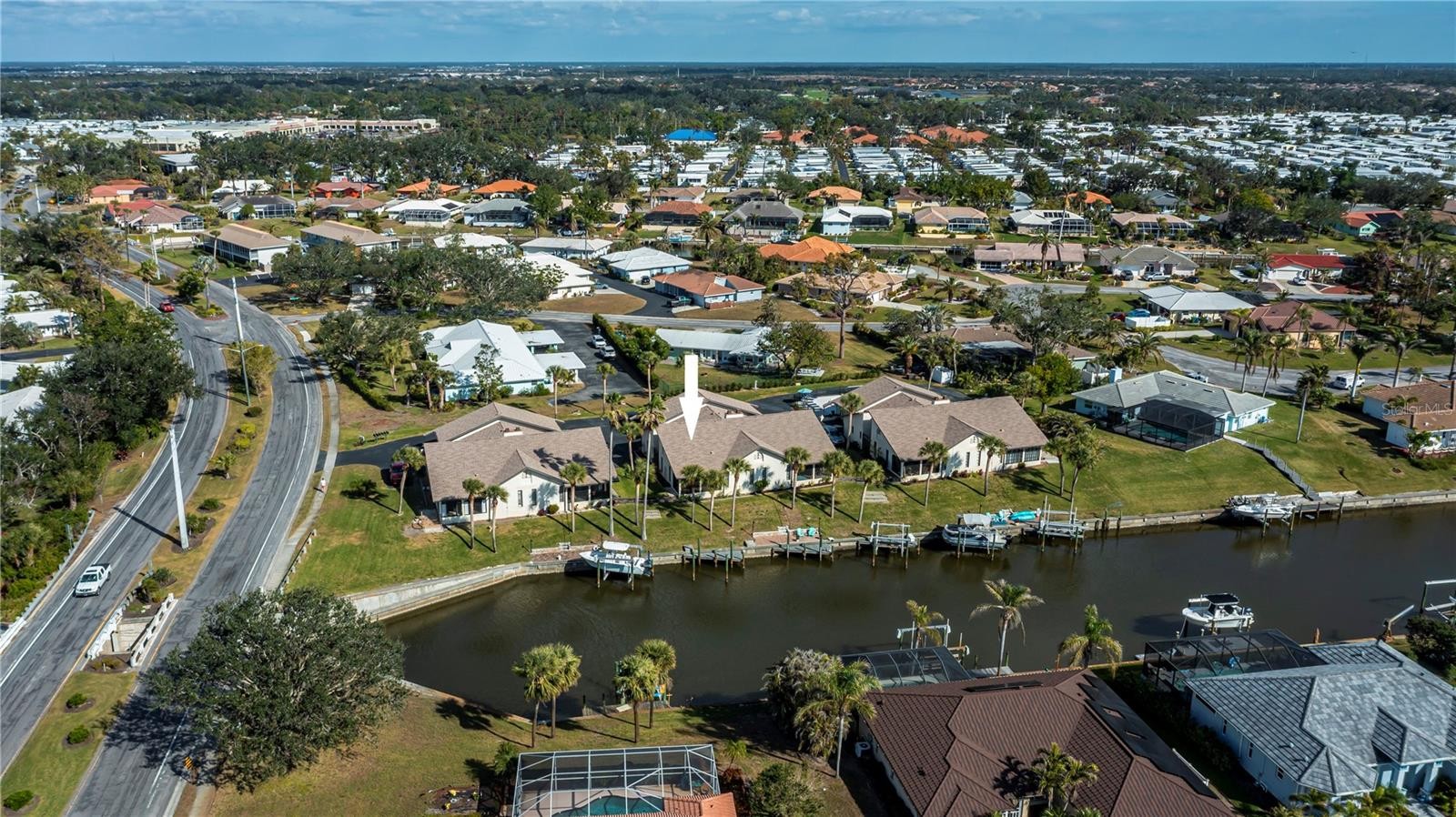 WATERFRONT VILLA WITH DOCK - TOTALLY UPDATED INTERIOR - OPEN FLOOR PLAN - 'X' FLOOD ZONE - SMALL COMMUNITY OF 6 VILLAS - COMMUNITY POOL - 3 YEAR OLD ROOF - NO STORM DAMAGE - JUST A SAMPLE OF WHAT THIS PROPERTY HAS! A beautiful hand painted mural greets you as you enter this unique two bedroom, two bath condominium with vaulted ceiling. Totally updated with newer kitchen; breakfast bar, abundance of cabinets and drawers, newer appliances, LVT flooring throughout, plus much more! The kitchen opens into a cozy family room with woodburning fireplace. The dining room is spacious and could seat a large group and opens onto the atrium which also has a beautiful wall mural. The front of the unit is an abundant living room with lots of natural light and opens onto a screened-in lanai overlooking the canal. This floorplan is comfortable for one or two or terrific for entertaining a large group! The ample primary bedroom holds a King Sized Bed along with dressers, chests, nightstands and a comfortable chair. It also has patio doors opening ono the lanai. A well lit primary bathroom includes a private commode room and large walk-in shower and closet. Rounding out he floorplan is a pleasant sized guest room and guest bathroom, a laundry room and one car garage. Everything in this unit is done well and a must see! The comunity pool is just steps away and a patio and dock area are by the water. The location can't be beat! Waterfront, minutes to five beaches, shopping, medical and a variety of churches. The bonus of the "X" flood zone - no flood insurance is a great savings!