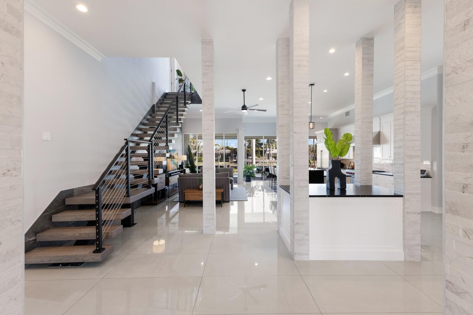 LOWEST PRICE PER SQ FT FOR WATERFRONT PROPERTY ON BIRD KEY! A magnificent sanctuary, 12' above sea level, perfectly positioned on the coveted West end of Dolphin Waterway, this home provides unmatched privacy and serenity, framed by 100 feet of SAILBOAT WATER FRONTAGE on Bird Key's DEEPEST AND WIDEST CANAL. BRAND NEW FLAT TILE ROOF was completed August 2025. Home was completely unscathed during the storms. Newly renovated 5,257 square feet of luxury, this architectural marvel features four bedrooms with two primary suites, one on the main and one on the second level, a yoga/media room, and four full baths. Upon entering, you'll be welcomed by an atmosphere of modern elegance with soaring ceilings and stunning 2' x 4' porcelain tile flooring. As you climb the luxurious custom modern floating metal staircase, uncover an awe-inspiring second primary suite and enter an expansive 33' x 23' retreat. This versatile space includes a full bath; two walk-in closets; sitting area, and access to a private balcony overlooking the sun-drenched pool area, Dolphin Waterway, palm trees, and occasional pelican sighting perched on one of your TWO NEW DOCKS, one with a 20,000lb lift and one personal watercraft 4500lb lift with space for two jet skis or kayaks. The grand entrance effortlessly flows into the open dining and living rooms. An expansive redesigned contemporary kitchen is at the heart of the home, a chef's dream outfitted with stainless steel Wolf Pro Series appliances, including a dual-fed six-burner natural gas stove with an electric oven, vent, and a sleek drawer microwave. A Sub-Zero Designer Series refrigerator/freezer, Sub Zero dual-controlled refrigerators, and a Cove dishwasher famous for its whisper-quiet operation enhance your culinary experience. The soapstone waterfall island with seating for eight is highlighted by a luxurious Brazilian Marble backsplash, and solid wood Campbell cabinetry adds a touch of timeless elegance. A custom-designed kitchen pantry room and storage or prep area perfect for private parties provide all the extra space needed to keep your kitchen organized, efficient, and clutter-free. The open kitchen and family rooms make this the perfect space for entertaining guests and watching your favorite movie or sporting event. Highlighted by a warm tile accent wall and crown molding, you can enjoy the sweeping waterfront views and stunning skies from this inviting space. Retreat to the private main floor suite through double doors into a water-view sanctuary with a primary bath featuring beautiful porcelain wood texture tile, contemporary lighting, soapstone counters, dual sinks, and a spacious glass-enclosed shower. A custom-built walk-in closet further enhances this suite. Two additional bedrooms and two resort-style baths are situated on the opposite side of this split plan. An additional flex space on the second level is perfect for a theater room, yoga room, or office. Situated on a secluded cul-de-sac with two side-load garages and space for four cars. This exquisite, gated residence offers immediate access to the pristine waters of Sarasota Bay and the Gulf. Perfectly situated near St. Armands Circle, Bird Key Yacht Club, and vibrant downtown Sarasota, you will enjoy coastal living and the Bird Key lifestyle all year round. Paradise is found in this exceptional Sarasota sanctuary. Make this coastal haven your new home!