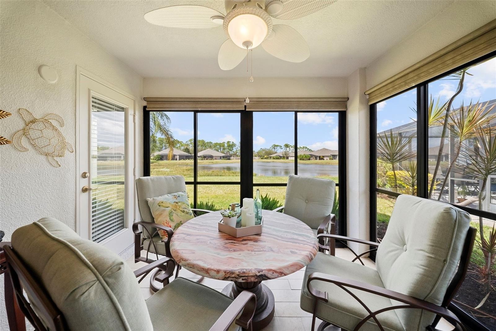Welcome to this stunning, furnished, turnkey and move-in-ready residence at 3697 Lakewood Boulevard in North Port, where luxury, comfort, and effortless Florida living come together. Perfectly positioned to capture serene water views, this beautifully designed home offers 2 bedrooms, 2 bathrooms, and a versatile den/office that can easily serve as a third bedroom thanks to its built-in closet. The open-concept kitchen, dining, and living areas create an inviting space ideal for both everyday living and entertaining, all enhanced by elegant designer finishes throughout. A true highlight is the inviting enclosed lanai, complete with windows, custom tile floor, sliding glass doors, and direct access to the backyard—providing year-round enjoyment of the tranquil water view. A privacy wall between neighboring homes ensures exceptional seclusion, creating your own peaceful retreat. Inside, the home features all hard-surface flooring with no carpet for easy maintenance, along with four solar tubes that fill the interior with beautiful natural light. Additional conveniences include a dedicated laundry room with bonus storage space and a two-car garage equipped with a retractable screen for added functionality. Just steps away, you’ll find the community clubhouse with a pool and workout room to bring your country club dreams to life. This immaculate home offers a sophisticated, turnkey lifestyle—simply bring your bags and start enjoying everything it has to offer.