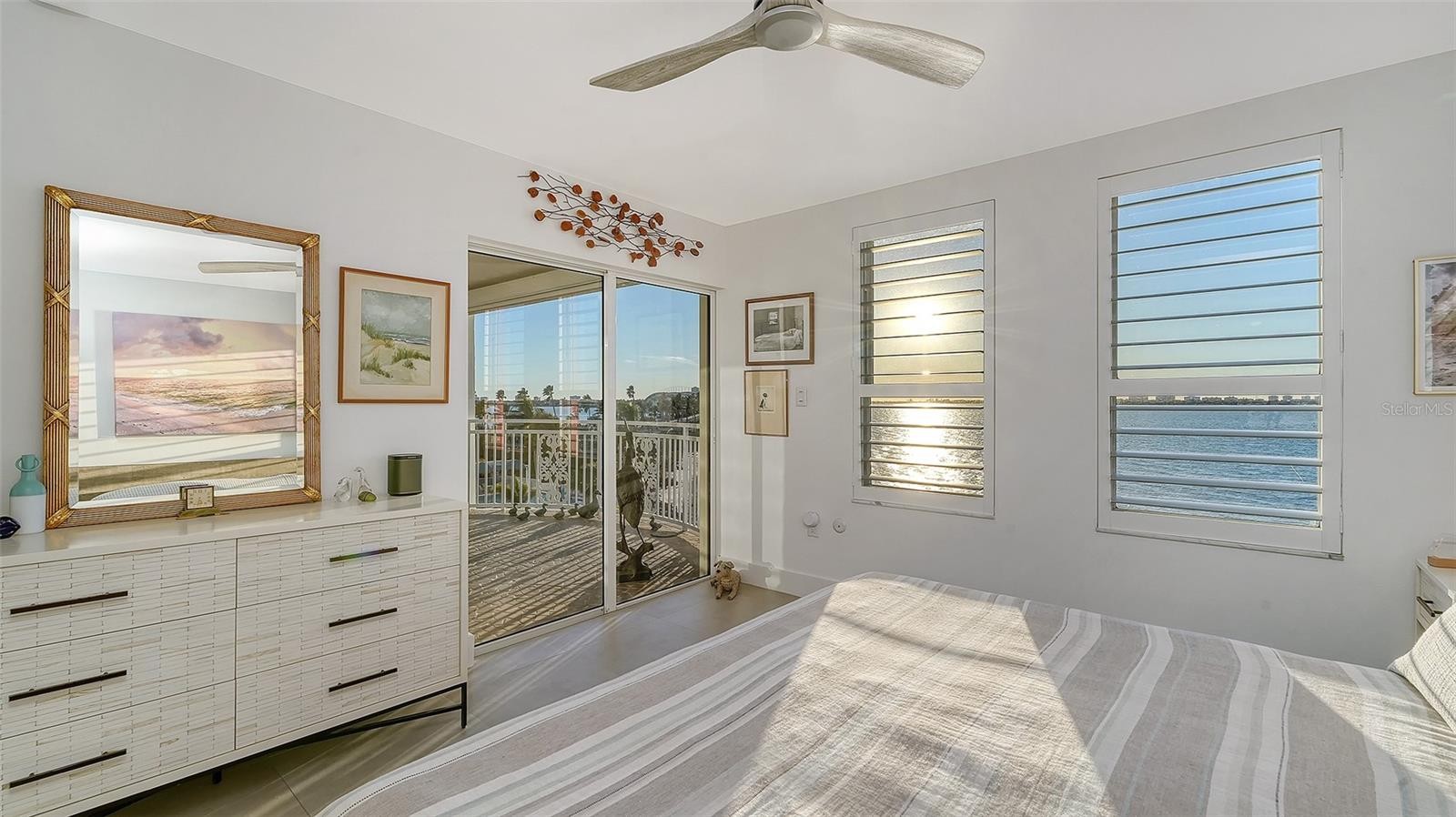 Little paradise directly on the water! Great value for this bayfront condominium in the downtown area! Quietly located on Sunset Drive, Le Chateau is an intimate building of 25 units and offers great walkability to everything that downtown Sarasota has to offer. You’ll enjoy the magnificent unobstructed water views, fabulous sunsets, and a private beach where you can relax or launch your kayak. This NW 4th floor corner unit has been beautifully updated with custom porcelain tile and features 3 bedrooms with walk-in closets, 2 generous bathrooms, an inviting kitchen with a large island, and a new A/C. The huge living room opens to a spacious private terrace, ideal for entertainment or a romantic dinner. It is a perfect place to admire the peaceful water and sunsets. A serene community pool overlooking the water is also a wonderful spot to unwind. Additional storage and one assigned carport parking space are included with plenty of spaces for guest parking. The reserves are fully funded. No pets are allowed.