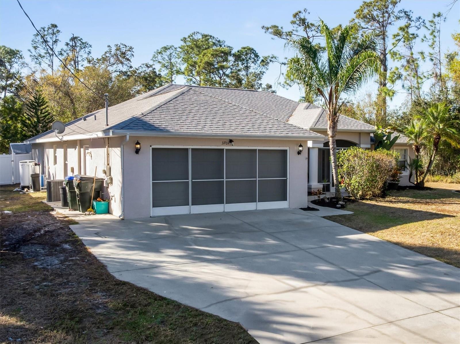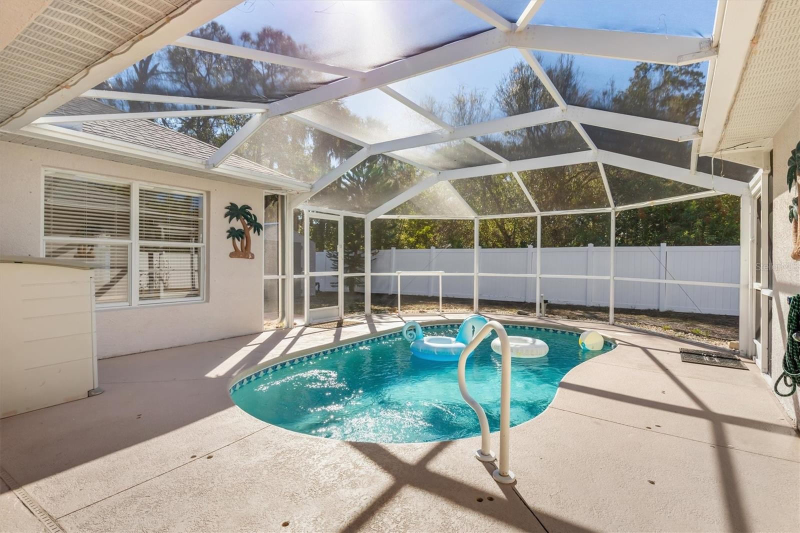 One or more photo(s) has been virtually staged. Location! Location! This spacious 2,358 sq. ft. pool home features 4 bedrooms, 3 bathrooms, and a 2-car garage, perfectly positioned off North Sumter Blvd and just a mile from the new Sarasota Memorial Hospital now under construction. With quick access to I-75, getting around town is easy and efficient. A brand new roof from 2023 adds major value, while the white vinyl fenced yard, storage shed, and brick paver patio with firepit create an outdoor setting made for relaxing and entertaining. Curb appeal shines with an eye-catching design that includes multi-pillared front columns framed by flowering shrubs and graceful palm trees. Step inside to a large living and dining room, with the kitchen overlooking the bright breakfast room. Just off the kitchen, a spacious family room with tray ceilings offers even more room to spread out and enjoy everyday living. The home wraps around a sparkling blue in-ground pool, and most rooms enjoy beautiful pool views that bring in natural light and a laid-back Florida feel. The kitchen is packed with upgrades, including solid wood cabinets with soft-close pull-out drawers, a lazy Susan, tall pantry, pendant lighting, crown molding, and a large wraparound granite breakfast bar. Bar stools are included, and the refrigerator was replaced in 2022. The primary bedroom includes tray ceilings, French doors to the pool patio, and a large walk-in closet. The private bath features dual sinks, a granite countertop with solid wood vanity, a luxury garden tub, and a tiled Roman walk-in shower. Guest bedrooms are generously sized with laminate flooring. The second bath is updated with a tiled tub and shower, wood vanity, granite countertop, and added cabinet shelving, while the third bath also offers granite counters, wood cabinetry, and a tub/shower combo. An inside laundry room includes washer, dryer, and overhead shelving. The garage offers wooden shelving that stays. Set in a quiet, peaceful neighborhood, this North Port home is close to a dog park, walking and biking trails, kayaking spots, the CoolToday Park Braves stadium, shopping, dining, and more. Flood insurance is not required. Home warranty for new buyer! Call today to schedule a private viewing and experience everything this incredible pool home has to offer!