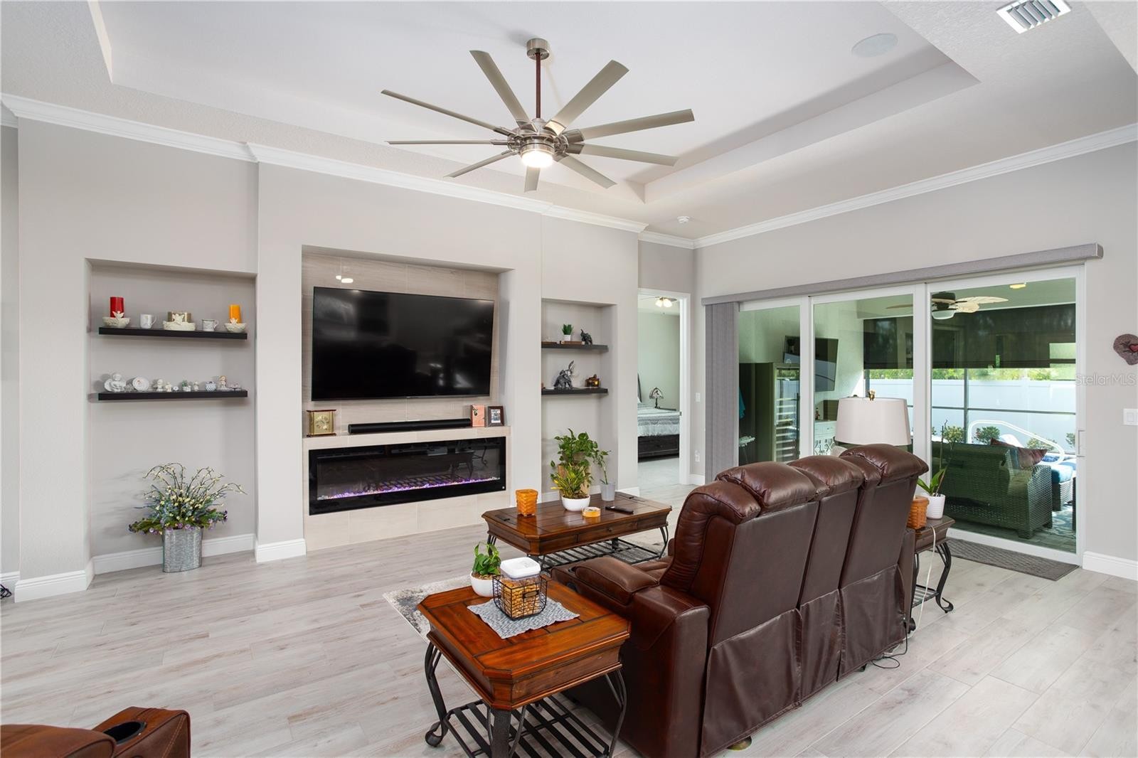 Elegant, beautifully landscaped Lee Wetherington 2-Bedroom, 2-bathroom Home with Office, Private Pool, & Golf Course Community Living. Welcome to 3727 Wild Blossom Place – a beautifully appointed home located in the sought-after gated community of Cypress Glen @ River Wilderness. This 2-bedroom, 2-bath home with a dedicated home office and a spacious 3-car garage offers the perfect blend of style and function. Step inside to an inviting open-concept layout with abundant natural light and tasteful finishes throughout. The kitchen is a chef’s delight with stainless steel appliances, solid-surface countertops, and a breakfast bar that opens to the dining and living spaces—ideal for gatherings and everyday comfort. The primary suite offers a peaceful retreat with a large walk-in closet and a private en-suite bathroom featuring dual vanities and a walk-in shower. A second bedroom, full guest bath, and versatile office provide ample space for family, guests, or working from home. Step outside to your own backyard oasis—complete with a private pool and a covered lanai, perfect for Florida living year-round. Located in a gated golf course community, residents enjoy access to a resort-style clubhouse, community pool, and beautifully maintained grounds. All just minutes from shopping, dining, and the natural beauty of Florida’s Gulf Coast. This home also offers, ceiling fans in all rooms, plantation shutters throughout the home, custom built-in shelving, marble wall in great room, new interior lighting, Florida basement with home safe off the garage, garage is kept cool with its own AC unit, pull-down stairs in garage for easy access to storge above, home filtration system and water softener, new front glass doors, outdoor kitchen, remote controlled screens on lanai, and to top it off, built-in surround sound speakers throughout the home and lanai with home stereo system! Sellers are leaving all 4 flat screen TV's, window treatments, some outdoor pool furniture. Don’t miss the chance to call 3727 Wild Blossom Place your home—where every day feels like a getaway.