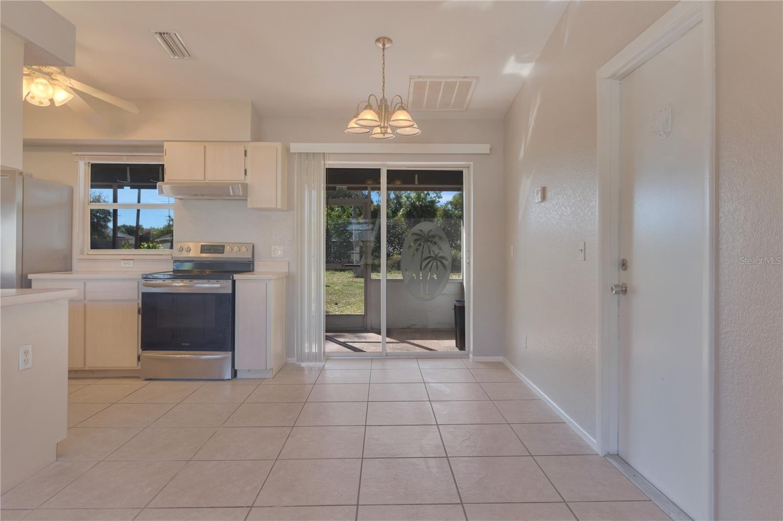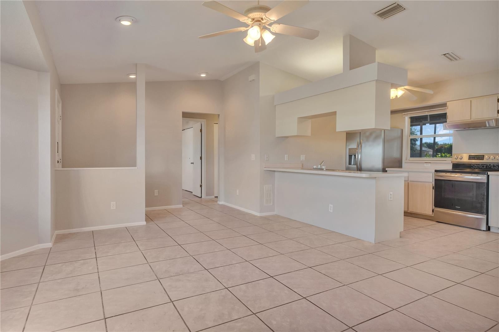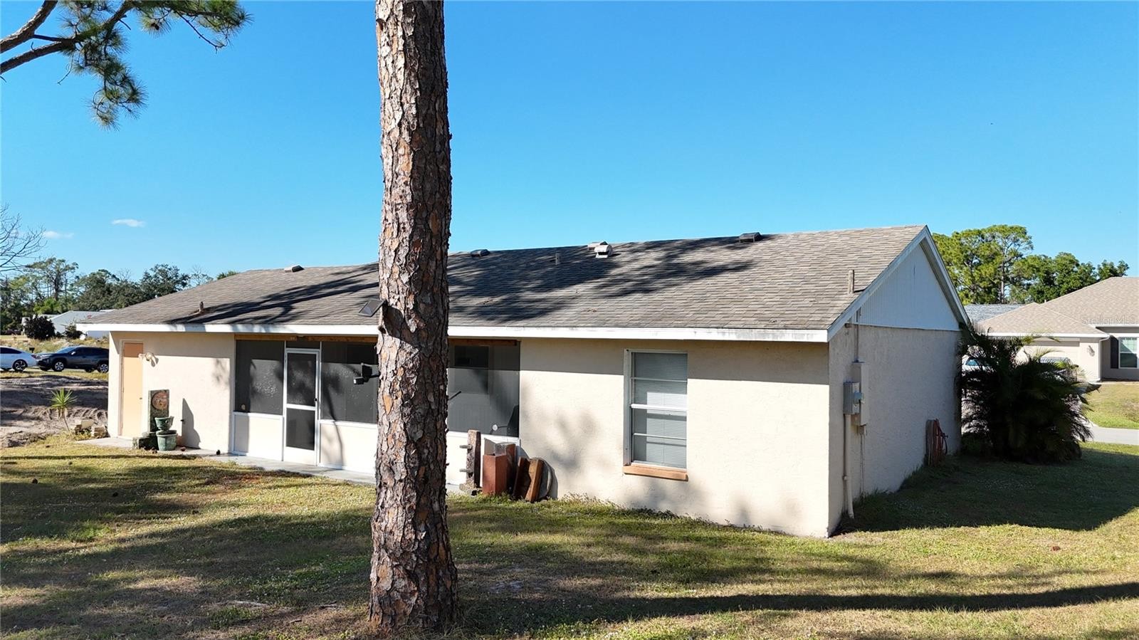 **Take a 3D Interactive Virtual 3D Tour of Your Affordable New Home**. Move-in ready and perfectly located, this well-maintained 2BR/1BA Florida home with 1-car garage offers comfort, convenience, and easy living. Vaulted ceilings, ceramic tile throughout, a bright Great Room filled with natural light, and freshly painted throughout. A perfect starter home, seasonal retreat, or easy living full time residence, Its central location and CITY WATER connection add to the convenience. Front facing windows bring in plenty of natural sunlight. The efficient galley kitchen provides ample cabinet storage, good counter space, a closet pantry, ceiling fan, stainless-steel refrigerator and range, and an interior-facing sink. A cozy breakfast bar connects seamlessly to the dining area and main living space - ideal for everyday meals and entertaining. Both bedrooms are comfortably sized and share a well-appointed bath with a tub/shower combo and makeup vanity. The primary bedroom includes a walk-in closet, backyard views, and direct access to the oversized screened lanai. The second bedroom also features a generous closet and ceiling fan. Step outside to enjoy the spacious lanai, perfect for relaxing, reading, or sipping your morning coffee. The large backyard offers plenty of room for a future pool, and the existing bathroom already has a door suited for a convenient pool bath. Centrally located, this home is just minutes from Cocoplum shopping and dining, schools, and the Braves Spring Training Stadium, plus a short 20-minute drive to the beautiful Gulf beaches. Affordable, clean, and full of potential - this is your chance to enjoy your own slice of Florida paradise. Schedule your private showing today!