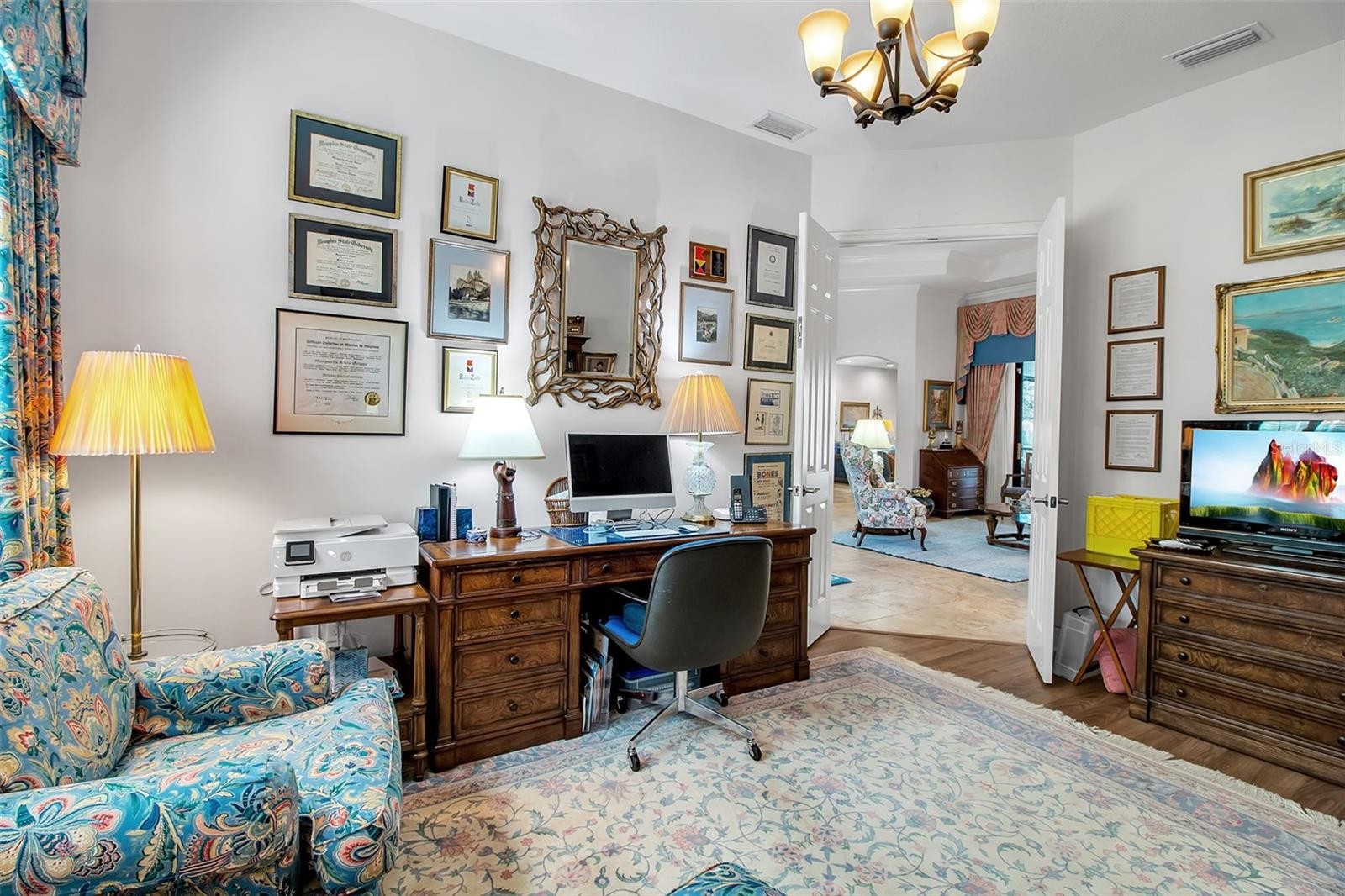 This exquisite custom home, crafted by Tivoli Homes and built in 2014, sits gracefully behind the gates of The Hammocks—a community known for its manicured landscaping, brick-paved driveways, timeless tile roofs, and generously sized homesites. This home has customized landscaping both in front and in the back garden area. Inside, thoughtful upgrades bring warmth and elegance to every corner. Crown molding highlights the formal spaces, while tray ceilings add depth and character to the master suite, living room, and dining room. The gourmet kitchen is a true centerpiece: granite counters, a center island, rich cabinetry with soft-close features, top-tier appliances, a gas cooktop with pot filler, and a custom hood and backsplash—all coming together to create a space that’s as functional as it is beautiful. The master suite offers peaceful views of the pool and the nature preserve beyond, giving the room a sense of quiet retreat. The en-suite bath features dual granite vanities with abundant storage, a separate garden tub, a walk-in shower, and two custom walk-in closets designed to keep everything effortlessly organized. A versatile Den/Library features rich wood-look luxury vinyl planking—an ideal spot for work, reading, or overflow guest space. Two other guest bedrooms have the same luxury vinyl planking and custom closets. Three sets of glass doors open to an outdoor living area designed for year-round enjoyment. The custom saltwater heated pool and spa include a swim shelf and an awning with lighting that elevates the entertainment area, giving ample shade when needed. The outdoor kitchen—with its built-in grill and bar—anchors the extended paver lanai, creating an inviting space for gatherings large or small. Exterior painted in 2024, and the crowning touch is the air-conditioned garage with custom cabinetry. All of this is just a short drive from UTC Mall, multiple golf courses, and the area’s renowned beaches, as well as Rothenbach Park—making The Hammocks a perfect blend of serenity and convenience. There are many upgrades the seller has made to this property, feature sheet is available.