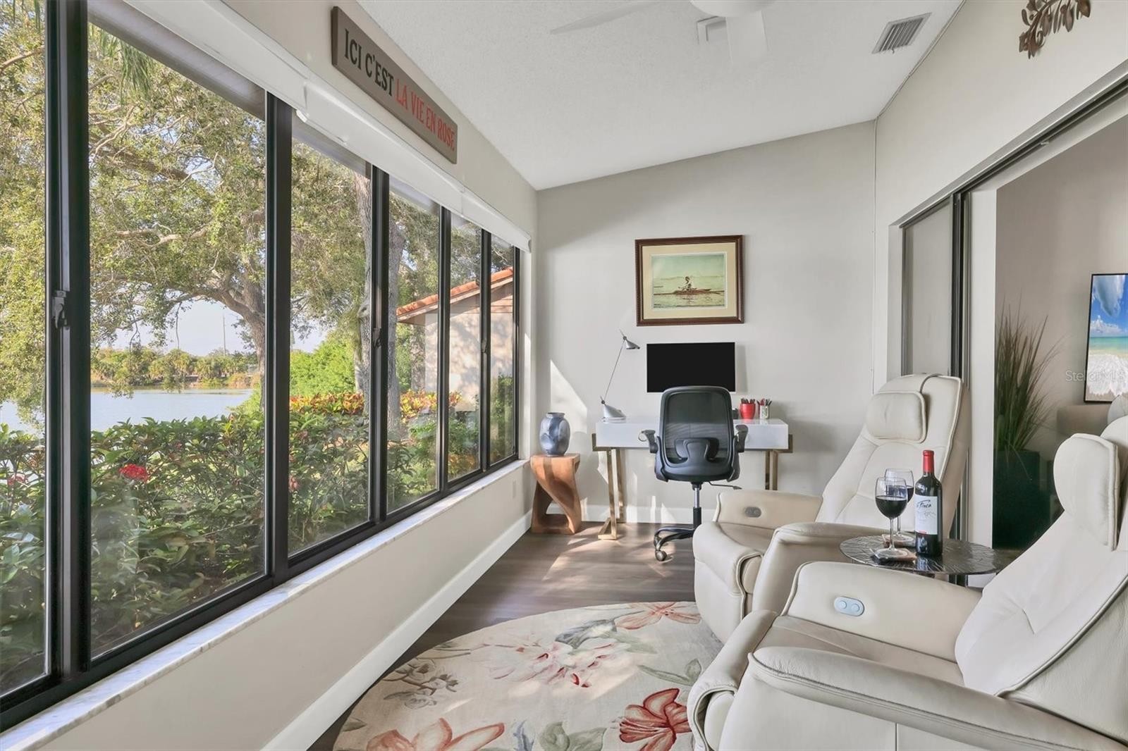 Discover refined living in this beautifully updated three-bedroom villa set in the sought-after lakefront community of Lakeshore Village in Sarasota. Positioned as an end unit, this residence is bathed in natural light from its many windows, vaulted ceilings and thoughtfully placed skylights, all enhancing its airy open floor plan. Enjoy serene water views overlooking a peaceful Audubon-designed rookery on Mirror Lake, where nature and luxury blend seamlessly. The remodeled kitchen is a chef’s delight, featuring quartz countertops, soft-close cabinetry and premium stainless-steel appliances. The spacious primary bedroom offers a tranquil retreat with direct access to the lanai through sliding glass doors. Additional highlights include dual walk-in closets and a well-appointed en suite with dual sinks. Impact windows in the primary suite and office provide peace of mind and year-round comfort. This villa epitomizes maintenance-free living, allowing you to enjoy the community’s exceptional amenities, including a heated saltwater pool, tennis courts, fishing, horseshoe pits and a vibrant recreation center. Just 15 minutes from Siesta Beach, downtown Sarasota and University Town Center, this home offers a blend of tranquility, convenience and luxury coastal living.
