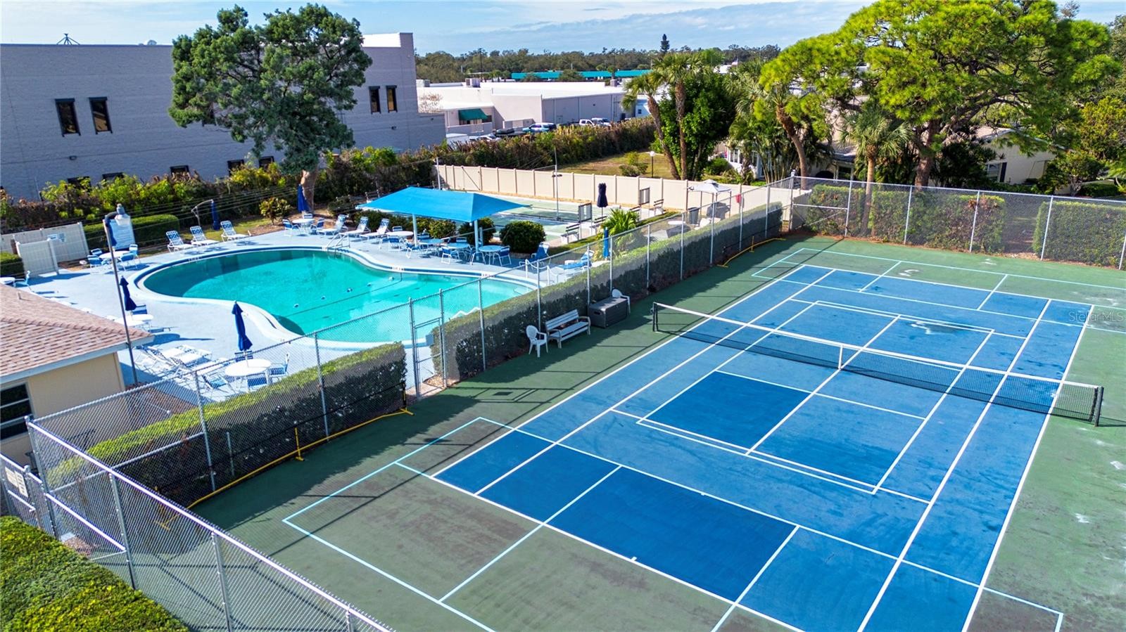 Welcome to your perfect retirement retreat in the sought-after DeSoto Square Villas, a desirable 55-plus community that offers a maintenance-free lifestyle filled with social activities and amenities. Located just across from the pool and tennis courts is this Beautiful one-bedroom, one-bath villa that presents a bright and open feel with tiled flooring throughout. Enjoy the convenience of a negotiable turn-key option. The kitchen features granite countertops, solid wood cabinets, pantry, updated appliances, and a delightful window view sink. The indoor laundry is equipped with a newer washer and dryer. The primary bedroom will comfortably fit a queen bed (king size too) along with additional furnishings, the bathroom vanity is solid wood with granite top , safety grab bars in shower / tub, and new comfort-height commode. Best of all is the inviting Lanai-Florida room, imagine sitting with a favorite book and beverage, from there -private access to your outdoor patio and a serene garden view that creates an ideal spot for relaxation. Benefit from the space saving Murphy bed, perfect for your house guests. PGT hurricane windows throughout, providing safety, noise canceling, and energy savings. New roof in 2024, New water heater replaced in 2025, indoor laundry with newer washer and dryer. Experience year-round leisure at the geothermal heated pool, socialize in the clubhouse, play billiards, exercise, or stay active with pickleball, tennis, and shuffleboard. DeSoto Villas is close proximity to medical facilities, places of worship, restaurants, shopping, public transportation, and many beautiful nearby beaches to choose from. Start your new adventure in this charming villa.
