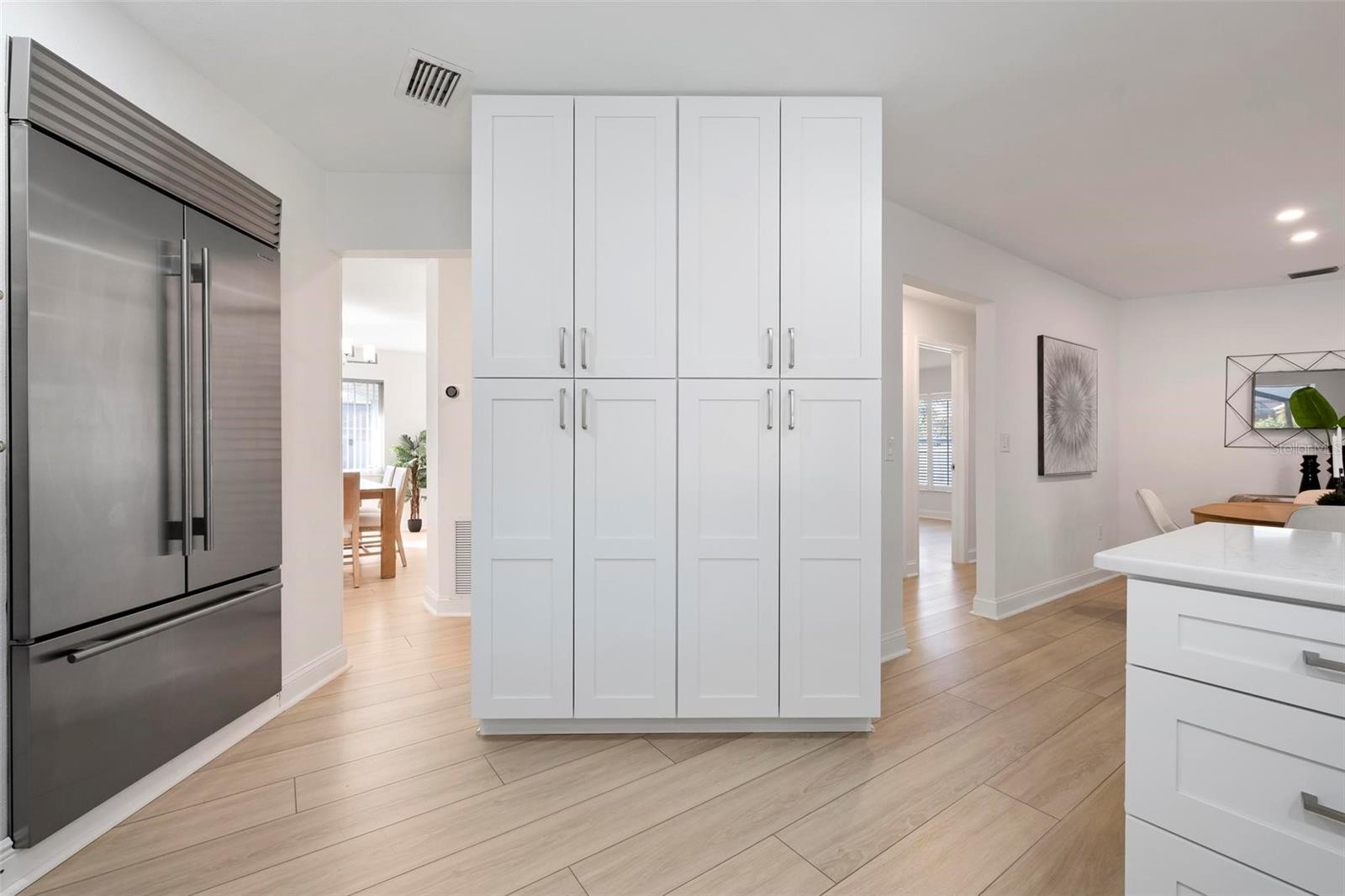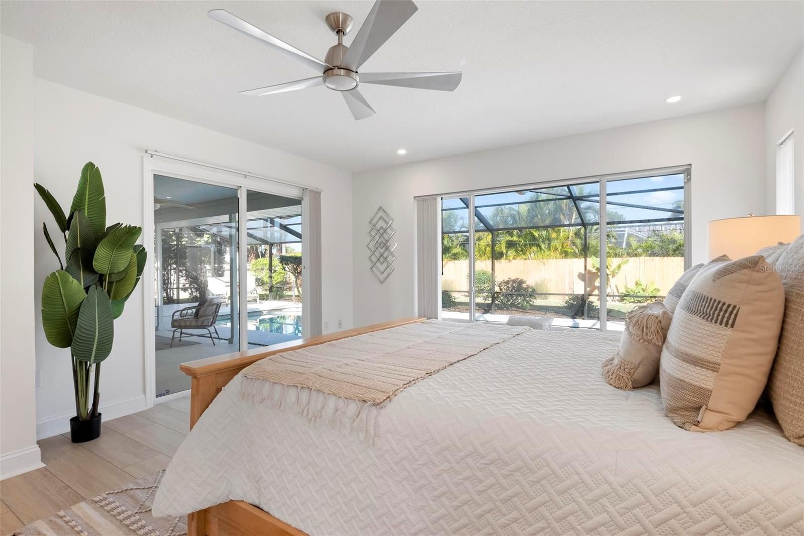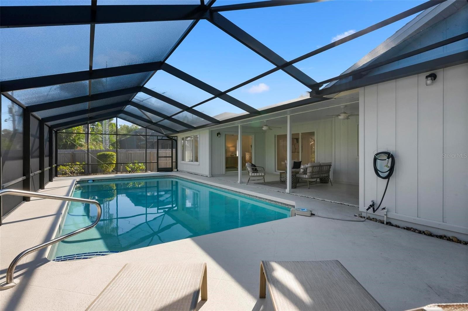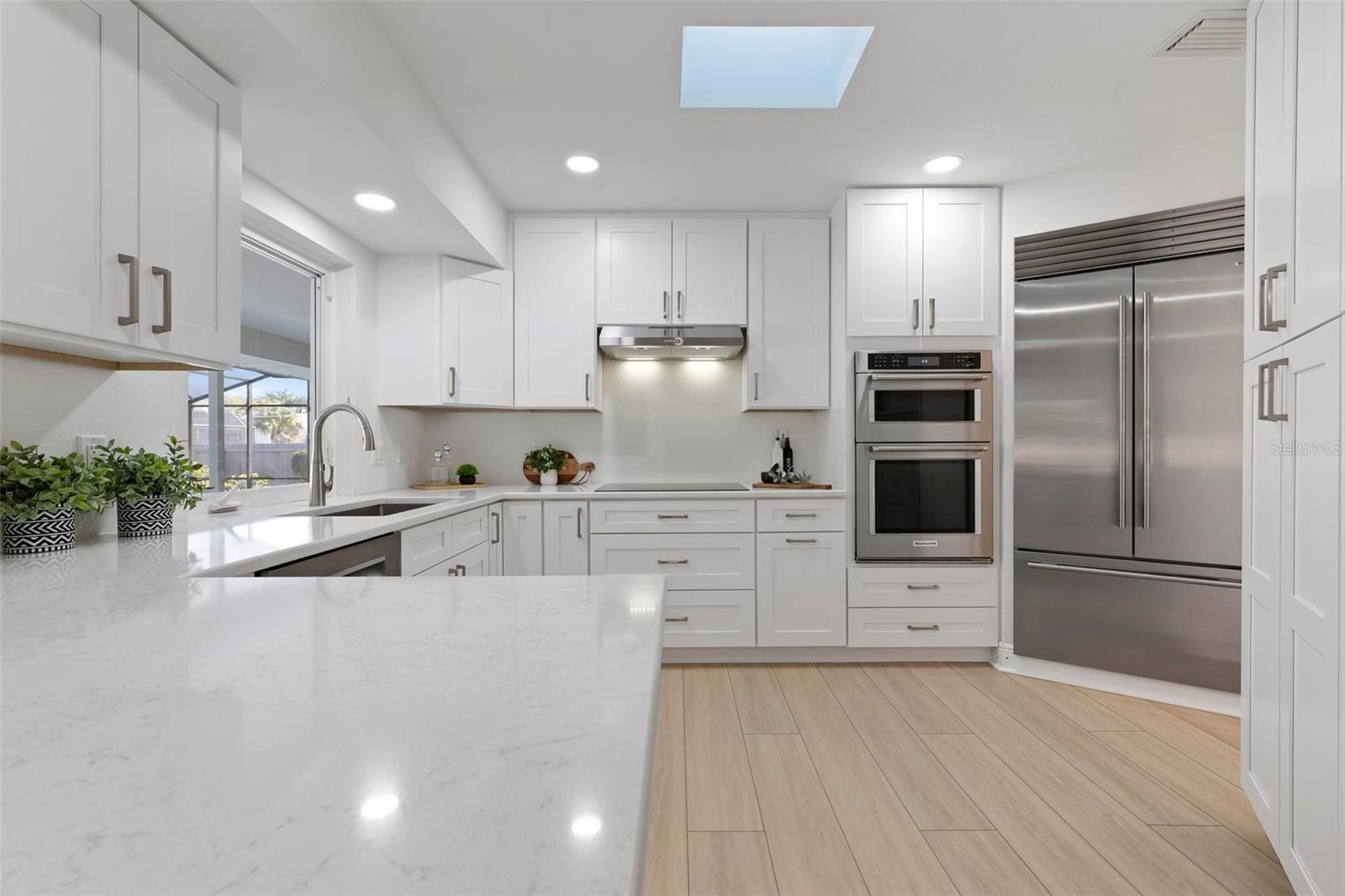 Move-in ready Golden Beach pool home on Venice Island, offering the perfect blend of coastal charm and modern updates. Stylishly remodeled throughout, this light-filled home features luxury vinyl flooring, a desirable split floor plan, and two spacious primary suites with en-suite baths, plus a third bedroom and full bath thoughtfully positioned across the home—ideal for guests or flexible living. The centrally located kitchen anchors the home and opens seamlessly to the family room with a cozy fireplace, while a separate dining and living room area provides space for entertaining. The updated kitchen boasts Quartz countertops, white cabinetry, large pantry cabinets and a Sub-Zero refrigerator, complemented by skylights and sliding glass doors that flood the living spaces with natural light. Step outside to your private tropical retreat with a heated pool, brand-new pool cage, and lush, beautifully landscaped yard—perfect for relaxing or entertaining. Recent improvements include a new roof, new pool cage, new hot water heater, and fresh interior and exterior paint, enhancing the home’s exceptional curb appeal. Enjoy deeded beach access via Golden Beach, offering a gazebo, BBQ area, and breathtaking sunset views just moments away. All of this is just a short walk or bike ride to Venice Avenue’s charming cafés, boutiques, and the beach—an unbeatable Island lifestyle opportunity.