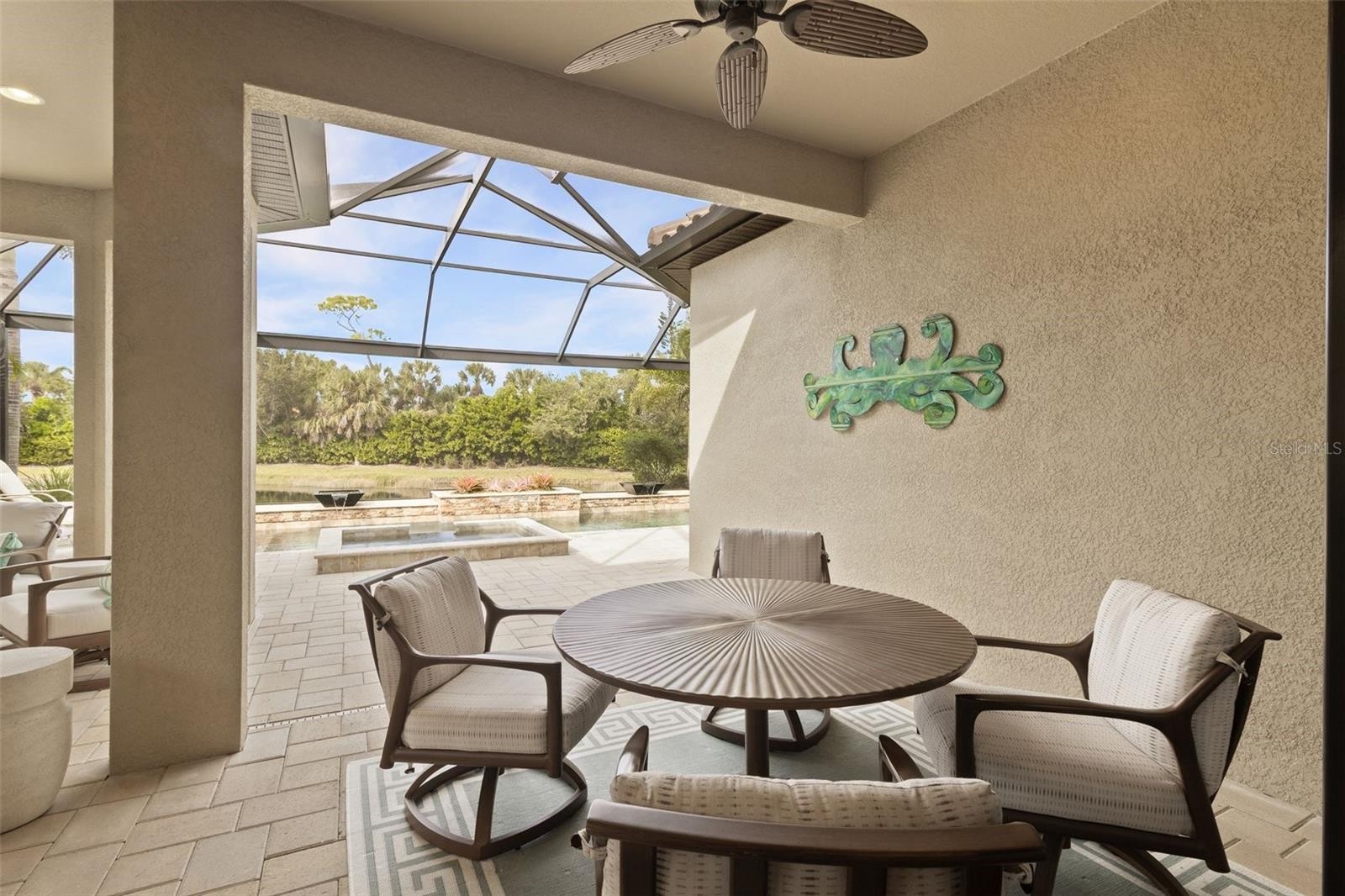 Discover the charm of coastal living with the convenience of a mainland location in this beautifully furnished Taylor Morrison home, nestled within the exclusive gated community of Bayside in Osprey. This peaceful and friendly Intracoastal enclave features just 49 landscape-maintenance-free residences, offering an intimate and effortless coastal lifestyle. Blending luxury, comfort, and coastal elegance, this meticulously maintained residence showcases thoughtfully curated upgrades throughout. Step inside to find refined details such as elegant crown molding and custom closets in bedrooms, as well as in the pantry and laundry room, ensuring exceptional storage and organization. The split floor plan includes three bedrooms plus a spacious den with pocket doors, creating flexibility for work, relaxation and space for guests. The designer kitchen is a standout, featuring quartz countertops, stainless steel Monogram GE appliances, a four-burner gas cooktop and handmade pendulum lighting imported from Granada, Spain. Additional upgrades include full-property gutters and a split A/C unit in the garage—ideal for a climate-controlled environment for classic or exotic car enthusiasts. This private, outdoor oasis is designed for both relaxation and entertainment, with a built-in kitchen and fireplace offering a heated saltwater pool with a brand-new pump and filter. The screened-in lanai was updated in 2025 with a stunning picture-frame view of the water, enhancing the sense of openness and tranquility. Residents of Bayside enjoy exclusive access to a private community waterfront area complete with a cozy fire pit, a community boat slip with direct access to the Intracoastal Waterway, and a newly built kayak launch. Full restoration of the remaining waterfront amenities will begin in January 2026 and have already been paid for with no future assessment. This prime location is also bikeable to Casey Key, Nokomis Beach, and the Legacy Trail within minutes. Offering style, comfort, and effortless coastal living in one of Sarasota’s most intimate bayfront communities, this home is ready to welcome you to the best of Florida living.