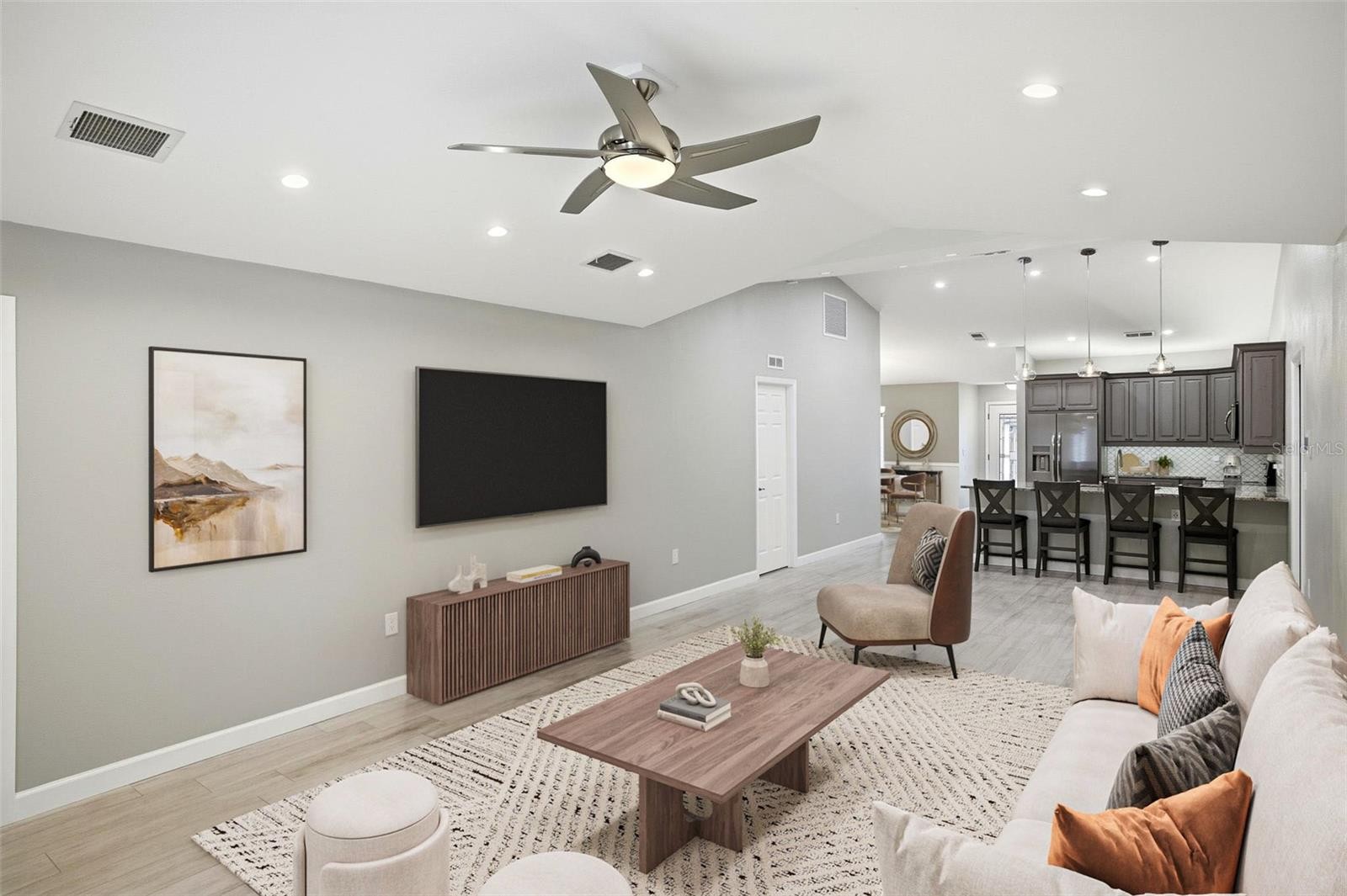 One or more photo(s) has been virtually staged. Welcome to this beautifully updated 4-bedroom, 2-bathroom home, completely renovated in 2020 and thoughtfully designed for modern comfort and effortless entertaining. The home has been meticulously maintained and cared for, showing true pride of ownership throughout. As you enter, you’re greeted by an abundance of natural light and an open-concept layout. The dining area flows into a stunning custom kitchen featuring ample cabinetry, soft-close drawers, under-cabinet lighting, and a large island with seating — perfect for gathering with family and friends. The kitchen opens seamlessly to the family room, creating a bright and inviting living space. The primary suite is privately located on one side of the home and offers a customized walk-in closet with built-in cabinetry. The spa-like en-suite bathroom features double sinks, illuminated mirrors, under-cabinet lighting, a glass-enclosed walk-in shower, and a built-in shower speaker. The bedroom next to the primary suite is perfectly positioned to serve as a guest room or home office, and a built-in ironing board adds everyday convenience. On the opposite side of the home, you’ll find two additional bedrooms and a fully renovated guest bathroom with a tub, illuminated mirror, under-cabinet lighting, and a built-in speaker. Double doors from the living room lead to a screened-in lanai with paver flooring — perfect for relaxing or entertaining. The home features a very spacious and private backyard, offering plenty of room to unwind, play, or create your own outdoor oasis. Additional highlights include gutters around the entire home, hurricane protection with most windows impact-rated and shutters on the three remaining windows, plus updated plumbing and electrical completed in 2020. Thoughtful upgrades throughout make this home completely move-in ready. Beautifully maintained and ideally located in a quiet and well-established Sarasota neighborhood, this home offers the perfect balance of privacy and convenience. Just minutes from shopping, dining, grocery stores, and everyday essentials, you’ll also enjoy quick access to downtown Sarasota, beautiful Gulf beaches— this home is a must-see.