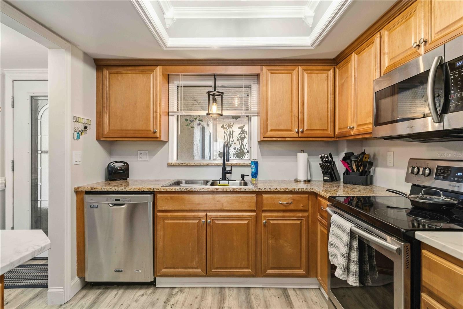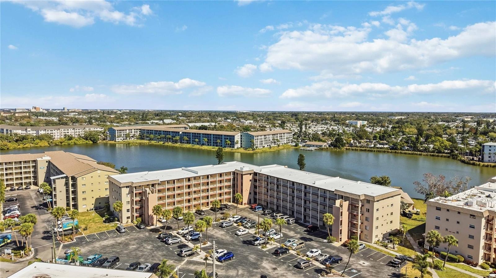 WOW...End Unit...Looking over the water, on the top floor, and NO CARPET!! The moment you walk into this condo, your search will be over! This one is an absolute showstopper and a true crowd-pleaser in a desirable 55+ community. It truly checks all the boxes. Located just steps from the elevator, with your own designated private parking spot conveniently nearby, everyday living here is effortless. Inside, you’ll immediately appreciate the Luxury Vinyl Flooring throughout. No overhead noise, minimal shared walls for just comfort and tranquility, only a top-floor end unit can provide. From the 5th floor, enjoy breathtaking lake views filled with birds, turtles, and even jumping fish. As a bonus, fishing is allowed, making this view not just beautiful, but relaxing! The living and dining areas showcase elegant architectural crown molding, adding a refined touch to the space. The kitchen is both functional and stylish, featuring abundant solid wood cabinetry, granite countertops, and stainless steel appliances. Perfect for everyday cooking or entertaining guests. Both bedrooms are generously sized, with the primary suite featuring its own private en-suite bath. Throughout the condo, you’ll find stunning modern finishes that truly make a statement and leave a lasting impression. Residents can enjoy a short walk to one of the three community pools or the clubhouse with planned activities, both of which serve as welcoming gathering spaces within the neighborhood. For those who appreciate coastal living, the property is located less than 10 miles from some of Florida’s most beautiful Gulf beaches, including Anna Maria Island. A variety of dining and shopping options are also conveniently located nearby. *BONUS includes cable and internet! This is an extremely rare find, as this will not last long on the market. Schedule an appointment and see for yourself!