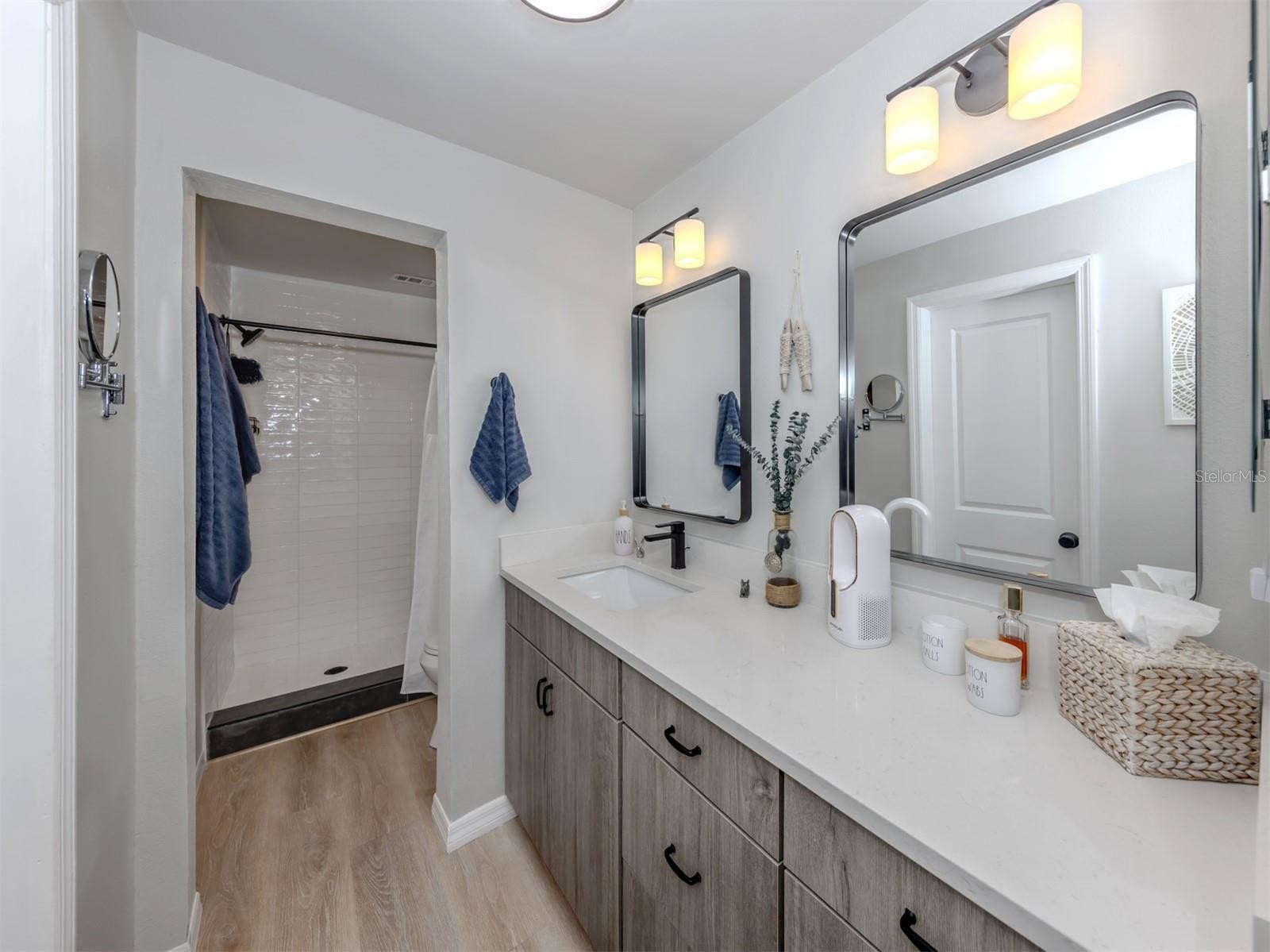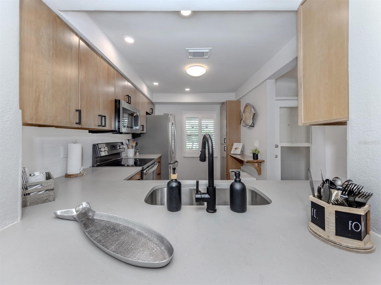 Fully renovated 2BR/2BA, second-floor Mission Lakes condo with long-lake views—only 8 minutes to Downtown Venice and Venice Beach. This move-in ready unit features luxury vinyl flooring throughout, NO popcorn ceilings, quartz kitchen countertops, soft-close Alder wood cabinets, pantry, coffee/wine bar, stainless appliances (2022), updated lighting, and modern fans. Both bathrooms have been completely updated; the primary includes a sliding barn door and large closet. Additional upgrades include impact windows (2024), new ductwork (2023), re-piped plumbing (2022), and new washer/dryer (2024) for peace of mind. Enjoy a tandem carport, walk-in storage room, and low-maintenance living with HOA fees covering water, sewer, trash, basic cable, exterior maintenance, grounds, pest control, roof repairs, and access to three heated pools. Mission Lakes offers a peaceful setting with lakes, walking areas, and quick access to shopping, medical facilities, golf, parks, pickleball, and over 7 beaches in a 7-mile stretch. Ideal for seasonal or year-round living in the heart of Venice, Florida.