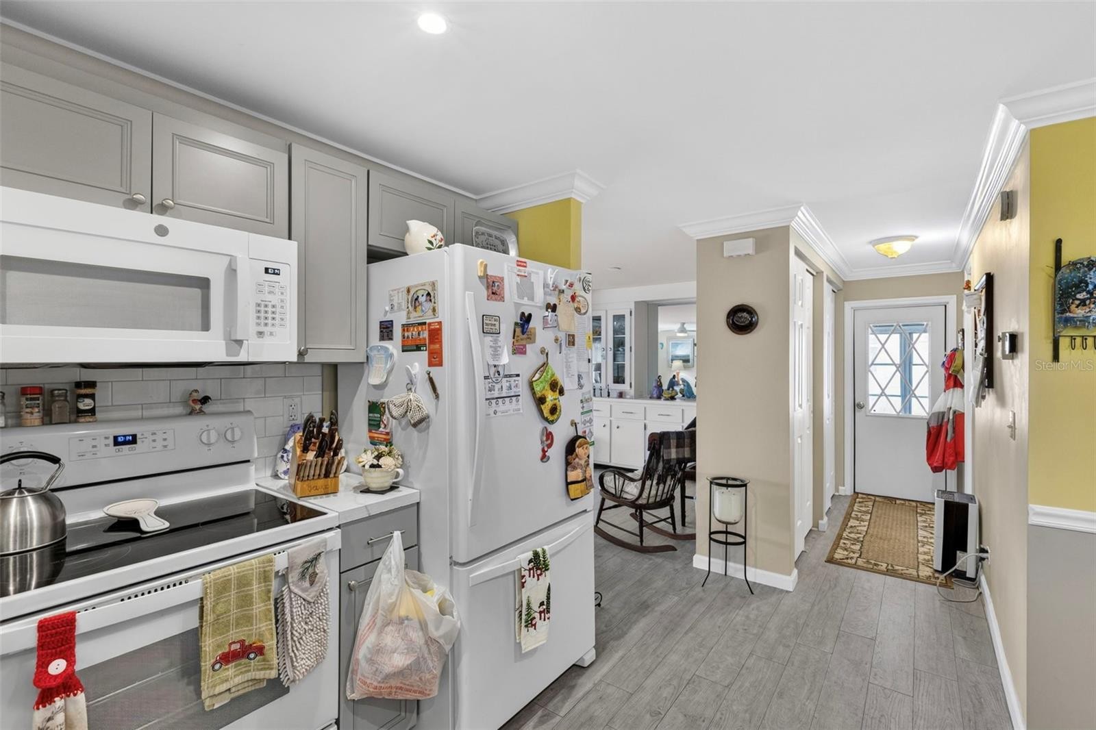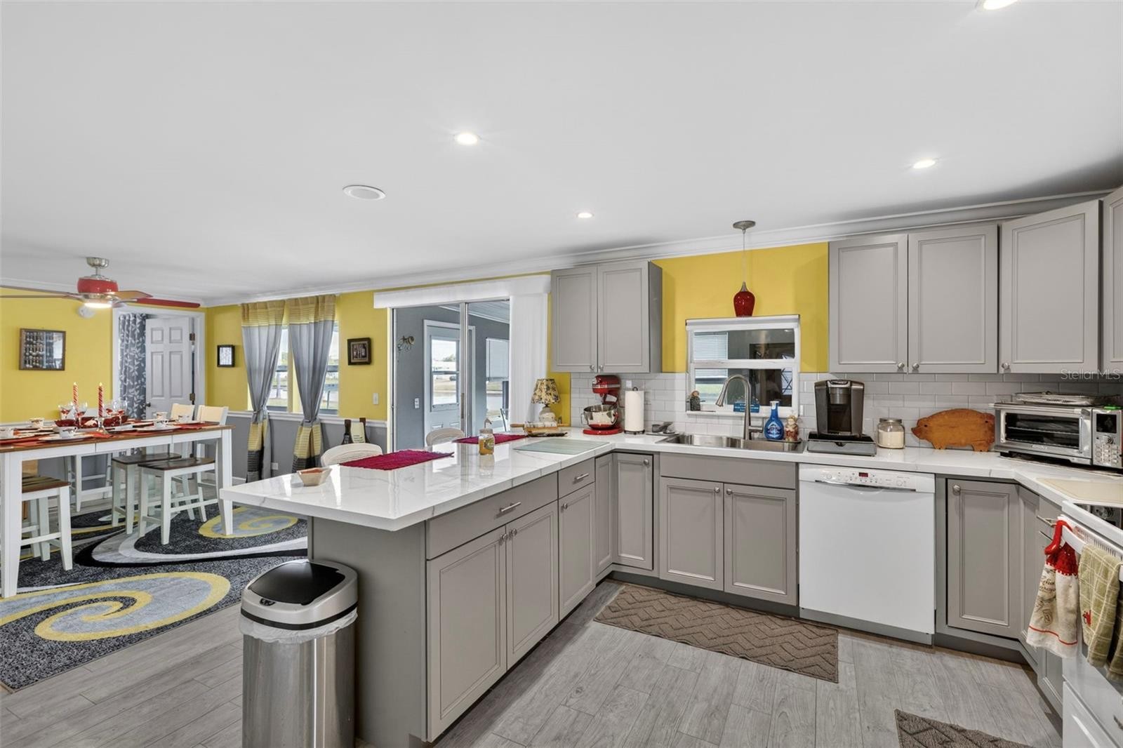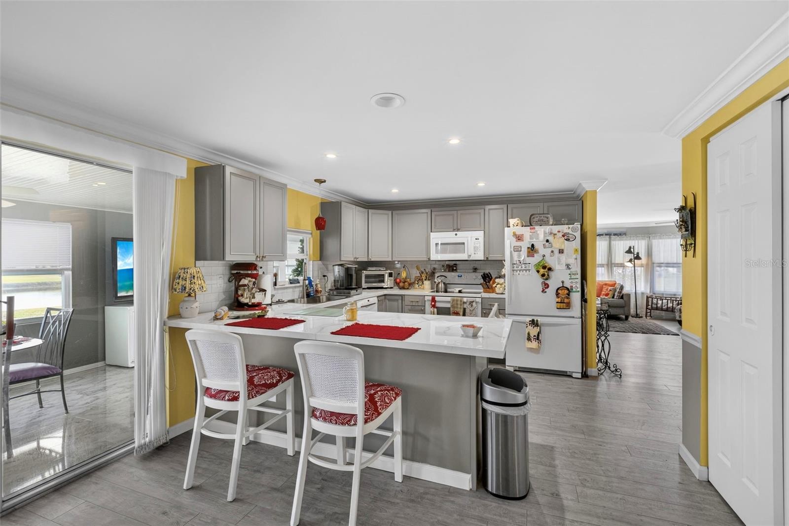 This beautifully renovated two-bedroom, two-bathroom home offers stunning lake views. Enjoy your morning coffee or an evening cocktail in the glass-enclosed Florida room, where you can savor the breathtaking sunrises and sunsets over the tranquil lake. The entryway features a double pantry and a double utility closet for extra storage. The bright and airy kitchen is equipped with newer appliances, a new countertop, a stylish backsplash, and gray cabinetry that includes two Lazy Susans for added convenience. There’s also an additional pantry for more storage. Adjacent to the kitchen is a dining room that has a sliding door leading to the glass-enclosed Florida room, which overlooks the lake. The Florida room includes a door that opens to a rear covered patio, as well as a front door that provides access to a walkway and carport. The spacious primary bedroom offers a built-in linen closet, a dressing area, and a laundry room complete with a washer and dryer. It also features a double closet and a new vanity. The primary bathroom is equipped with a large, tiled shower and elegant tile floors. The guest bedroom is generously sized, allowing for a king-sized bed, and it includes a double closet with direct access to the guest bathroom, which features a tub/shower combination and a new vanity. The carport connects to an enclosed lanai with a lovely tile floor, as well as an extra-large utility room with a door leading to the rear yard. This home boasts numerous upgrades, including a new carport, a new aluminum-pan roof over the carport, shed, and lanai, a new TPO roof on the home, newer tilt-in windows throughout, a new vapor barrier, newer siding, trim, skirting, a new A/C unit (installed in 2021), new raised-panel doors, and much more such as a new aluminum-pan roof over carport, shed, Florida room, new TPO roof on the home, newer tilt-in windows throughout, new vapor barrier, newer siding, trim, skirting, new A/C 2021, new raised-panel doors, and so much more. Welcome to La Casa, an enchanting community where 974 exquisite homes are beautifully set among native trees, surrounded by spacious common areas and eight serene lakes. Our generous 60 by 80-foot lots can create your ideal space. Perfectly located between Sarasota and Fort Myers, La Casa is a boater's paradise with direct access to the stunning Gulf of Mexico. Enjoy easy access to shopping, sightseeing, golfing, and fishing, all while immersing yourself in the rich culture of Southwest Florida. Experience the warmth of Southwest Florida’s winters in a relaxed environment, far from the east coast hustle. Our lush, mature landscaping reflects the dedicated care of residents and management. La Casa features some of the finest pools in the area, including our magnificent 40 by 60-foot swimming pool, maintained at a delightful 87 degrees, and a cozy 20 by 40-foot pool nestled between the clubhouse and Activity Building, both with inviting hot tubs. Stay connected with our complimentary Wi-Fi at the Clubhouse, Activity Building, and Recreation Hall while you soak up the sun. La Casa is a family-friendly haven where you can enjoy tranquility while remaining close to vibrant attractions. Come visit our charming oasis and discover why La Casa is the ultimate destination for snowbirds and year-round residents!