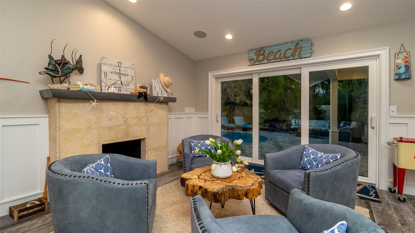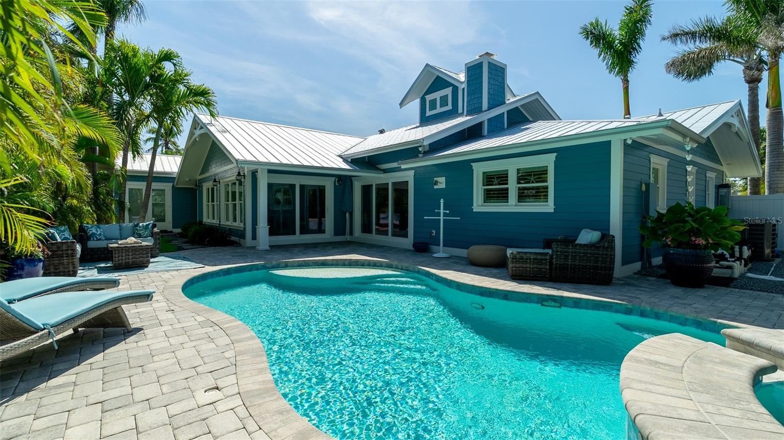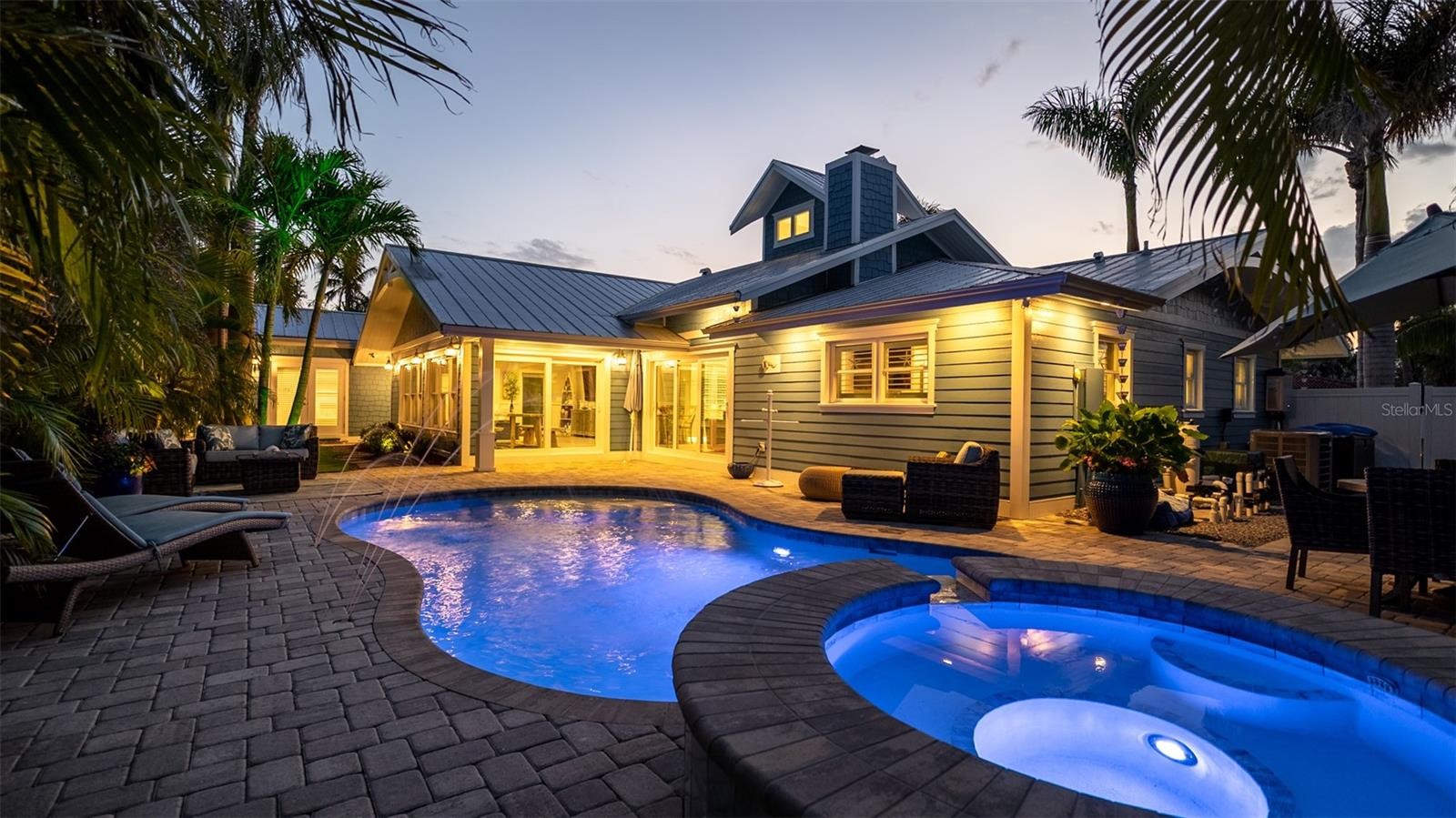 Charming Coastal Cottage in Holmes Beach. Welcome to this newly and meticulously remodeled coastal retreat, ideally located in the heart of Holmes Beach. This one-of-a-kind, artsy beach cottage blends timeless charm with modern elegance and smart technology. Step through the inviting rain glass double doors into a spacious open-concept living, dining, and kitchen area, where a dramatic lighted cupola and vaulted ceilings create a stunning first impression. A custom shell stone fireplace with a wood mantle adds warmth to the cozy seating area—perfect for relaxing or entertaining. The chef’s kitchen is a true showstopper, featuring an oversized, lighted quartz island with seating, beadboard cabinetry, and a custom wave-patterned glass backsplash. High-end appliances include an ILVE Majestic 4-burner gas stove with griddle, GE Café refrigerator, wine fridge, and porcelain farm sink—all designed with entertaining in mind.Craftsmanship continues throughout with custom millwork, shiplap accents, paneled walls, and solid-core doors. Oversized sliding glass doors open to reveal a tropical backyard oasis, complete with a free-form heated pool and spa, paver patio with artificial turf. The lush, mature landscaping with up lighting show off the tall palm trees, perfect for a evening cocktail party under the stars. The southern-facing yard is perfect for dining, lounging, and soaking up the sun. Each of the three bedrooms and 2.5 baths showcases custom chrome period fixtures, retro-inspired sinks, and designer details. Tech-savvy buyers will love the smart home features, including Lutron lighting controls, LED lighting, Sonos sound system, security cameras, and plantation shutters. The property includes a 250-gallon buried propane tank serving the on-demand water heater, gas grill, pool heater, and stove. It’s also generator-ready with existing plumbing and wiring in place. There is city dockage close by for boating enthusiast's This extraordinary home offers a rare blend of beachy charm and luxurious amenities—an absolute must-see!