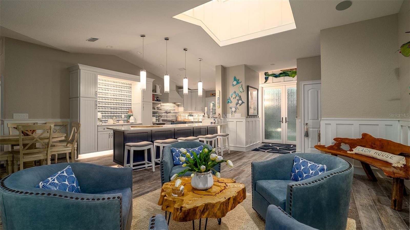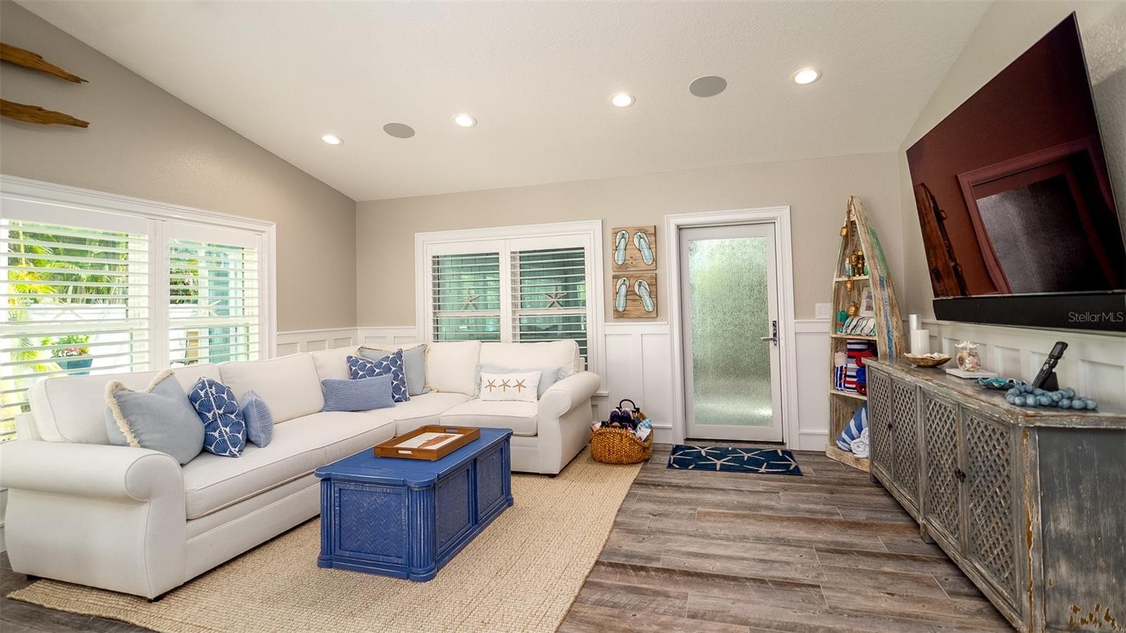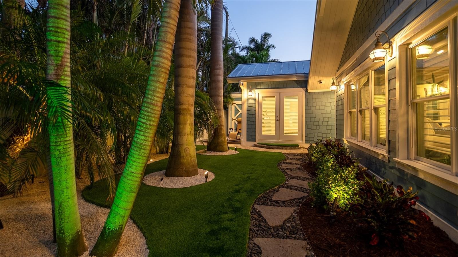 Charming Coastal Cottage in Holmes Beach. Welcome to this newly and meticulously remodeled coastal retreat, ideally located in the heart of Holmes Beach. This one-of-a-kind, artsy beach cottage blends timeless charm with modern elegance and smart technology. Step through the inviting rain glass double doors into a spacious open-concept living, dining, and kitchen area, where a dramatic lighted cupola and vaulted ceilings create a stunning first impression. A custom shell stone fireplace with a wood mantle adds warmth to the cozy seating area—perfect for relaxing or entertaining. The chef’s kitchen is a true showstopper, featuring an oversized, lighted quartz island with seating, beadboard cabinetry, and a custom wave-patterned glass backsplash. High-end appliances include an ILVE Majestic 4-burner gas stove with griddle, GE Café refrigerator, wine fridge, and porcelain farm sink—all designed with entertaining in mind.Craftsmanship continues throughout with custom millwork, shiplap accents, paneled walls, and solid-core doors. Oversized sliding glass doors open to reveal a tropical backyard oasis, complete with a free-form heated pool and spa, paver patio with artificial turf. The lush, mature landscaping with up lighting show off the tall palm trees, perfect for a evening cocktail party under the stars. The southern-facing yard is perfect for dining, lounging, and soaking up the sun. Each of the three bedrooms and 2.5 baths showcases custom chrome period fixtures, retro-inspired sinks, and designer details. Tech-savvy buyers will love the smart home features, including Lutron lighting controls, LED lighting, Sonos sound system, security cameras, and plantation shutters. The property includes a 250-gallon buried propane tank serving the on-demand water heater, gas grill, pool heater, and stove. It’s also generator-ready with existing plumbing and wiring in place. There is city dockage close by for boating enthusiast's This extraordinary home offers a rare blend of beachy charm and luxurious amenities—an absolute must-see!