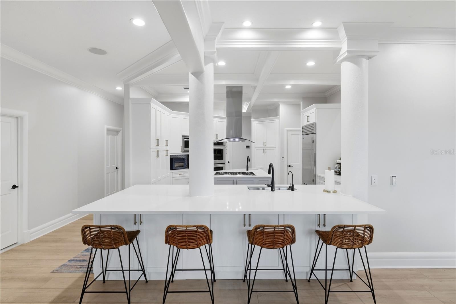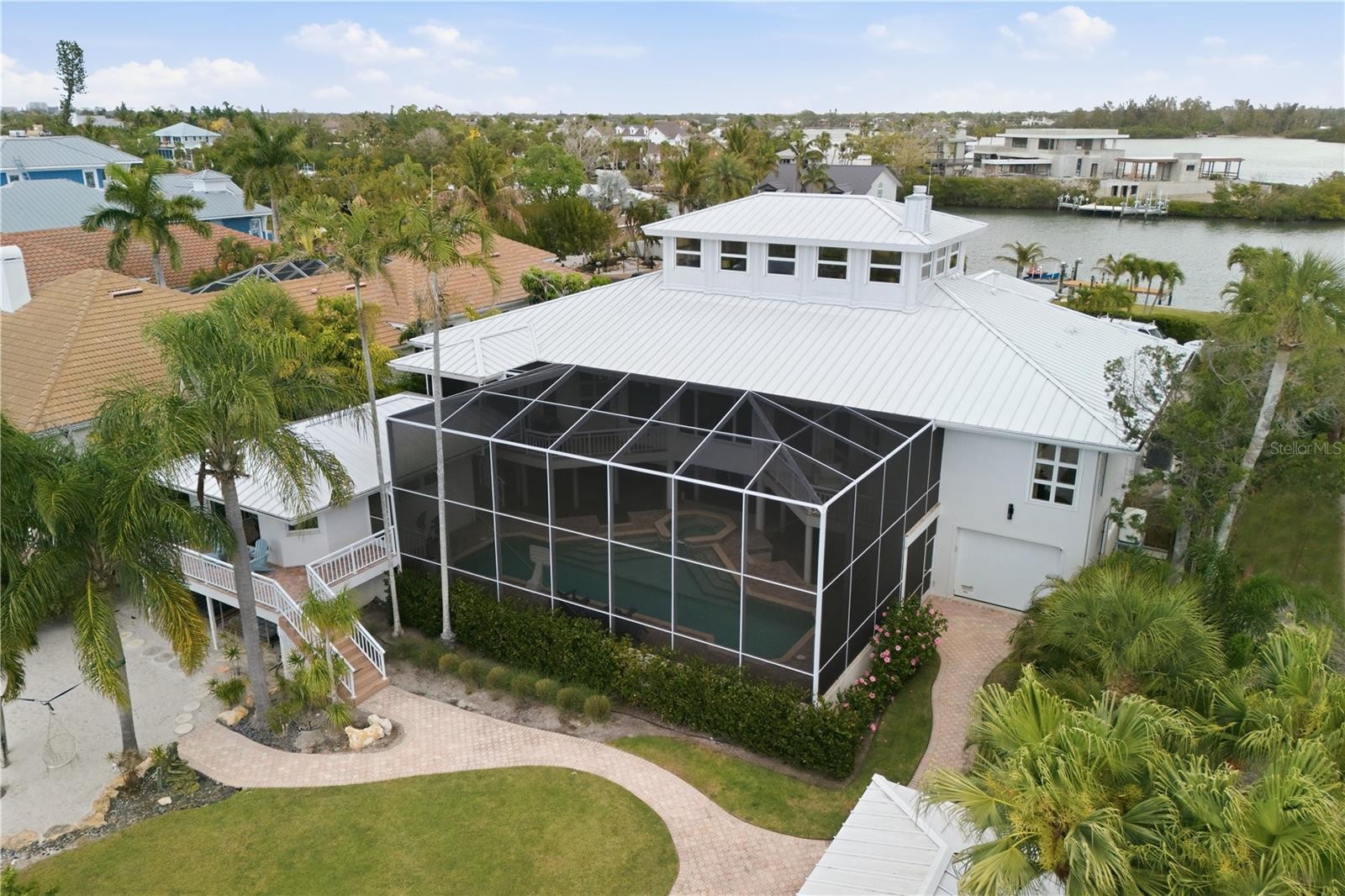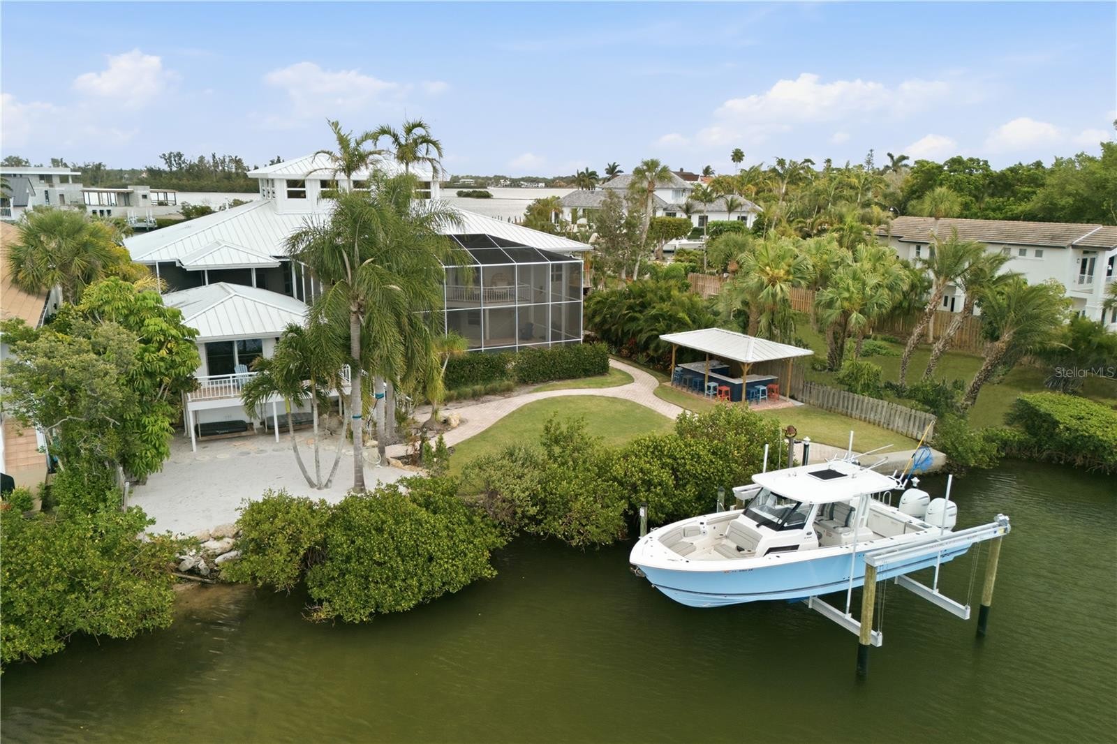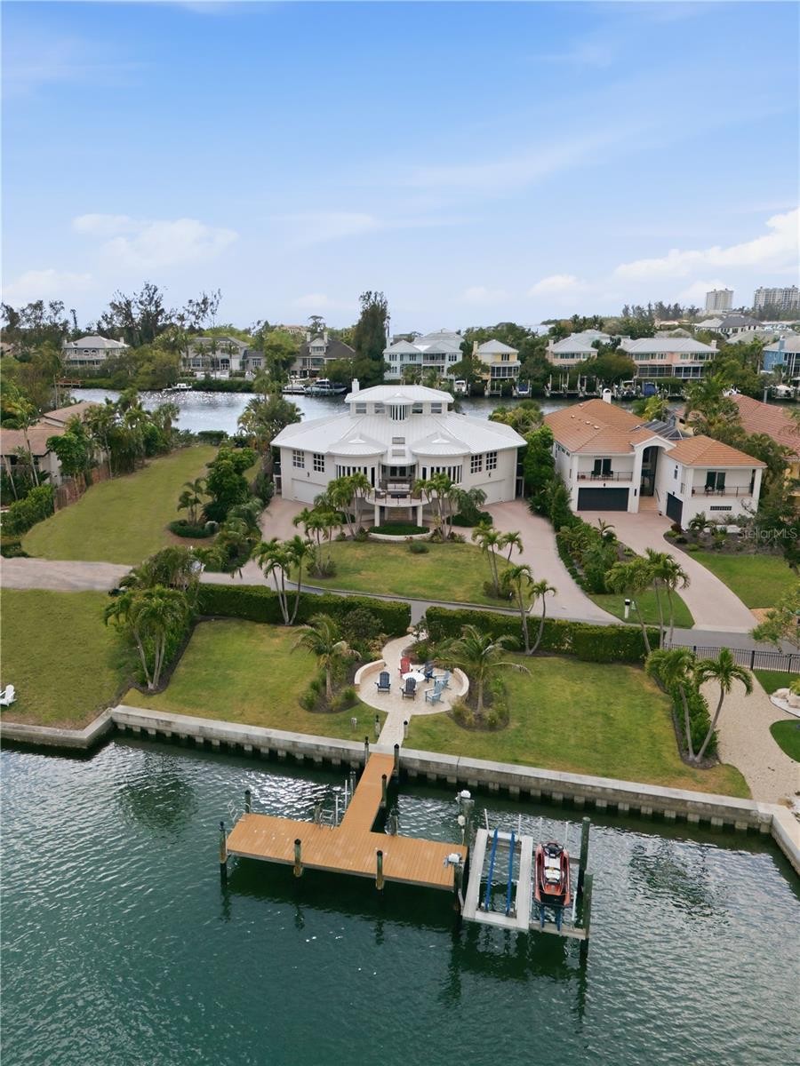 A rare offering on the exclusive enclave of Roberts Point Road, this fully remodeled in 2023 waterfront estate embodies refined coastal luxury, encompassing 5,458 square feet with five bedrooms, four full bathrooms, and one half bath. Showcasing water frontage on both the front and rear with direct, no-bridge access to Sarasota Bay, the home is set on a private 0.64-acre homesite. The property features a brand-new seawall and two exclusive dock settings, including a 16,000 lb boat lift and jet ski lift, along with a private waterfront seating area designed for effortless enjoyment of the serene surroundings. Underground utilities preserve uninterrupted water views, while soaring ceilings and a signature eagle’s nest vantage point elevate the home’s architectural presence and capture breathtaking vistas. Inside, the residence has been masterfully transformed with a refined open-concept design, anchored by a fully redesigned chef’s kitchen featuring Sub-Zero refrigeration, a gas range, new appliances and countertops, and exceptional craftsmanship throughout. Custom millwork, designer lighting, shiplap detailing, and elegant new railings define the home’s modern coastal aesthetic. The thoughtfully designed floor plan offers three distinct kitchen spaces—including a main kitchen, outdoor kitchen, and private guest suite kitchen—along with a private-entry guest residence and a versatile ground-floor loft with dual Murphy beds, providing exceptional flexibility for both everyday living and elevated entertaining. A private elevator services the home, while a new glass front entry door—currently being installed—further enhances its modern coastal presentation. Curated for both comfort and performance, the home is equipped with three new AC systems, a new well, enhanced irrigation and landscaping, a whole-home Generac generator, reverse osmosis and Kinetico water systems, and full smart home integration through Control4 automation, Sonos audio, and a high-end AV infrastructure. Outdoors, a resort-style pool and spa with both gas and electric heating and full app-based control ensure year-round enjoyment. Additional features include a six-car garage with epoxy floors, a bespoke outdoor bar and kitchen, screened enclosure, kayak storage, and a private sand area—culminating in a truly turnkey, design-forward waterfront estate in one of Sarasota’s most coveted locations.