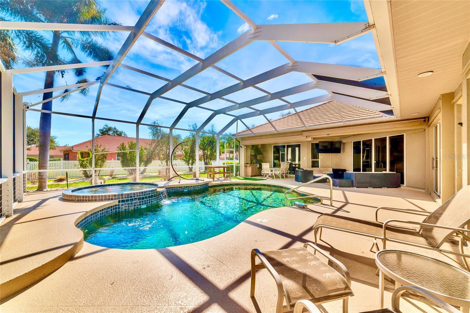 Exceptional 3 Bed, 3 Bath Home with Additional Office/Den and 4 Car Garage. Ideally Situated on Nearly Half an Acre Backing to a Serene Nature Trail. Offering Vast Space, Modern Upgrades, and Thoughtful Design. This Home Blends Comfort and Sophistication Both Inside and Out. At the Heart of the Home, the Expansive Kitchen Is Designed to Impress. Featuring New Stainless Steel Appliances with Gas Range, New Range Hood (2024), Generous Counter Space, and a Breakfast Bar Perfect for Casual Dining and Entertaining. A Dedicated, Oversized Dining Room Showcases a Contemporary Light Fixture, Creating an Elegant Setting for Gatherings and Special Occasions. The Living Room Is Anchored by a Built-In Gas Fireplace, Adding Warmth and Charm. While the Large Family Room Offers Flexible Space Ideal for a Media Room, Game Room, or Additional Lounge Area. Retreat to the Spacious Primary Suite with Tranquil Pool Views and a Spa-Inspired Ensuite Complete with a Garden Tub, Dual Sinks, and Custom Walk-In Closets with Built-Ins. Two Additional Bedrooms and Baths Provide Comfort and Privacy for Family and Guests. Step Outside to Your Private Outdoor Oasis Featuring a Heated Saltwater Pool & Spa with a New Gas Pool Heater (2023). The Lanai and Front Entry were Rescreened in 2023, Enhancing the Outdoor Living Experience. The Expansive Fenced Backyard Offers Privacy and Direct Access to the Nature Trail for Peaceful Walks and Outdoor Enjoyment. Additional Highlights Include a Rare 4-Car Garage with Epoxied Floors and Mini Split A/C Units, and Whole-House Generator. Extensive Recent Improvements Include New Exterior Paint (2024), New Interior Paint (2023), Updated LED Lighting & Switches Throughout, and a Whole-House Surround Sound System (2024). Greyhawk Landing is a Gated Community with Two Resort-Style Pools & Club Houses, Tennis & Pickleball Courts, Basketball Court, Baseball & Soccer Fields...A Great Destination for Families. The Location is in Close Proximity to I75, UTC, Downtown Lakewood Ranch, Manatee River, Medical Facilities, Ellenton Outlets, Premier Sports Campus, and World Famous Beaches.