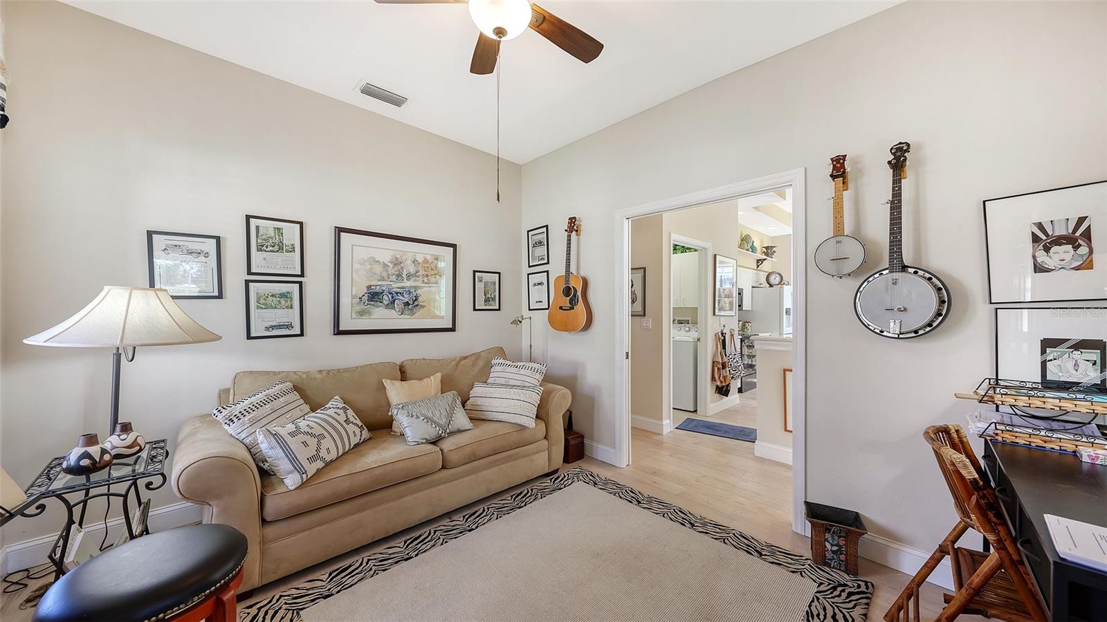 Your New Florida Home! Golf Course View! Enjoy sitting with friends on the Extended Lanai with Golf Course and Sunset views. This Home has been very well maintained with newer appliances, HVAC, Water Heater, Roof and paint. Enjoy the Split Plan layout with high airy ceilings, the Guest Bedroom and Full Bath in front, the spacious Master Suite with a bowed window sitting area in the back, and a Den/Office in the middle. Walk out to the enclosed Lanai from the Master Bedroom and Living Room. The Large Master Bathroom has high ceilings and double sinks, a Shower, private Water Closet, and a great Walk-in Closet! Relax in the Living Room after a nice meal in the Dining area. The Spacious Kitchen has a pantry and leads to a Side Patio for your Grill! Washer & Dryer, along with Cabinets are in the Laundry Room. The Garage has storage Cabinets, along with a pull-down Ladder for Attic Storage. Peridia Isle has reclaimed water for the Sprinklers, along with Cable and Internet included in the Peridia Dues. Peridia has many activities: Pickleball, Water Aerobics, Tennis, Golf, full dining room and bar, outdoor Tiki bar, golf leagues, etc. The Peridia community is a terrific value considering the reasonable fees and the abundance of amenities.