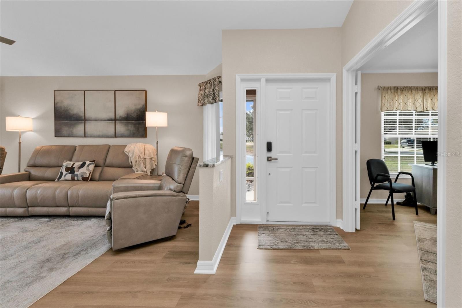 Impeccably renovated and truly turnkey, this beautifully appointed 3-bedroom, 2-bath villa is located within a private gated North Port community and is situated outside of a designated flood zone, offering added peace of mind and potential insurance savings. The home enjoys tranquil lake views and features a thoughtful collection of quality upgrades throughout, including wide-plank flooring, fresh interior paint, an inside laundry room, and an updated kitchen with granite countertops and brand new high-end appliances, custom cabinetry, a herringbone tile backsplash, and clean modern finishes. Major mechanical improvements include a newer roof, newer A/C, a newer hot water heater, and a full-house surge protector, while complete storm protection is provided with accordion shutters on all windows and three electric roll-down shutters securing both sides of the lanai and the screened front entry. Outdoor living is enhanced by new landscaping and a screened back porch overlooking the lake, with no homes directly behind the villa, offering a welcomed sense of privacy and calm. The two-car garage features epoxy flooring and a roll-down screen, and the home is offered fully furnished for immediate enjoyment. Residents benefit from a well-managed HOA that includes exterior and grounds maintenance, private roads, internet, escrow reserves, and access to a clubhouse with a fitness room, social and meeting spaces, and a heated swimming pool with an expansive sun deck and chaise lounges, all ideally located near golf, dining, shopping, and the full range of North Port amenities.