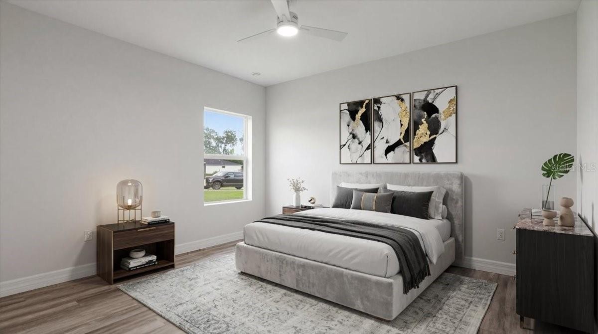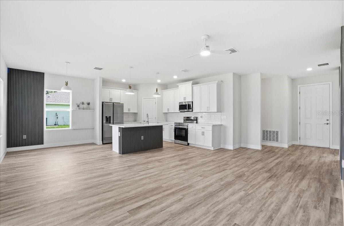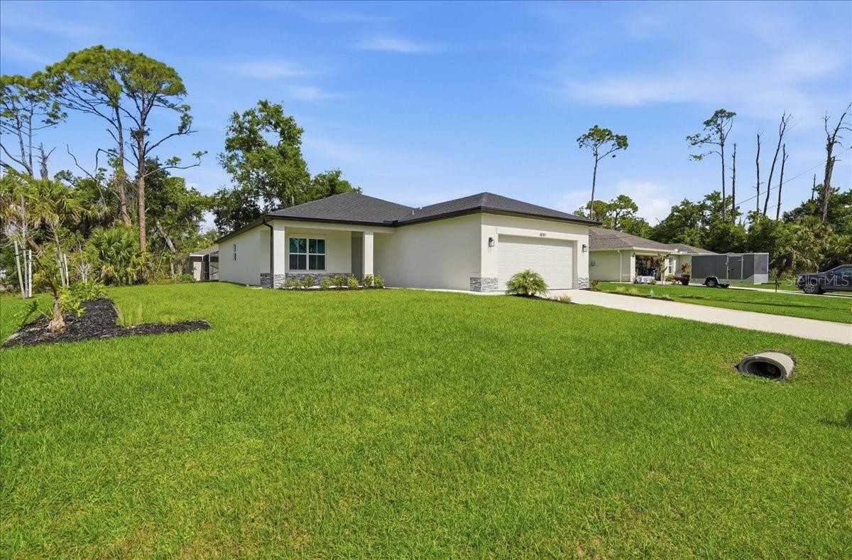 One or more photo(s) has been virtually staged. New Construction 2025 | Move-In Ready | No Carpet | Corner Lot | Hurricane Impact Windows & Slider | No HOA | Flood Zone X — Welcome to your brand-new dream home in the heart of North Port! This beautifully designed 3-bedroom, 2-bathroom home with a 2-car garage features an open-concept layout perfect for everyday living and entertaining. Luxury vinyl flooring flows throughout the living areas and bedrooms, with tile flooring in the bathrooms—no carpet anywhere—and ceiling fans installed in all rooms for added comfort. The gourmet kitchen showcases quartz countertops, stainless steel appliances, soft-close cabinetry and drawers, and ample counter space, with refrigerator, washer, and dryer included. The spacious owner’s suite features a tray ceiling, walk-in closet, and a spa-like bathroom with modern fixtures, while bedroom 2 also offers a walk-in closet for additional storage. Built for peace of mind, the home includes hurricane impact windows and an impact slider, along with an epoxy-coated garage floor and gutters installed along the front of the home. Situated on an oversized corner lot with plenty of room for a pool or outdoor living space. No HOA or CDD fees. Conveniently located less than 10 minutes from I-75 with easy access to shopping, dining, parks, and Gulf Coast beaches—this home offers the best of Florida living.
