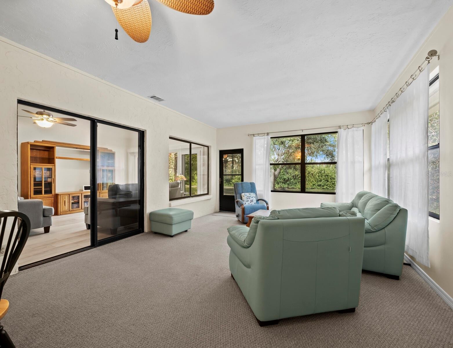 Incredible value for a 3 bedroom, 2 bath, 2 car garage, free standing home in a condominium community with beautiful nature panorama and a family of deer who live there. Awesome views from the the living room, Florida room and primary bedroom. The current owner enclosed and central air conditioned the lanai, giving the property 2000 sq ft of living space. Vaulted ceilings with rafters in the living room and luxury vinyl flooring throughout the property with the exception of the Florida room. Guest bedrooms are generously sized. One of the few homes with nature views from living areas.