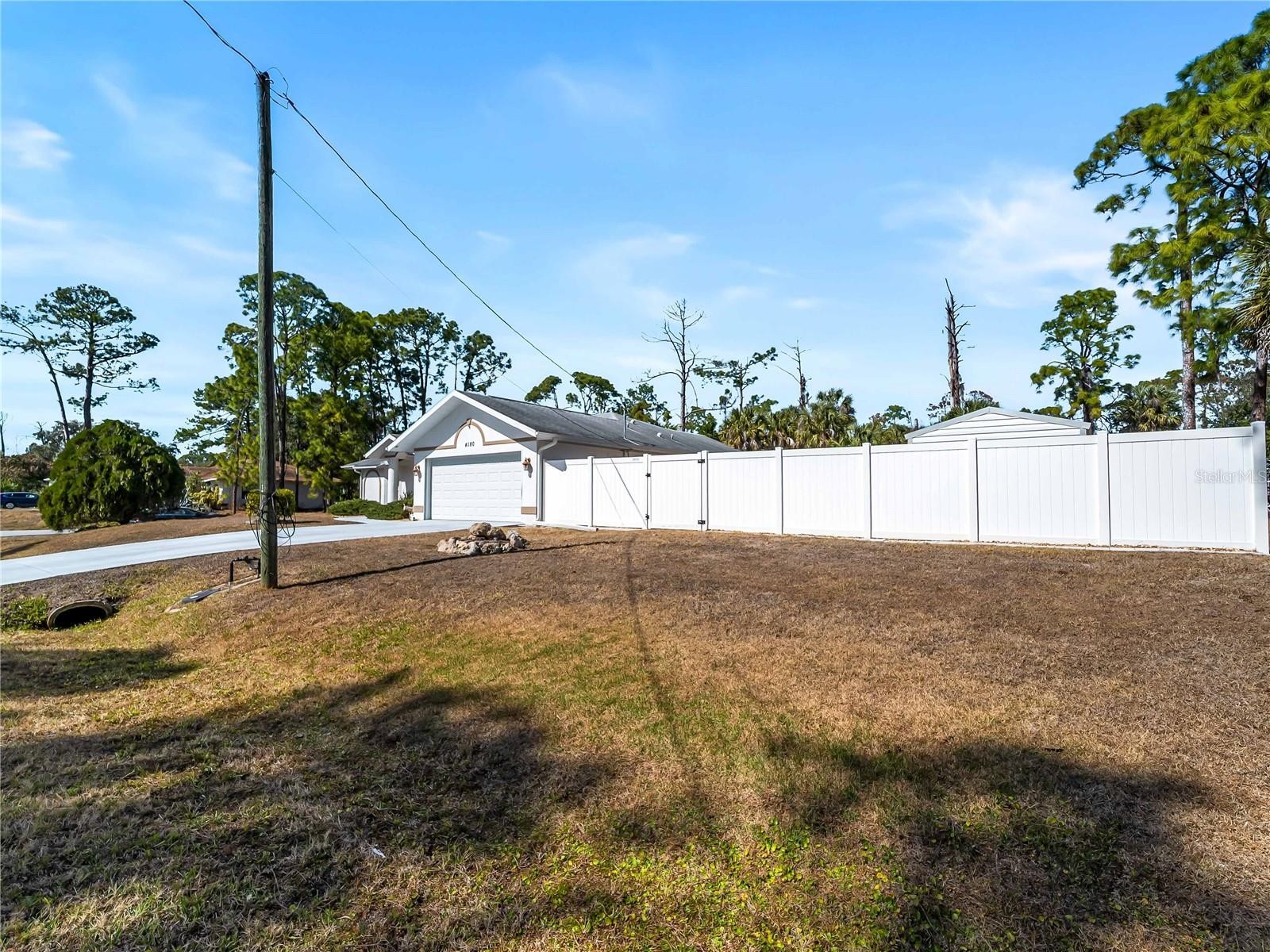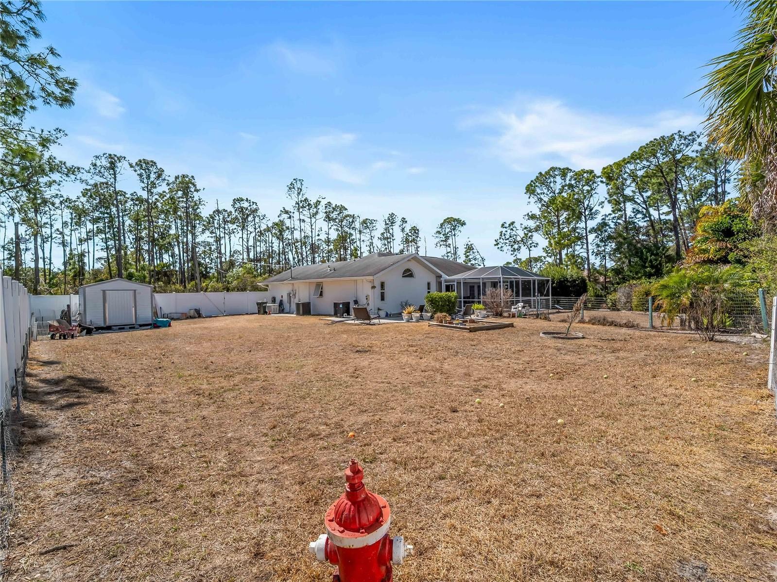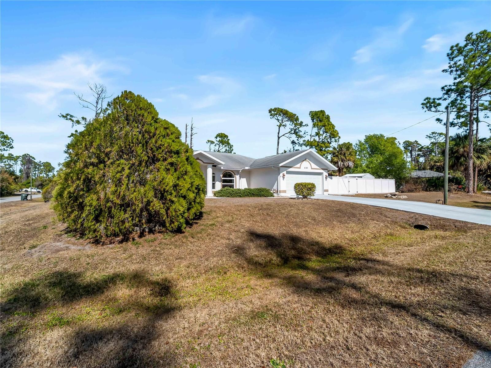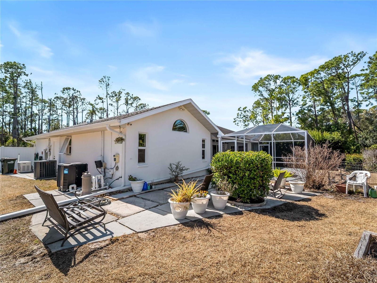 One or more photo(s) has been virtually staged. FLOOD INSURANCE NOT REQUIRED, WHOLE HOUSE GENERATOR — a well-maintained 3-bedroom, 2-bath residence with a 2-car garage, situated on an oversized corner homesite with city water service. This property offers exceptional outdoor space, including an additional half lot to the east and a buildable lot to the north, for a combined total of approximately 25,491 square feet. Mature landscaping provides privacy and a natural backdrop, while the screened patio and in-ground heated saltwater spa create an inviting outdoor living area. The home is equipped with impact windows and sliding doors, hurricane shutters, a hurricane-rated garage door, and a 16kW whole-house generator with automatic transfer switch. Additional updates include overhead plumbing, a poly septic tank replacement (2023), and a 2022 air conditioning system. Granite countertops, central vacuum, and added insulation contribute to everyday comfort and functionality. Located outside of currently designated Special Flood Hazard Areas according to publicly available flood maps (buyer to verify), this property offers space, improvements, and flexibility rarely found on a corner parcel of this size. All this AND a fenced back yard with a shed.