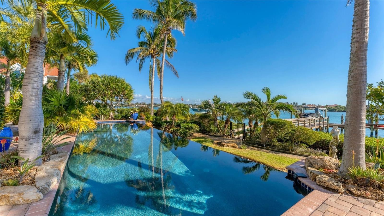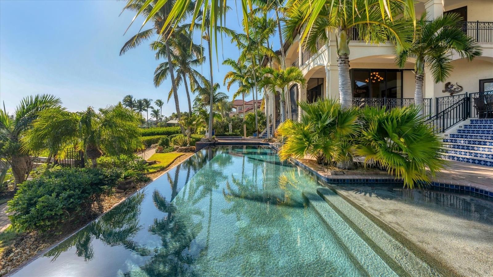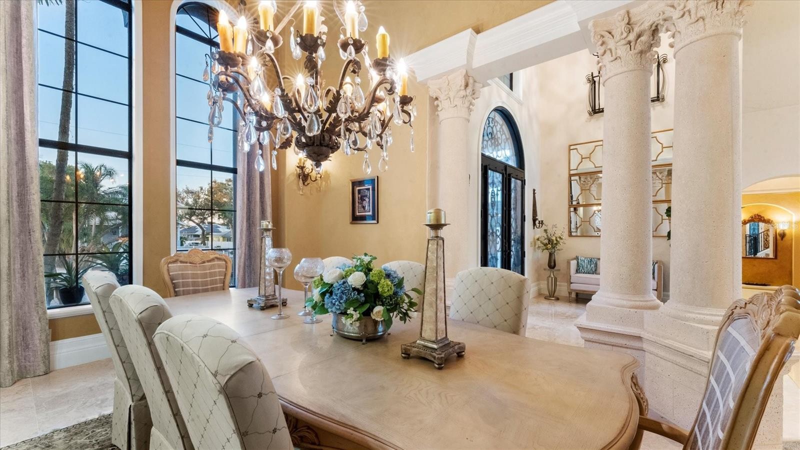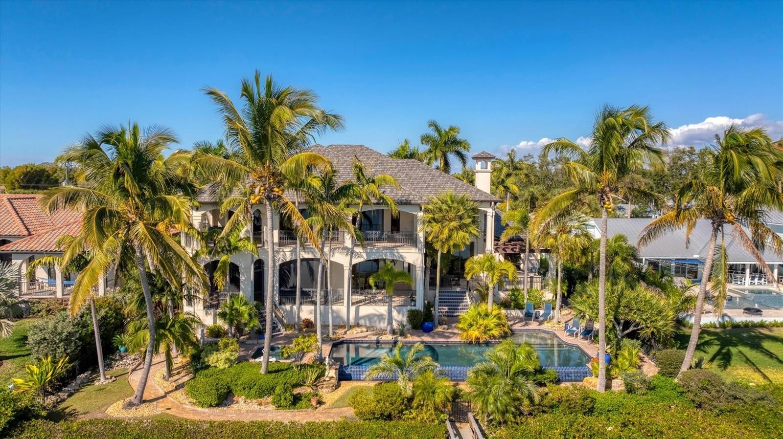 Set along the tranquil shores of Dona Bay, this John Cannon–designed residence exudes timeless sophistication and refined coastal living. Over 5,700 square feet of thoughtfully designed open-concept living space is enhanced by soaring 30 ft. ceilings, three fireplaces, a sweeping staircase, polished travertine floors throughout and beautiful Mediterranean architectural interests throughout. Formal and casual living areas unfold seamlessly, opening to multiple balconies, ideal for entertaining and relaxed waterfront living. The magnificent kitchen serves as the heart of the home, featuring exotic 2" blue Bahia granite counters, a large gas range, 2 dishwashers, 2 copper sinks, and wet bar with walk-in 1000 bottle wine cellar. The main floor also boasts two grand living areas with stunning water views, one of two primary suites, two guest bedrooms, 2 1/2 bathrooms and a butler pantry with laundry facilities. The elevator leads to the second floor where a dedicated game room, private office, and the magnificent primary suite serves as a private sanctuary, opening to a romantic terrace overlooking the bay. A closet fit for royalty also hosts a washer and dryer for convenience. The primary bathroom boasts a full room mirror, two large vanities, walk in shower and Roman tub. Outdoors, the home’s graceful lines lead to an infinity saltwater pool with a sun deck, spa, full bath with A/C, and resort-style entertainment area, all shaded by 92 palm trees. A bayfront walkway leads to the new Trex dock with a 10,000 lb lift, completing the experience. This is a 4-zone house, all units new, a new steel "EDCO" roof and two septic tanks with new floats and pumps. The extensive list of improvements is available in the attachments.