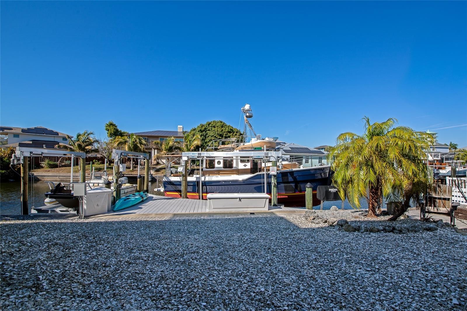 If you’ve been waiting for true deep water, no deed restrictions, and space for serious boats and RVs, this Riverdale property on the Manatee River delivers. Offering 2,534 sq ft of living area, the home features 3 bedrooms, a dedicated office, and 3 full baths, plus a half bath in the garage. No HOA. Out back, the waterfront is built for boaters who need real depth. The current owner keeps a deep draft Ranger Tug here. There’s a full length seawall, a newer dock with Trex decking, and two new remote control lifts rated at 20,000 lbs and 10,000 lbs. The rear paver deck provides plenty of room to entertain, along with a putting green and a lower level wood burning fire pit. The outdoor kitchen is commercial grade with welded aluminum framing, stainless doors and drawers, granite counters, a Blaze Professional grill with power burner, prep space, cooler, and generous storage. Inside, the redesigned island kitchen features custom hardwood cabinetry, a large built in seating area for eight, Wolf warming oven, Sub Zero refrigeration, built in microwave, deep sink, hidden spice pull outs, 3 hp disposal, and a large pantry. Storage is abundant throughout. The vaulted great room opens to a spacious second story deck with Trex flooring, metal ceiling, updated Hardie exterior finishes, and an additional built in Blaze skillet grill. The primary suite includes an updated bath with walk in shower. Downstairs offers flexible space with a bonus area, half kitchen, and movie room. It could function as guest quarters or be converted to a private apartment for additional income. The home features Hardie exterior construction, hurricane shutters, a new front entry, limestone accented landscaping, shelled yard for easy maintenance, and a large circular driveway. Both the shingle roof on the home and the metal roof over the garage are under five years old. The west side of the home is fenced and gated, large enough for a 40 foot RV with hookups and water. The east side also provides room for additional vehicles or trailers. The deep, insulated garage includes built in cabinetry, utility sink, walk up attic storage, ceiling beams for heavier projects, and RV power access. Updated, well maintained, and increasingly rare to find with this kind of water access and flexibility. Be sure to review the 3D tour through the virtual tour link to see how much this property truly offers.