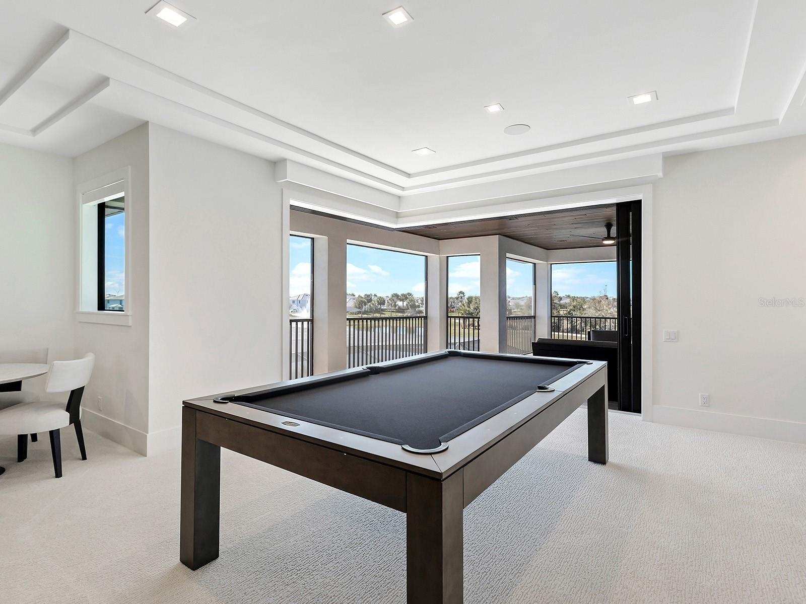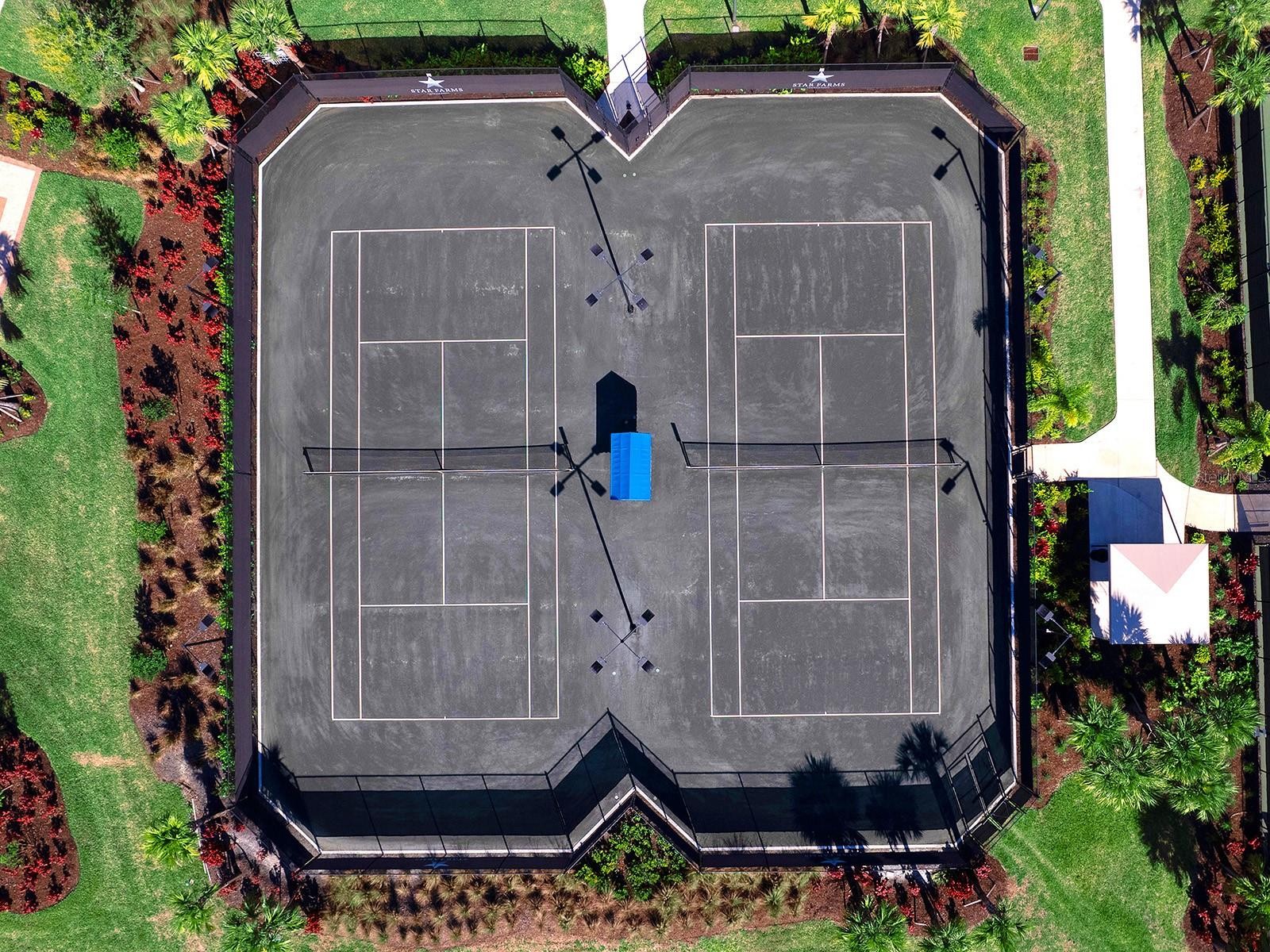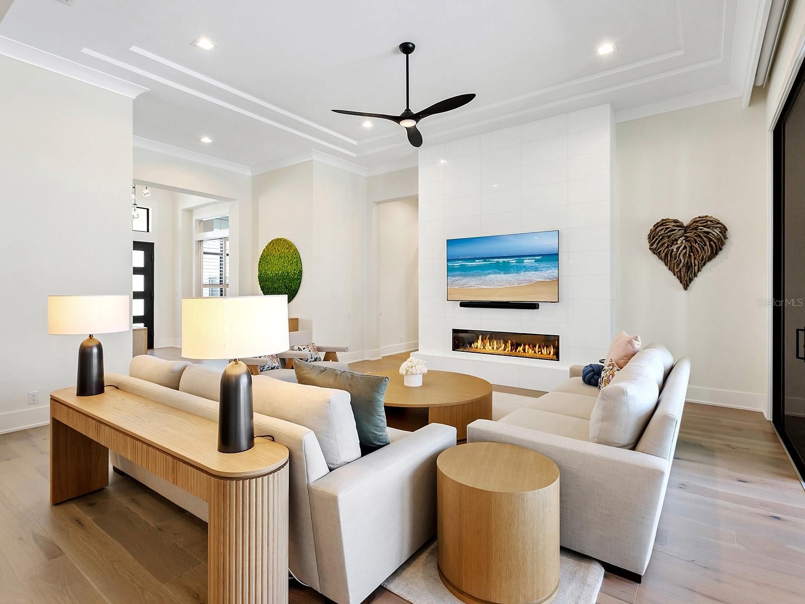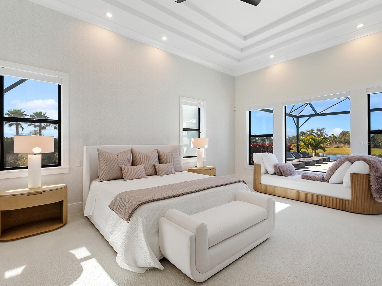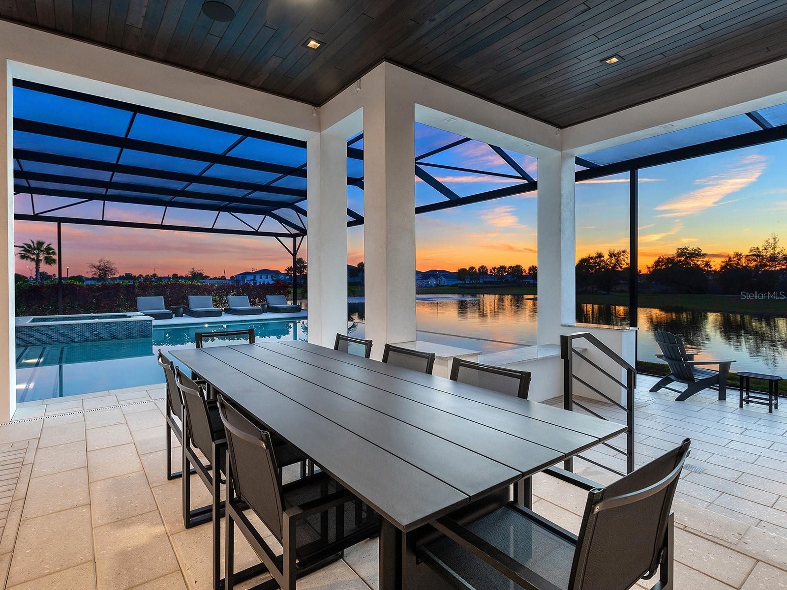 Positioned on a generous homesite within Star Farms, 4218 Butte Trail is a completely customized 2024 Arthur Rutenberg residence with breathtaking sunset, lake, and preserve views. Spanning approximately 6,488 square feet under air, offering 4 bedrooms, 5 full baths, and 2 half baths, thoughtfully designed for both everyday living and large-scale entertaining. Grand iron double-entry doors with frosted glass and soaring transom windows open to a light-filled foyer, flowing seamlessly into the great room, office, and formal dining room. The great room showcases a double tray ceiling, recessed lighting, a striking media wall with modern white tile and a linear fireplace, and walls of sliders opening to the pool and water beyond, while a dedicated gym with sauna, en-suite bath, and oversized windows creates a private wellness retreat. At the heart of the home, the chef’s kitchen features espresso ceiling beams, a large center island, KitchenCraft® cabinetry, powder-blue glass subway tile to the ceiling, and premium appliances including Sub-Zero refrigeration, Wolf double wall ovens, Wolf induction cooktop and hood, Cove dishwasher, and Wolf microwave, along with a Moen faucet and Blanco undermount sink. A spacious walk-in pantry offers custom shelving, generous counters, and a secondary café refrigerator, while reverse osmosis is conveniently located at the main kitchen sink. Nearby, the breakfast nook opens via zero-corner sliders to outdoor dining. The formal dining room connects to a glass-enclosed wine room and butler’s pantry with a wine cooler and glass-paneled cabinetry, while the private office impresses with soaring ceilings, statement chandeliers, plantation-shuttered windows, and frosted pocket sliders. The primary suite is a tranquil retreat with triple tray ceiling, five sunlit windows, custom walk-in closets (one with center island), and a spa-inspired bath featuring a freestanding Kallista soaking tub, dual vanities with makeup area, oversized glass shower with rainfall feature, steam capability, and private water closet. Upstairs, a wide staircase leads to two guest suites with en-suite baths and a large bonus room with a wet bar, refrigerated drawers, tray ceiling, zero-corner sliders, and sweeping lake and preserve views, opening to a covered terrace with tongue-and-groove ceiling and wood-look tile flooring. Outdoor living rivals a private resort with a screened lanai featuring tongue and groove ceilings, recessed lighting, dual ceiling fans, dining and lounge areas, an outdoor linear fireplace, a swim-up counter, and a fully equipped outdoor kitchen with a Wolf grill, sink, and refrigerator. The infinity-edge pool and spa are surrounded by expansive paver decking with multiple seating areas, a discreet dog run, and dedicated pool storage overlooking peaceful water views. Additional highlights include plantation shutters, Hunter Douglas remote shades, abundant storage, a whole-home generator, a whole-home water filtration & conditioning system, security cameras, a tankless water heater, epoxy-finished garages with separate two-car bays, overhead lighting, and wiring for four EV charging stations. Residents enjoy Star Farms’ resort-style amenity centers with pools, fitness facilities, pickleball and tennis courts, dog parks, and scenic walking paths. Star Farms is ideally located near world-class beaches, championship golf, premier medical facilities, and an array of shopping and dining.