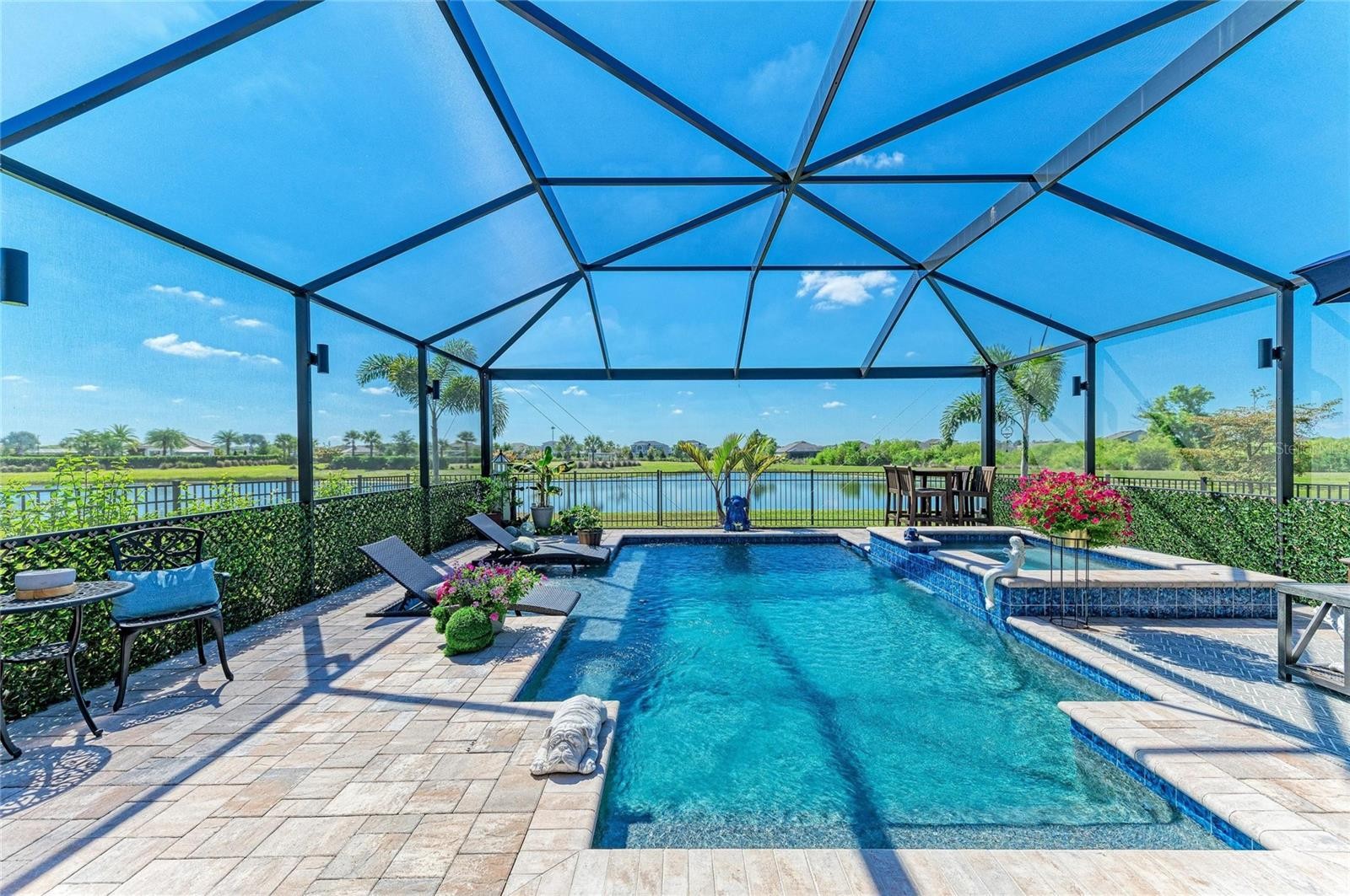 Welcome to your new oasis in Park East at Azario, one of the most sought-after sections of the award-winning Lakewood Ranch community! This stunning 3-bedroom, 2-bathroom residence was completed in 2024 and offers the perfect combination of contemporary design and peaceful living with a breathtaking water view that serves as your daily backdrop. As you enter, you will immediately notice the expansive, airy layout enhanced by ceiling fans in every room to keep the Florida breeze flowing year-round. The heart of the home is a chef-inspired kitchen featuring a massive center island and abundant storage, making it the ultimate hub for hosting friends and family. The inviting living area anchors the home with a cozy electric fireplace, creating a warm ambiance for quiet evenings. Step through the sliding glass doors to discover a true outdoor sanctuary. Your private, screened lanai features a sparkling pool and a fully equipped outdoor kitchen and grill, perfect for weekend barbecues and alfresco dining while watching the sunset over the water. The owner’s suite serves as a tranquil retreat, offering a spacious walk-in shower and dual sinks for a spa-like experience. The additional bedrooms are generously sized and perfectly situated for privacy. Living in Park East at Azario means enjoying an active lifestyle with access to a community pool, sand volleyball, basketball courts, and a multi-purpose sports field. Located within Lakewood Ranch, the nation’s top-selling multigenerational community, you are minutes away from premier golf courses, top-rated schools, and the vibrant shopping and dining at Waterside Place and Main Street. With quick access to I-75, University Town Center, and the world-class beaches of the Gulf Coast, this home puts you at the center of it all. Come see why this remarkable property is the perfect place to start your next chapter!