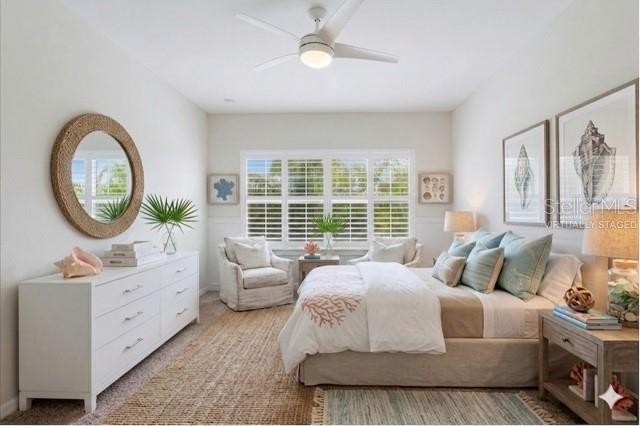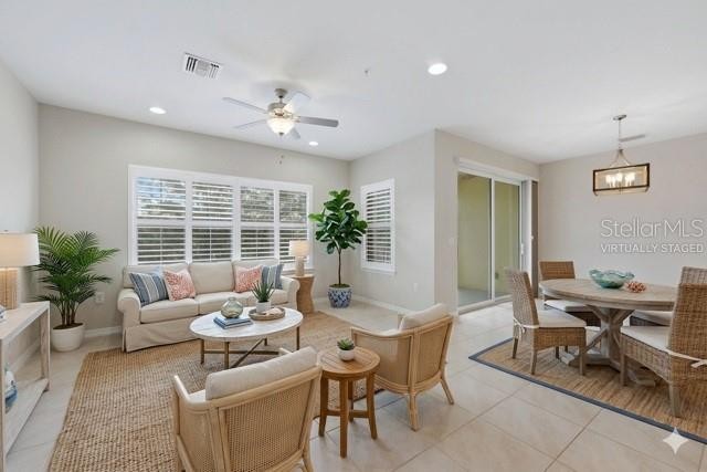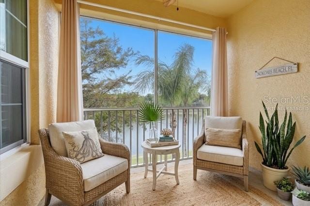 One or more photo(s) has been virtually staged. Spectacular water views from most windows in this immaculate, lightly used 3BR/2BA condo, built in 2018 and located in the gated community of Bay Street Villages. Some of the Photos are virtually staged. The popular Ibis floor plan offers an open-concept kitchen, dining, and great room with designer finishes, including white 42” cabinetry, light granite countertops, custom backsplash and stainless-steel appliances. Enjoy peaceful pond views with birds and wildlife from the screened lanai. Quality construction and peace of mind are provided by hurricane-impact windows and doors, concrete block construction, tile roof, and a paver driveway. The primary suite features plantation shutters, a custom ceiling fan with light, custom closet system, linen closet, lighted 10× makeup mirror, and a bidet-ready outlet. The second and third bedrooms also include custom ceiling fans and 2" blinds. The dining area is accented by a custom light fixture and accordion blinds on the balcony sliding doors. The balcony is enhanced with a tropical palm-leaf ceiling fan and outdoor curtains for added shade and comfort. The great room is fitted with plantation shutters for added elegance. A spacious laundry room includes a washer and dryer. Added features-Ring Doorbell, Keyless Entry on Front Door as well as an Exterior Garage door keypad. The monthly condo fee includes water, sewer, exterior and grounds maintenance, gated entry, heated resort-style pool, cabana, fitness center, and club room. No CDD fees. Ideally located near Nokomis Beach, Casey Key, Siesta Key Beach, the Legacy Trail, Sarasota and Venice dining and shopping, Oscar Scherer Park, and A-rated Pine View School. Maintenance-free Florida living at its best.