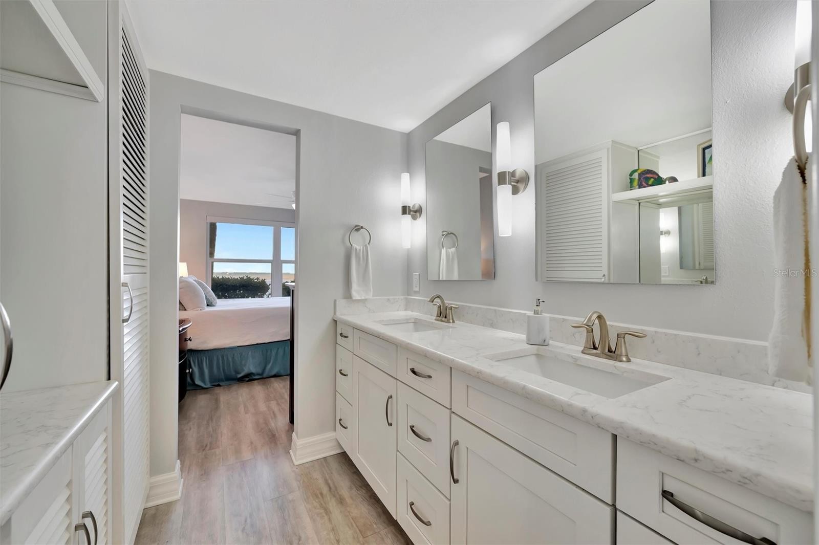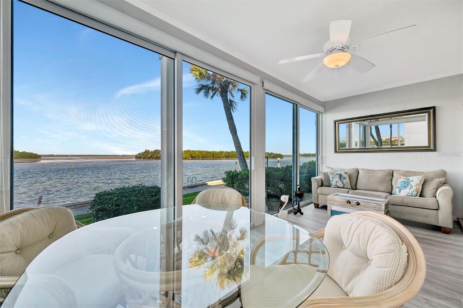 Experience exceptional bayfront living at 4310 Falmouth Drive, Unit 102, located in the sought-after Longboat Harbour community on Longboat Key—a premier coastal city and barrier island along Florida’s Gulf Coast, renowned for attracting year-round residents, second-home owners, seasonal residents, and visitors seeking a refined, upscale seaside lifestyle. This A-Building, direct bayfront residence captures full Sarasota Bay views from the kitchen, dining area, living room, enclosed lanai, and primary bedroom—offering a front-row seat to sunrise skies, passing boats, dolphins, manatees, eagles and all kinds of exciting wildlife just 40 feet from the tranquil water vistas. Thoughtfully updated, the home features luxury vinyl flooring, upscale LG quartz Viatera Rococo countertops in the kitchen and both bathrooms, and soft-close drawers and custom cabinetry throughout. The spacious primary suite includes double vanities and a beautifully updated walk-in shower, while the guest bath also offers a walk-in shower with quartz finishes. Significant capital improvements provide peace of mind, including new hurricane-rated windows and sliders (2024, Cat5), HVAC (2021) with approximately 8 years remaining on a 12-year warranty, and a water heater (2023). The enclosed lanai expands usable living space while maintaining sweeping Sarasota Bay views. Offered fully furnished for a seamless, move-in-ready bayfront lifestyle. Longboat Harbour is a gated, resort-style community offering an impressive array of amenities, including four heated pools, tennis and pickleball courts with active player groups, fitness center, sauna, meeting rooms, billiards, putting green, woodworking shop, kayak storage, shuffleboard, locker rooms, fishing piers, two community grills, on-site management, and a protected harbor. Boat slips are available to members of the Longboat Harbour Yacht Club (subject to availability). Enjoy the best of island living with private deeded beach access just a short walk or drive across the street—complete with seating, chair storage, cabana, restrooms, indoor and outdoor showers, parking, and a convenient car-wash area. Additional features in the condo include washer and dryer connections in a hall closet and assigned covered carport parking with abundant guest spaces nearby. In the living room, open the sliders to seamlessly expand your indoor–outdoor living space, or keep them closed and enjoy the patio as an enclosed lanai—then open the glass sliders to let in refreshing coastal breezes and salt air. Located just 7.5 miles north of St. Armands Circle, and a short drive to downtown Sarasota’s Arts District, world-class dining and shopping, with Sarasota-Bradenton International Airport nearby. Direct Sarasota Bay views and private deeded Gulf beach access make this exceptional residence the ultimate Longboat Key lifestyle opportunity.