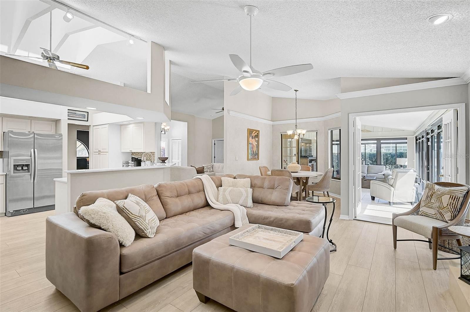 Gorgeous, Model-Perfect 3BR/2BA plus Den home on a Private Corner Lot! Step into this stunning home offering 2,512 square feet of beautifully designed living space. The entry welcomes you with a striking wood beam ceiling, adding warmth and architectural interest, creating a grand first impression. Situated on a quiet corner lot, the private backyard includes a paver courtyard, organic garden, and plenty of space for a pool—ideal for entertaining or relaxing in style. Inside, engineered wood floors flow throughout, creating warmth and elegance. The primary suite is a serene retreat with dual walk-in closets and a spa-like bathroom featuring dual sinks, a soaking tub, and a separate shower. High ceilings enhance the open, airy feel throughout the home. The enclosed lanai, accessed through three sets of French hurricane doors, features hurricane-protected windows and a new split A/C unit for year-round comfort. The kitchen is bright and inviting with new skylights (2024), a tile backsplash, new dishwasher, and a Culligan reverse osmosis system under the sink. Recent upgrades also include a new roof (2024), new hot water heater, new washer and dryer, and new garbage disposal, making this home completely move-in ready. Additional features include a Hydrawise irrigation that is Wi-Fi accessible, a water softener, and a cozy wood-burning fireplace in the living area. Peridia offers an active lifestyle with an executive 18-hole golf course, tennis, pickleball, heated pool, tiki bar, restaurant & bar, and pro shop. Ideally located, this home is close to shopping, airports, restaurants, and some of the best beaches in Florida, offering both convenience and lifestyle. Additional Fees: $877 quarterly master association fee, $450 annual food/beverage minimum, $100 one-time application fee, $4,000 one-time capital reserve.