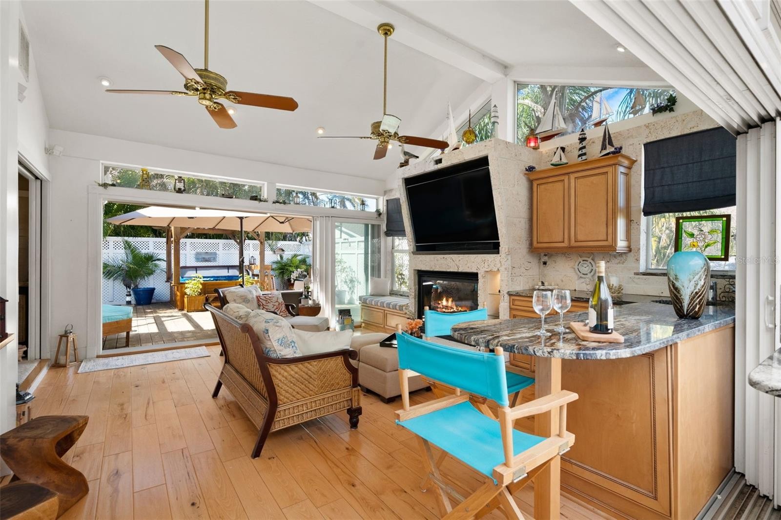 Welcome to an exceptional Snead Island residence where thoughtful design, luxury upgrades, and unmatched entertaining space come together seamlessly. This recently updated 3-bedroom, 3.5-bath home offers the perfect blend of coastal charm and modern convenience, featuring a stunning Rock Palm Garden and timeless Key West coral stone walls that anchor the living room with warmth and character. Step inside to a spacious gathering room that opens beautifully to both sides of the home’s expansive outdoor living areas. A bright and inviting sunroom provides year-round enjoyment, while the private mother-in-law suite/game room adds incredible flexibility and is equipped with a macerator system, bar pump, and bar area, making it ideal for guests or multi-generational living. Designed for entertaining, the outdoor space is truly unmatched with over 1,300 square feet of raised wraparound decking, allowing effortless guest access throughout. Enjoy the fully equipped outdoor kitchen with stone flooring, hot tub, gazebo, bar, and an exterior wood-burning fireplace—your own private resort-style retreat. Inside, premium features include Bose surround sound, dimmer lighting in key living spaces, invisible countertop outlets, and even a hidden TV in the bonus room. The kitchen is enhanced by an oversized range hood and upscale finishes perfect for hosting. This home is packed with smart and storm-ready upgrades, including: New roof -lifetime warranty - transferable (130 mph rated)-Full-house generator-New siding and new front/rear stairs-Garden room with all hurricane glass-3M impact-resistant film on remaining windows-Insulated garage doors with A/C in the garage-700 sq ft of additional covered storage-Gutters, privacy fence, and complete exterior garden lighting-Modern comfort continues with a commercial-size water softener, under-counter drinking water system, and twin tankless hot water heaters. The automatic irrigation system offers Bluetooth accessibility, with irrigation water included in the HOA fees. Security and peace of mind are provided by the Vivint home monitoring system. Every inch of this property reflects an owner who truly thought of everything—creating a rare Snead Island opportunity built for comfort, style, and unforgettable gatherings. Its central location offers unparalleled convenience with seamless access to I-275 and I-75, facilitating effortless commutes to both St. Petersburg/Tampa and Bradenton/Sarasota. Furthermore, the property is minutes to Emerson Point Preserve, a hidden gem in southwest Florida that has several walking trails, spots to launch a kayak or canoes, a small beach at the tip of the point with views of DeSoto National Monument, Anna Maria Island and the Bridge to St. Petersburg. Also, close proximity to the airport, a plethora of dining establishments, and upscale shopping destinations. Additionally, the pristine Gulf beaches are a mere stone's throw away!