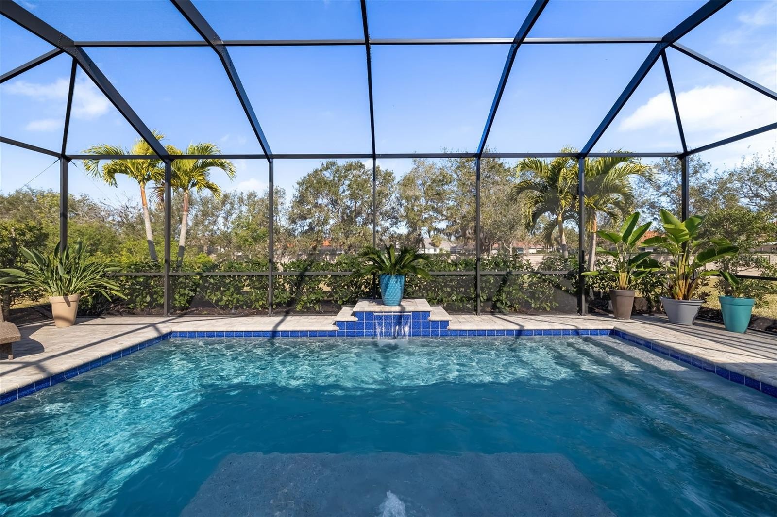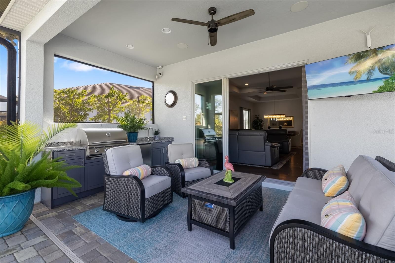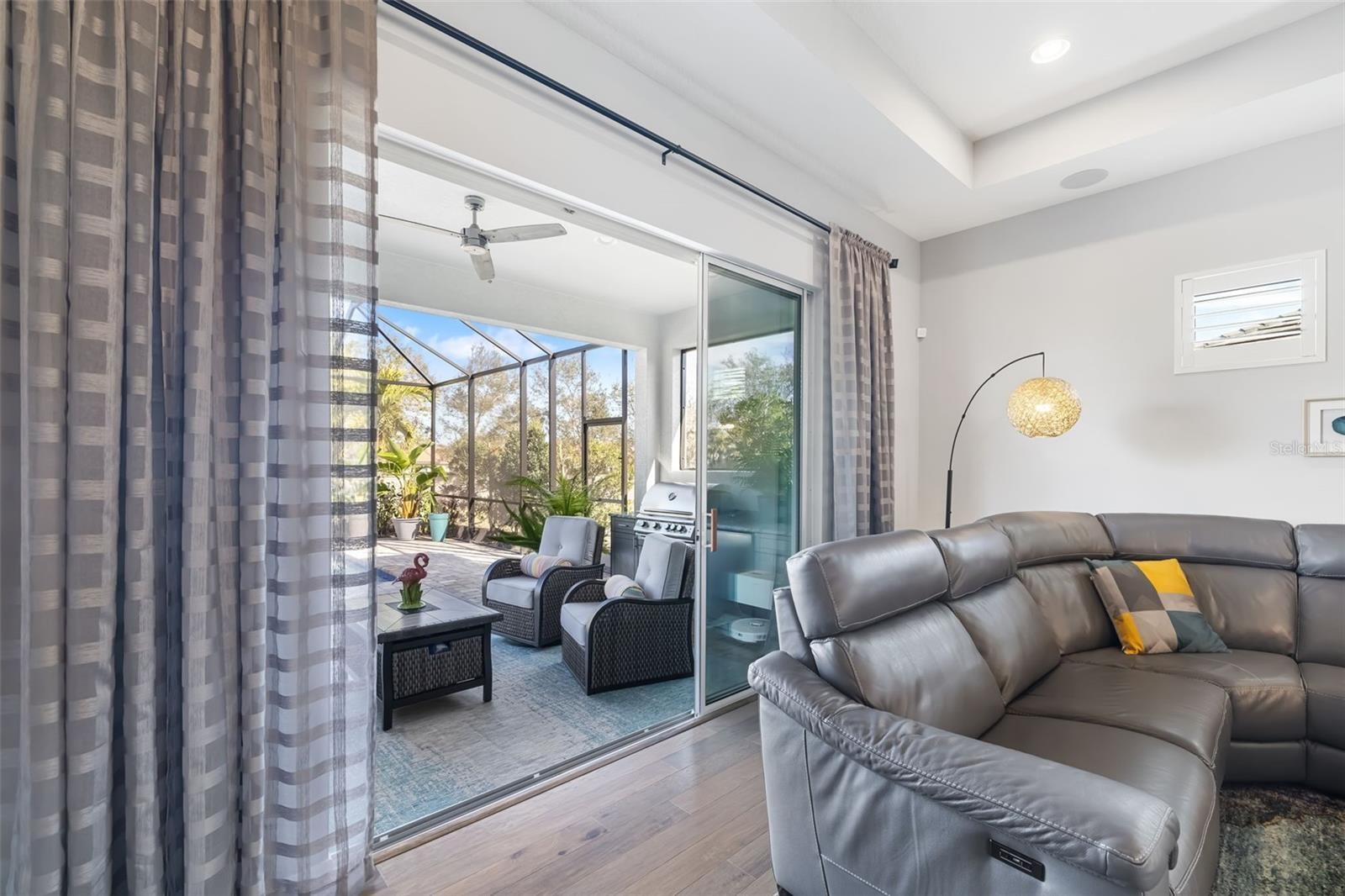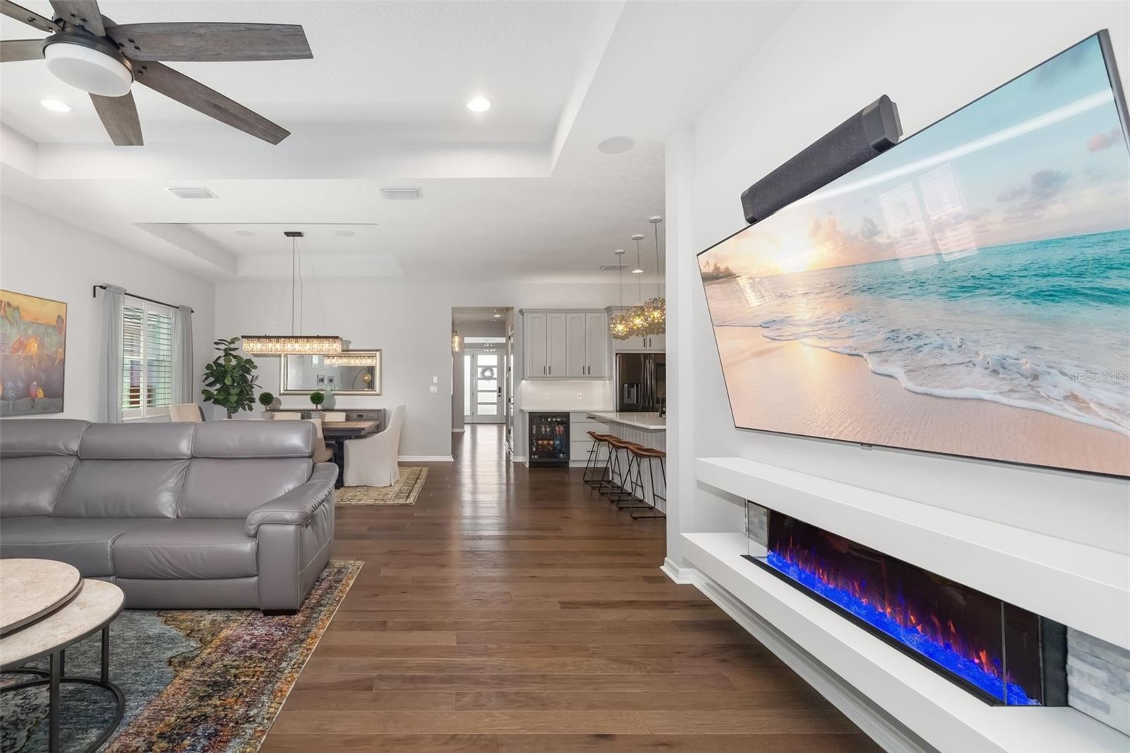 This stunning 2021-built single-story pool home is in an exclusive gated enclave of 30 residences, offering maintenance-free lawn care with low HOA fees and no CDD. Perfectly positioned on a private 0.36-acre cul-de-sac lot with no rear neighbors, this meticulously maintained four-bedroom, 2.5-bath home delivers the ideal blend of luxury, comfort and modern convenience. Inside, an open-concept design showcases soaring tray ceilings, recessed LED lighting and rich hardwood flooring throughout. The great room serves as a striking focal point, featuring a sleek electric fireplace with customizable lighting and a built-in surround sound system, with integrated speakers extending throughout the home and lanai for seamless indoor-outdoor living. Expansive triple sliding glass doors open to the screened lanai, creating an effortless connection to the outdoor space. The gourmet kitchen is both elegant and functional, featuring upgraded soft-close cabinetry, quartz countertops, a designer tile backsplash, and a spacious center island with counter-height seating and custom pendant lighting. A stylish dry bar with a beverage refrigerator enhances the space, while premium Samsung smart black stainless-steel appliances, including a gas cooktop with a vented hood, a built-in convection wall oven with a Flex Duo divider and a steam cooking and convection microwave, complete this chef-inspired kitchen. The private primary suite offers a peaceful retreat with an 11-foot tray ceiling, plantation shutters and two custom walk-in closets. The spa-like en-suite bath features a dual quartz vanity, an expansive double walk-in shower with frameless glass, and modern matte black fixtures. Secondary bedrooms are generously sized, each with 10-foot ceilings, plantation shutters, ceiling fans and in-ceiling speakers with individual controls. A well-appointed laundry room includes custom cabinetry, quartz countertops, a deep utility sink and a subway tile backsplash. Outdoor living is exceptional, featuring a covered and screened lanai with paver decking that opens to a heated saltwater pool, complete with a sun shelf, color-changing LED lighting, a waterfall and a bubbling fountain, all conveniently controlled from your smartphone. The custom summer kitchen is ideal for entertaining, offering marine-grade cabinetry, granite countertops, a gas grill, sink and a beverage refrigerator. Additional upgrades include smart home technology with a Ring doorbell and security, keyless entry, and Z-wave lighting; a two-car garage with epoxy flooring, built-in storage and an EV charging outlet; a whole-house water softener; and a tankless gas water heater. With HOA services covering lawn care, irrigation, cable, and high-speed internet, this home offers an effortless, luxury lifestyle. Don’t miss the opportunity to own this exceptional, like-new residence.