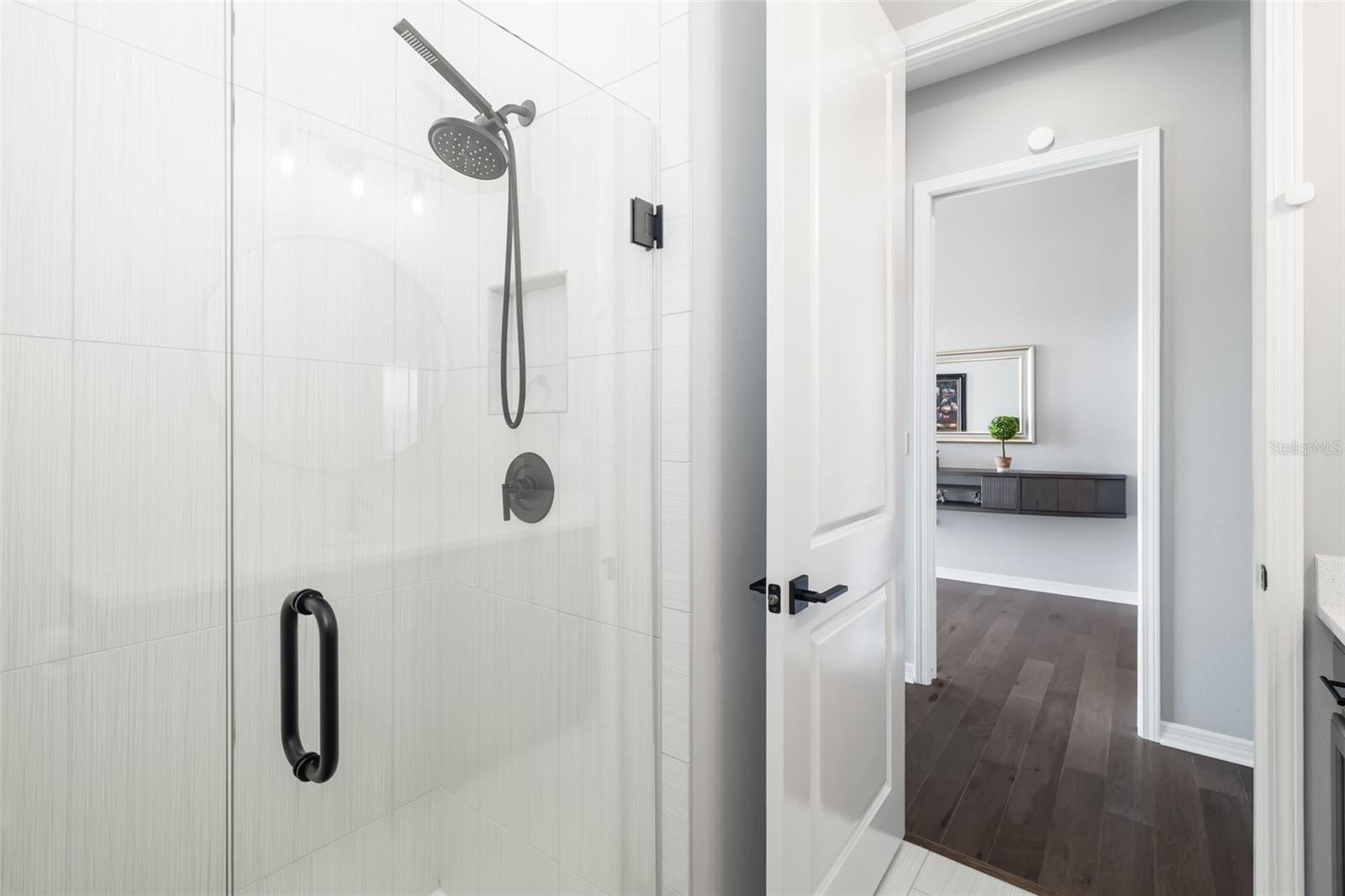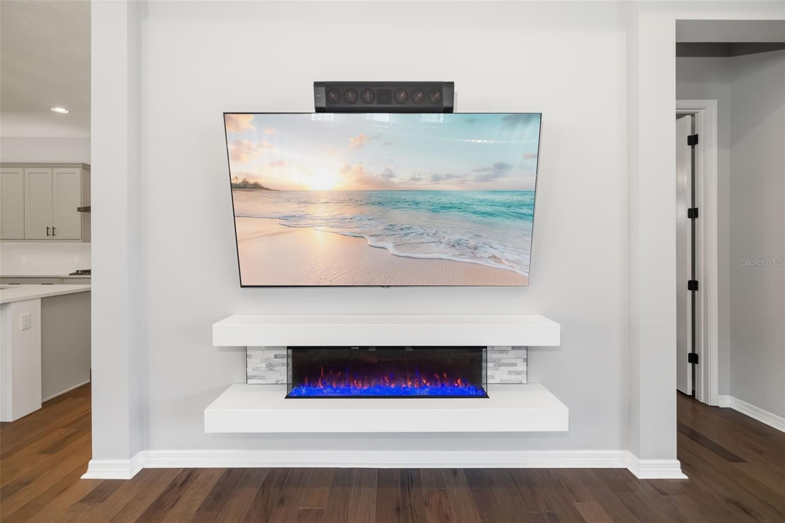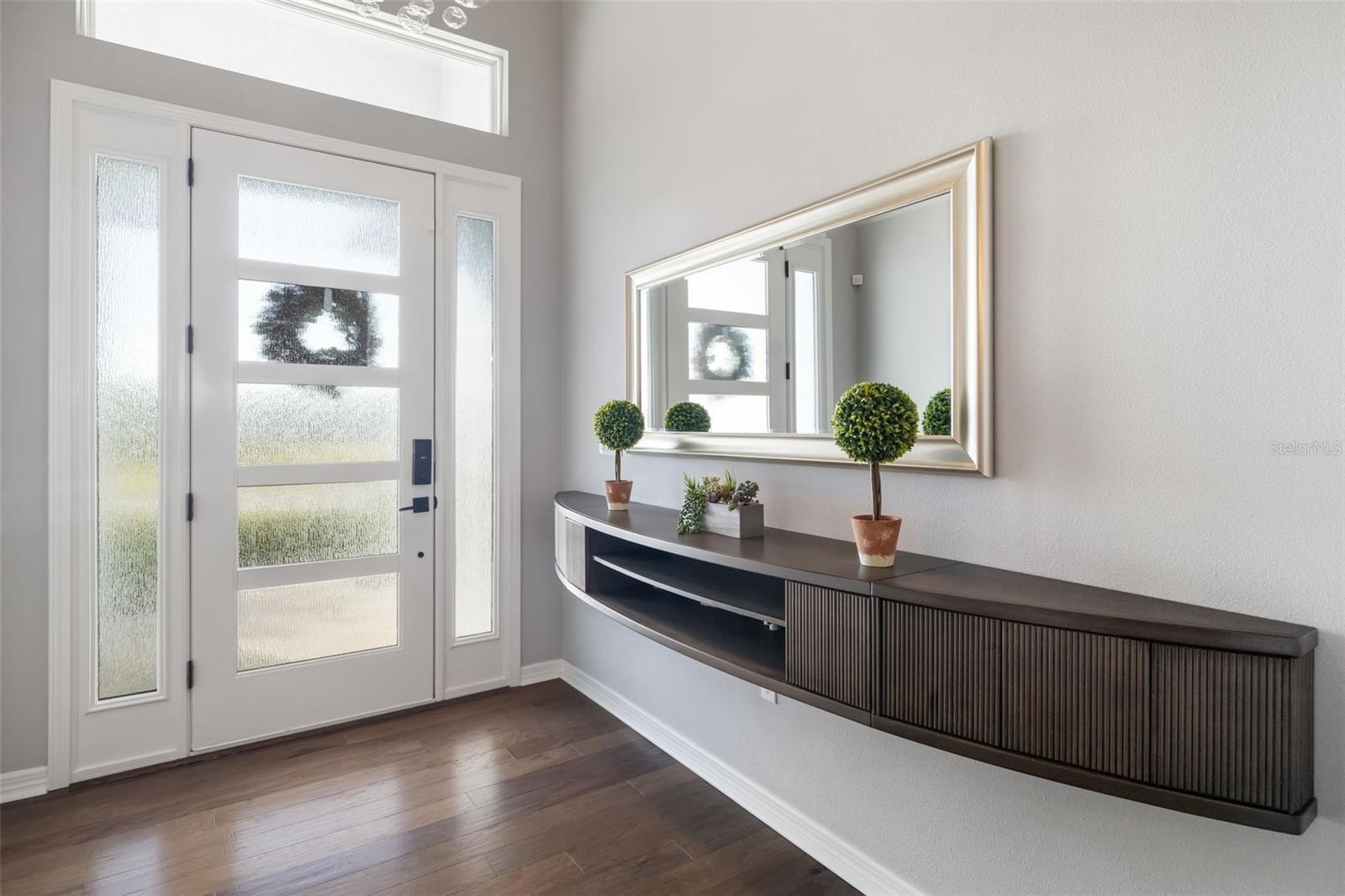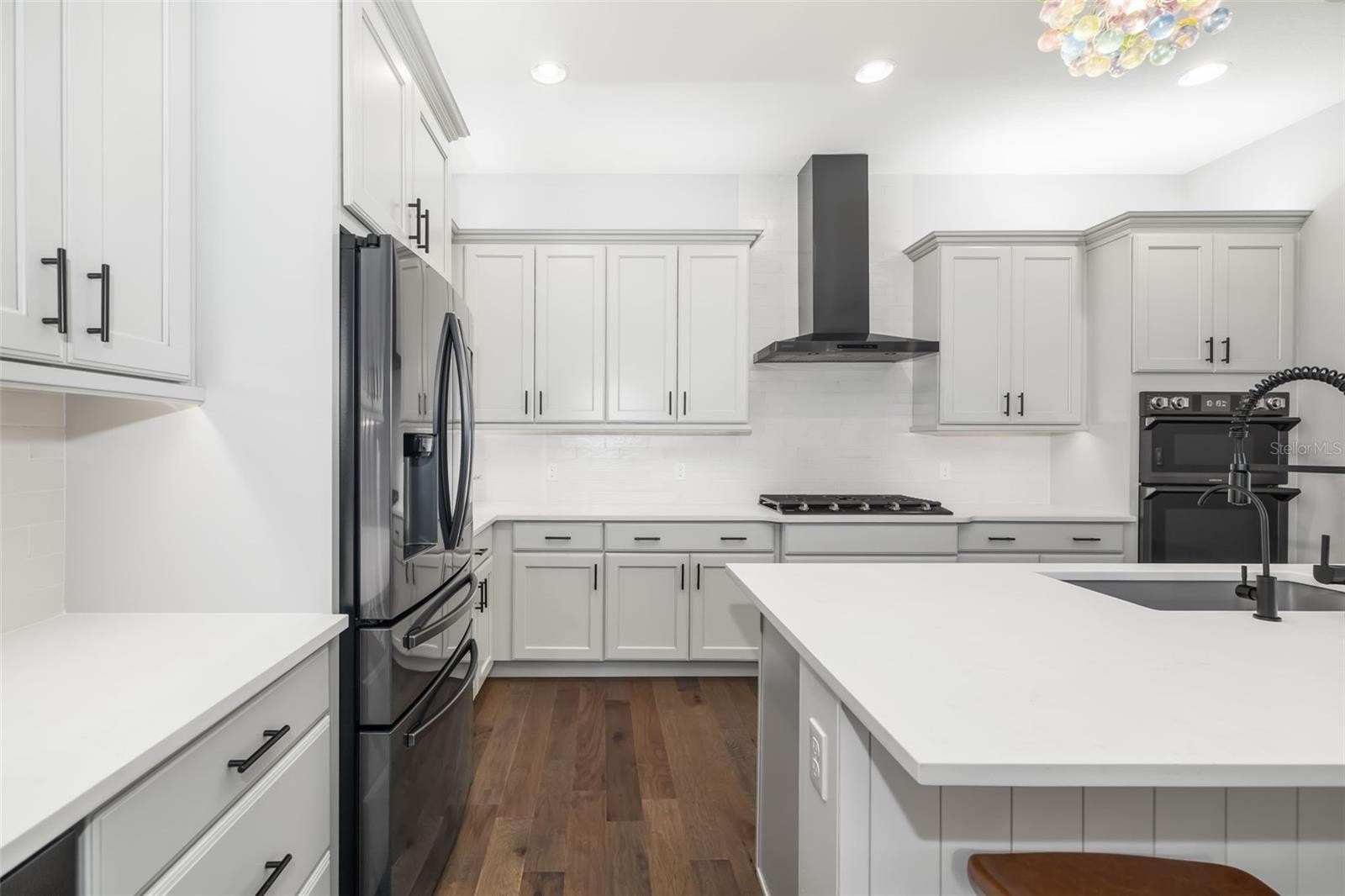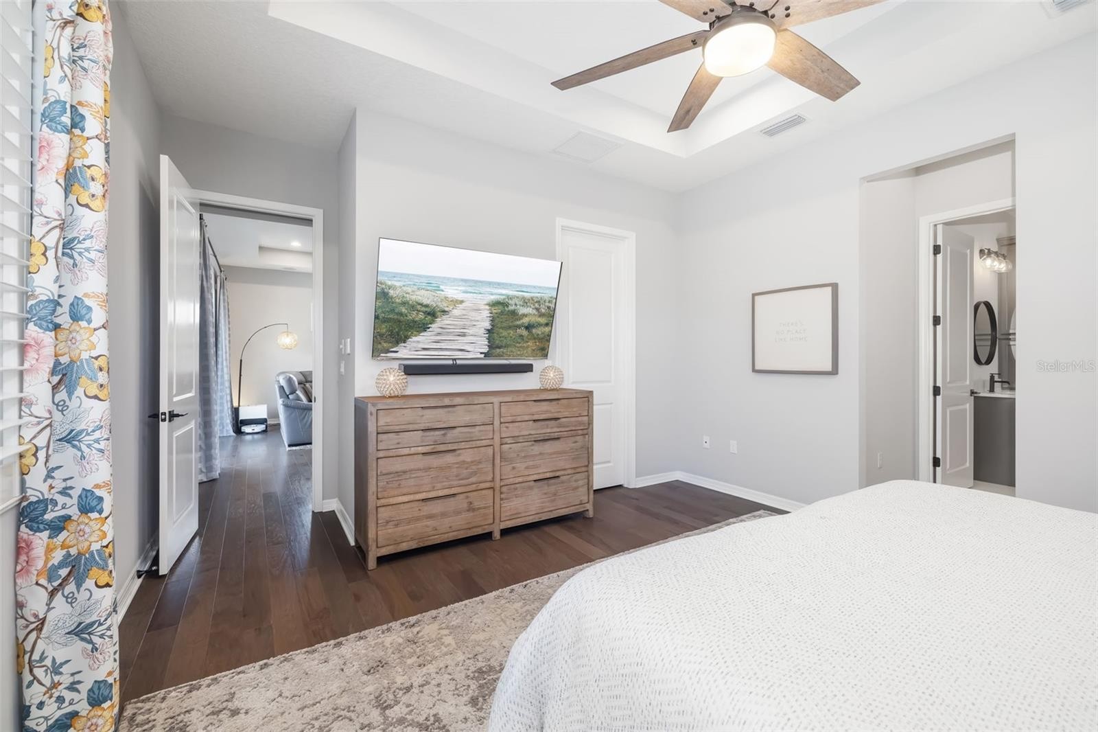 This stunning 2021-built single-story pool home is in an exclusive gated enclave of 30 residences, offering maintenance-free lawn care with low HOA fees and no CDD. Perfectly positioned on a private 0.36-acre cul-de-sac lot with no rear neighbors, this meticulously maintained four-bedroom, 2.5-bath home delivers the ideal blend of luxury, comfort and modern convenience. Inside, an open-concept design showcases soaring tray ceilings, recessed LED lighting and rich hardwood flooring throughout. The great room serves as a striking focal point, featuring a sleek electric fireplace with customizable lighting and a built-in surround sound system, with integrated speakers extending throughout the home and lanai for seamless indoor-outdoor living. Expansive triple sliding glass doors open to the screened lanai, creating an effortless connection to the outdoor space. The gourmet kitchen is both elegant and functional, featuring upgraded soft-close cabinetry, quartz countertops, a designer tile backsplash, and a spacious center island with counter-height seating and custom pendant lighting. A stylish dry bar with a beverage refrigerator enhances the space, while premium Samsung smart black stainless-steel appliances, including a gas cooktop with a vented hood, a built-in convection wall oven with a Flex Duo divider and a steam cooking and convection microwave, complete this chef-inspired kitchen. The private primary suite offers a peaceful retreat with an 11-foot tray ceiling, plantation shutters and two custom walk-in closets. The spa-like en-suite bath features a dual quartz vanity, an expansive double walk-in shower with frameless glass, and modern matte black fixtures. Secondary bedrooms are generously sized, each with 10-foot ceilings, plantation shutters, ceiling fans and in-ceiling speakers with individual controls. A well-appointed laundry room includes custom cabinetry, quartz countertops, a deep utility sink and a subway tile backsplash. Outdoor living is exceptional, featuring a covered and screened lanai with paver decking that opens to a heated saltwater pool, complete with a sun shelf, color-changing LED lighting, a waterfall and a bubbling fountain, all conveniently controlled from your smartphone. The custom summer kitchen is ideal for entertaining, offering marine-grade cabinetry, granite countertops, a gas grill, sink and a beverage refrigerator. Additional upgrades include smart home technology with a Ring doorbell and security, keyless entry, and Z-wave lighting; a two-car garage with epoxy flooring, built-in storage and an EV charging outlet; a whole-house water softener; and a tankless gas water heater. With HOA services covering lawn care, irrigation, cable, and high-speed internet, this home offers an effortless, luxury lifestyle. Don’t miss the opportunity to own this exceptional, like-new residence.
