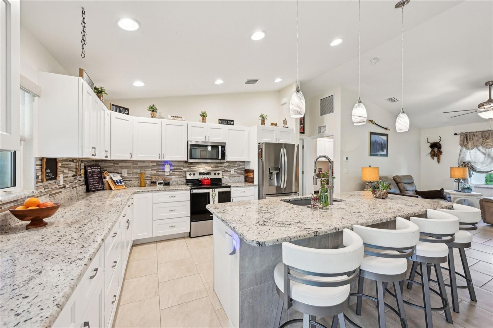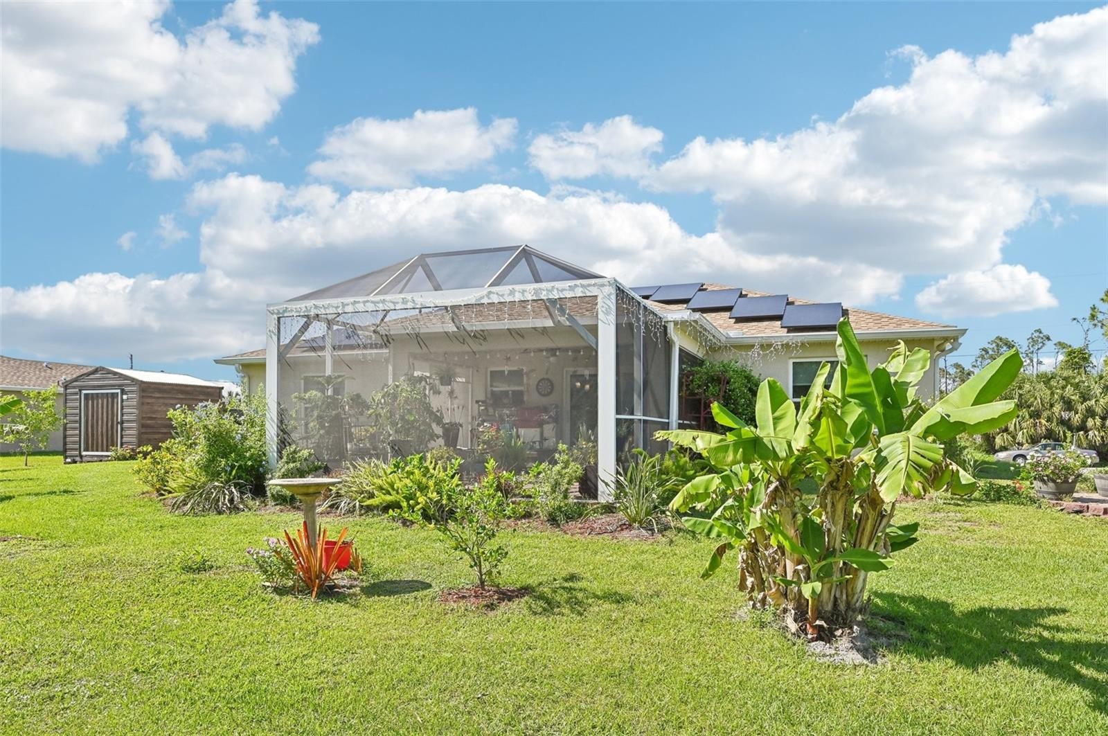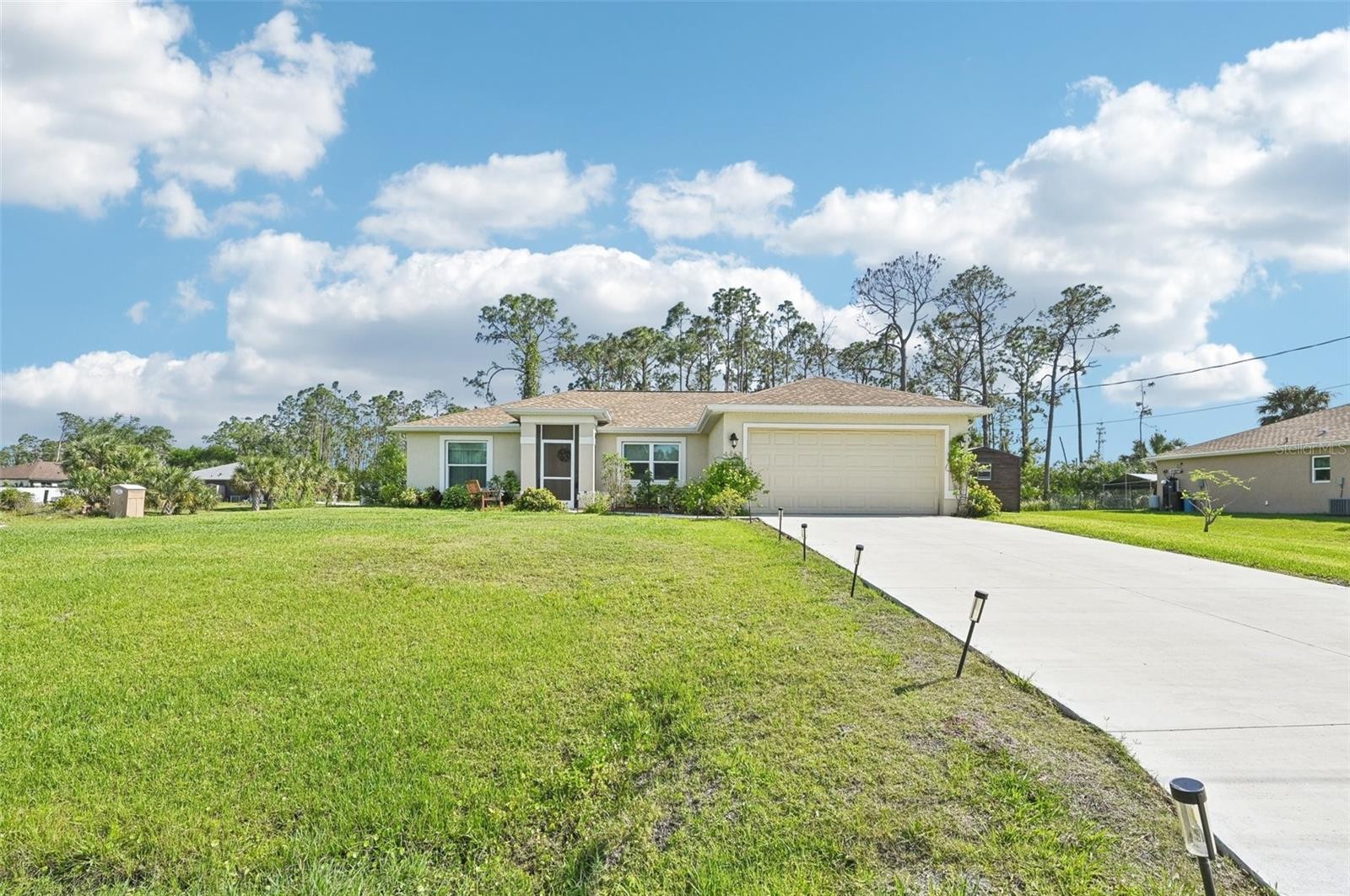 Welcome to this beautifully built 2022 home, situated on a desirable corner lot. This well-designed 3-bedroom, 2-bathroom home features a split floor plan and tile flooring throughout. The stylish kitchen stands out with granite countertops, a tile backsplash, stainless steel appliances, a center island with sink, and ample cabinet space. You’ll love the vaulted ceilings and modern recessed lighting, which create a bright and welcoming atmosphere. This energy-efficient home is equipped with impact windows, solar panels, and a water softener system. The spacious primary suite includes double sinks, a walk-in shower, and generous closet space. Step outside to enjoy the extended screened-in lanai—ideal for relaxing or hosting guests. A backyard storage shed provides additional space, and the two-car garage completes the package. With a nearly new build and ready-to-move-in appeal, this home checks all the right boxes.