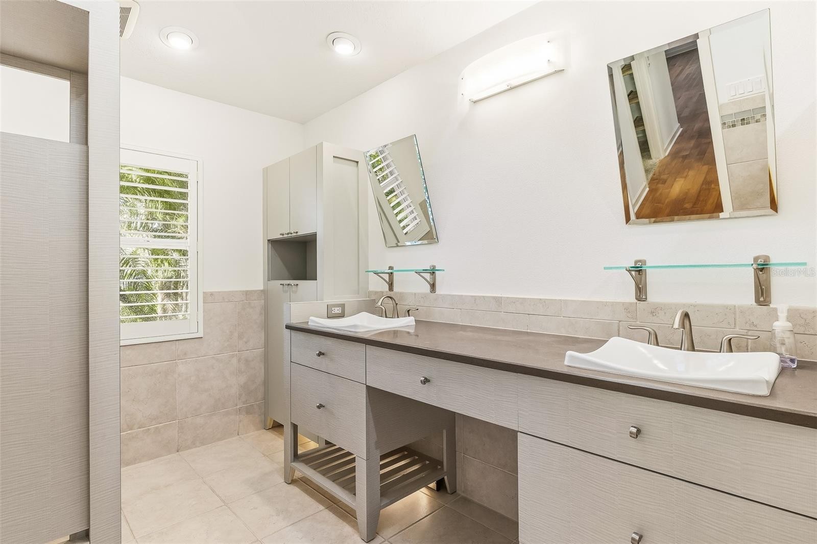 One or more photo(s) has been virtually staged. Discover this stunning three-bedroom, two-and-a-half-bath home nestled on a quiet street in the sought-after Sherwood Forest community. Set on a spacious, beautifully treed lakefront lot, this residence combines serene natural surroundings with elegant modern living. Step inside to find neutral-toned engineered hardwood floors flowing throughout the home, complemented by custom cabinetry and built-ins thoughtfully placed in several rooms. At the heart of the living space, a double-sided gas fireplace set in striking Coral Stone creates a warm and inviting ambiance. The upgraded kitchen features premium Bosch and Samsung appliances, abundant storage, and a charming built-in seat bench and table for casual dining. The luxurious primary suite offers his-and-hers walk-in closets and a spa-inspired bathroom with double sinks and generous storage solutions. Outdoor living is equally impressive, featuring a fully equipped outdoor kitchen with a custom granite bar, cable TV, and a Sonos sound system that extends through the family room, primary bedroom, and lanai—perfect for entertaining or relaxing lakeside. Hurricane Shutters for some of the windows in the home. Roof replaced in 2018. Gorgeous landscaping with Sand Oak Trees, irrigation to keep your St. Augustine lawn pristine. Paver pool area, driveway and walkways. Great central location in town! Not many communities have the larger lots, majestic oaks and winding roads that Sherwood Forest exudes. Enjoy shopping, dining, beaches, the arts and so much more that Sarasota has to offer. A rare opportunity to own a refined home blending comfort, craftsmanship, and lakefront tranquility.